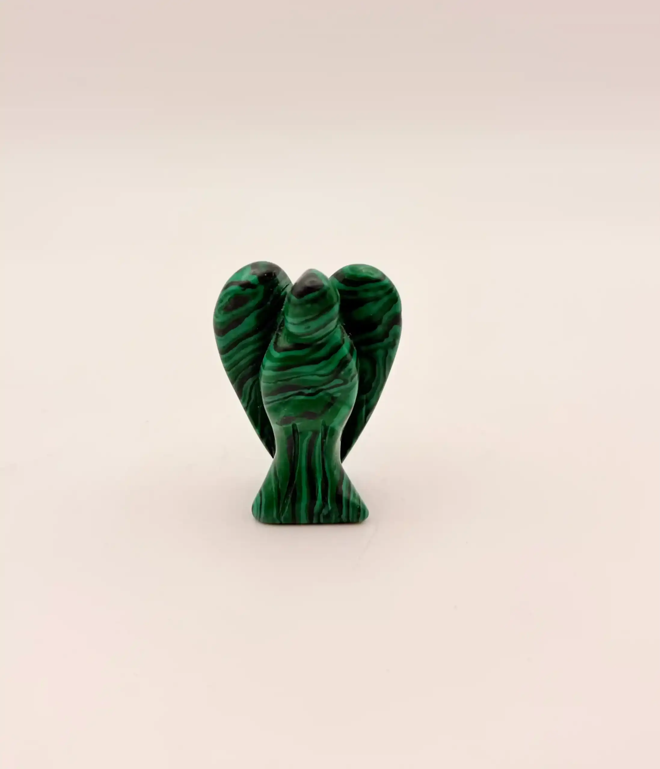 La combinación del ángel y la malaquita es la protección contra energías negativas y la transformación personal, especialmente en el ámbito emocional y espiritual. La malaquita es vista como un escudo protector que absorbe lo negativo, mientras que la conexión con el «ángel» o la fuerza superior refuerza la fe, la guía y el crecimiento espiritual para afrontar cambios de manera más segura.