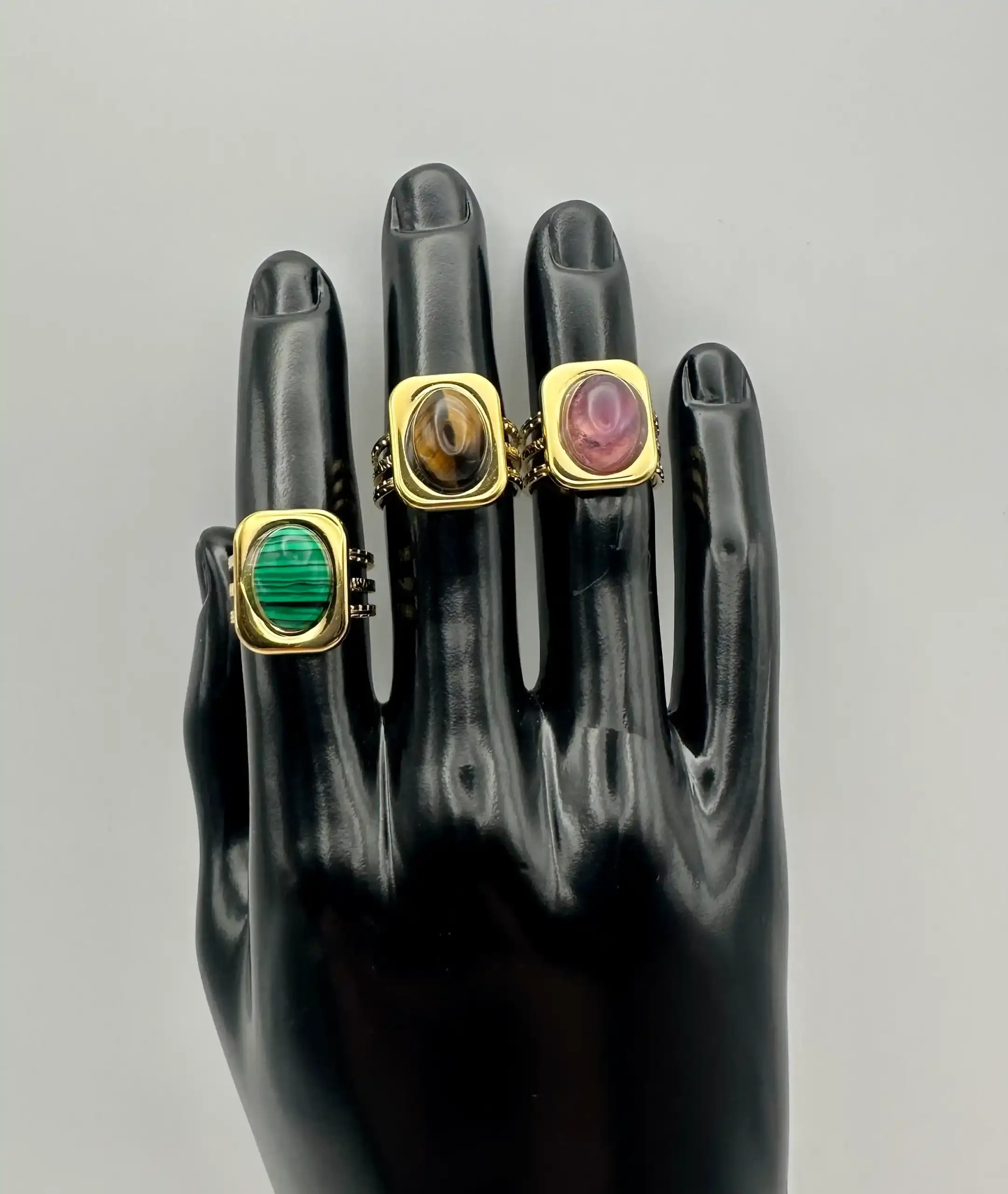 La malaquita protege contra energías negativas, transforma y purifica el aura. El ojo de tigre proporciona coraje, confianza y protección contra el mal de ojo. La amatista es conocida por sus propiedades curativas y protectoras contra las energías negativas.