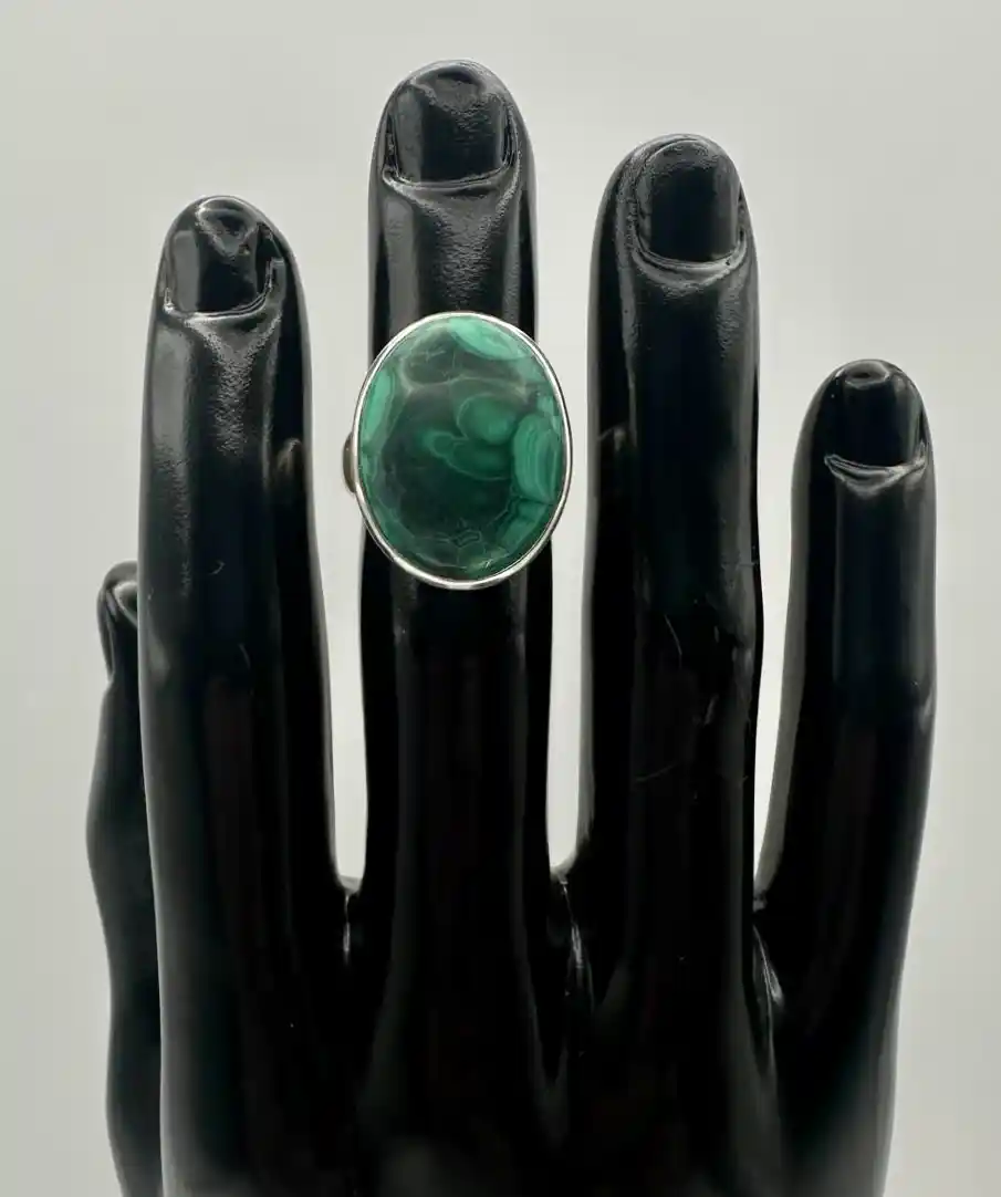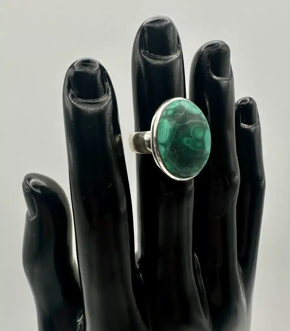 La malaquita absorbe energías negativas, ayuda al equilibrio emocional y reduce de estrés. Físicamente, se asocia con el alivio de dolores musculares, menstruales y de cabeza, y con el apoyo al sistema inmunológico. Anillo Regulable.