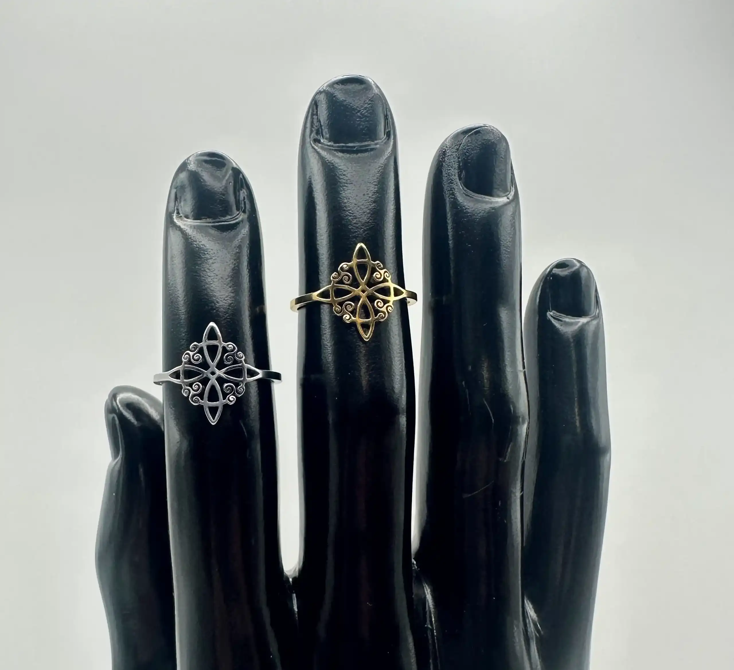 El nudo de bruja es un amuleto protector que está formado por dos símbolos entrelazados. Buscan conexión con las energías naturales y la espiritualidad. Anillo regulable.