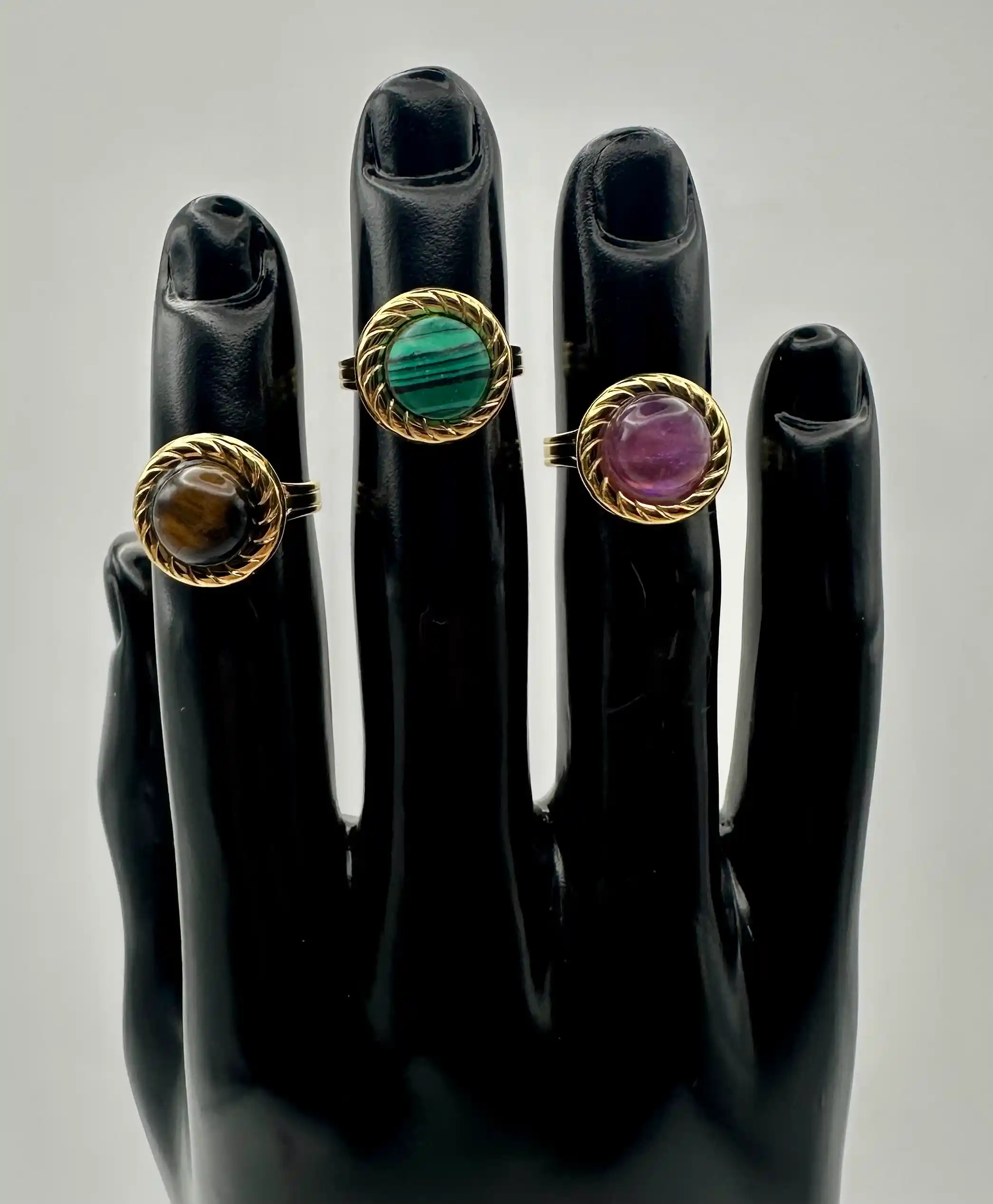 La malaquita protege contra energías negativas, transforma y purifica el aura. El ojo de tigre proporciona coraje, confianza y protección contra el mal de ojo. La amatista es conocida por sus propiedades curativas y protectoras contra las energías negativas.