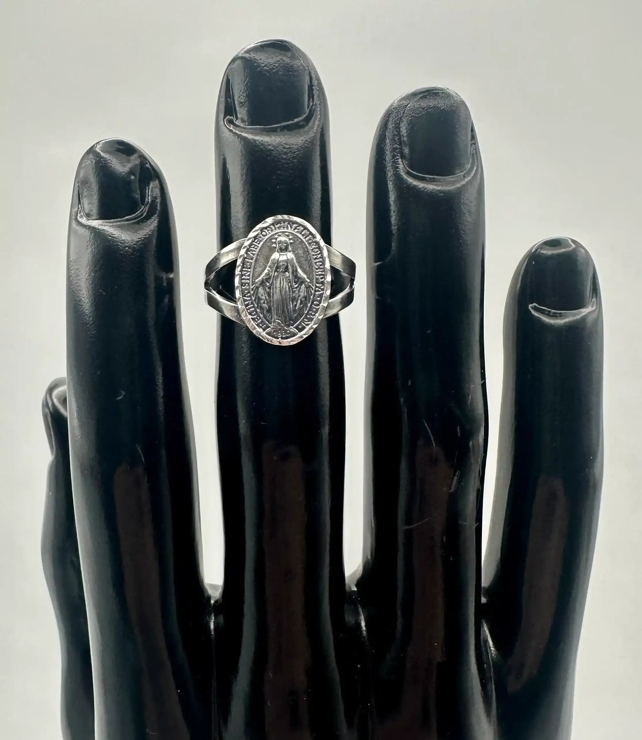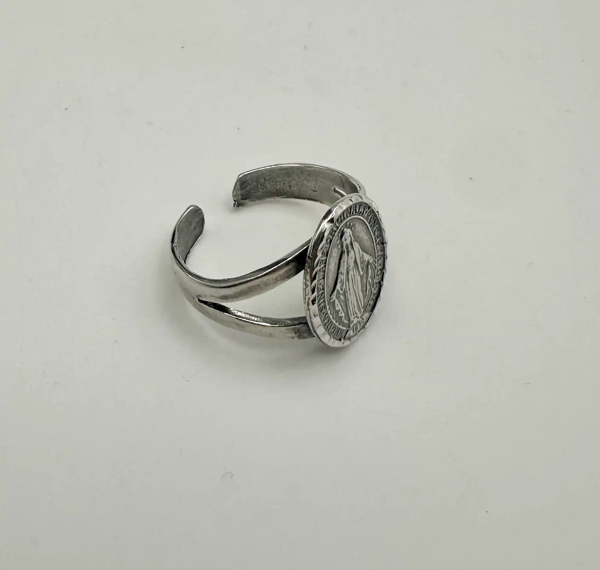 La Virgen Milagrosa simboliza protección, amor y esperanza, y su nombre se debe a los numerosos milagros y gracias atribuidos a su intercesión. Anillo regulable en plata de ley.
