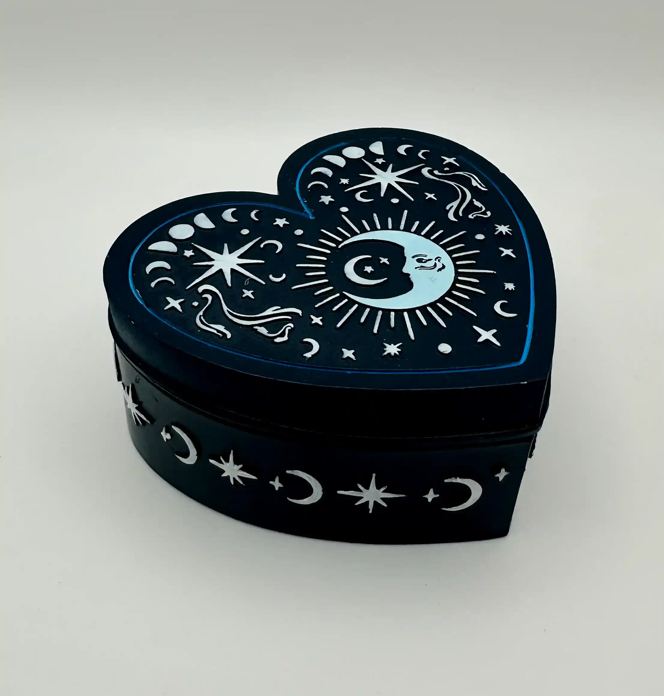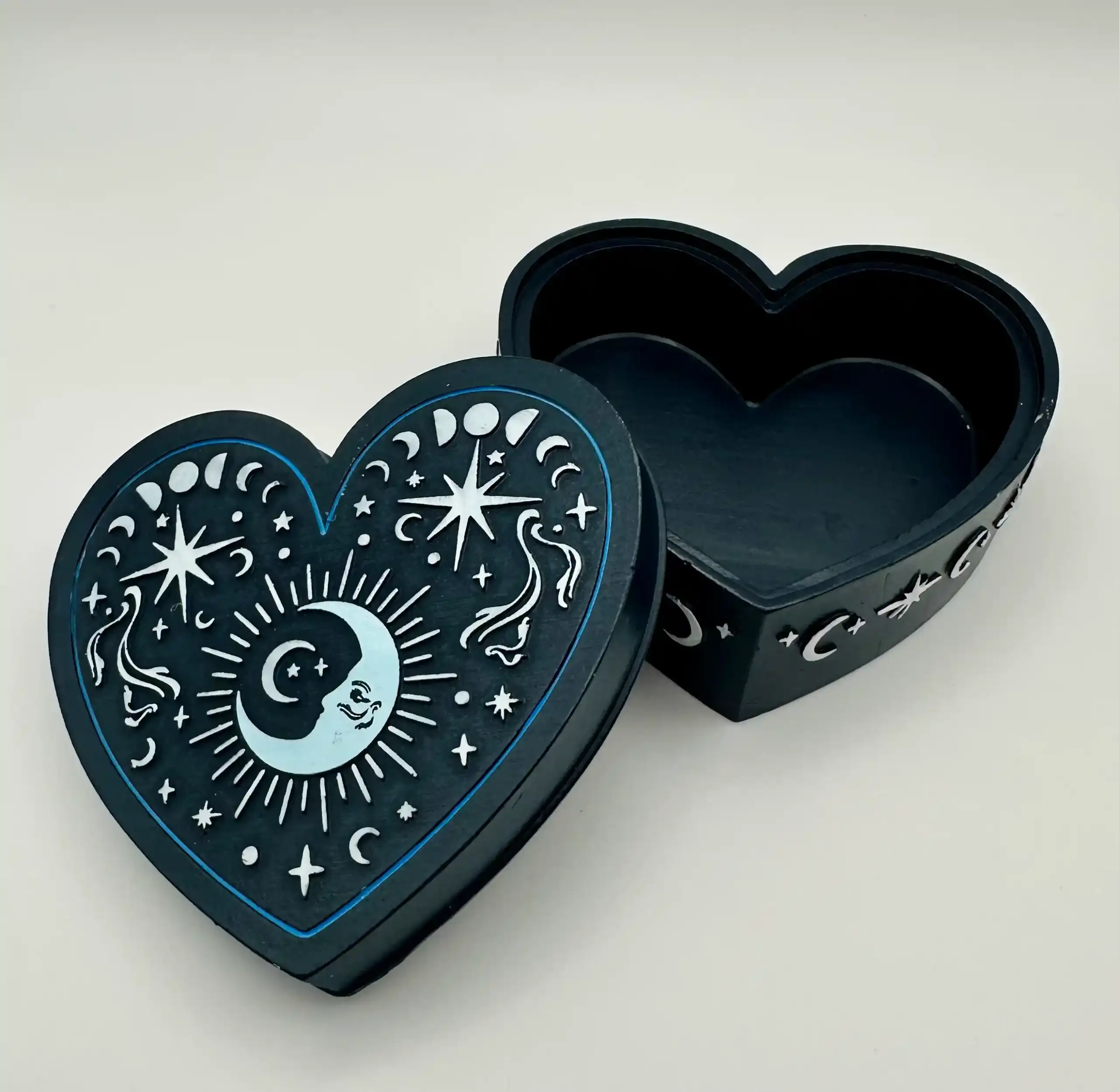 Caja negra con forma de corazón y dibujos de fases lunares. Puede servirte de joyero o de caja para tus minerales más pequeñitos.