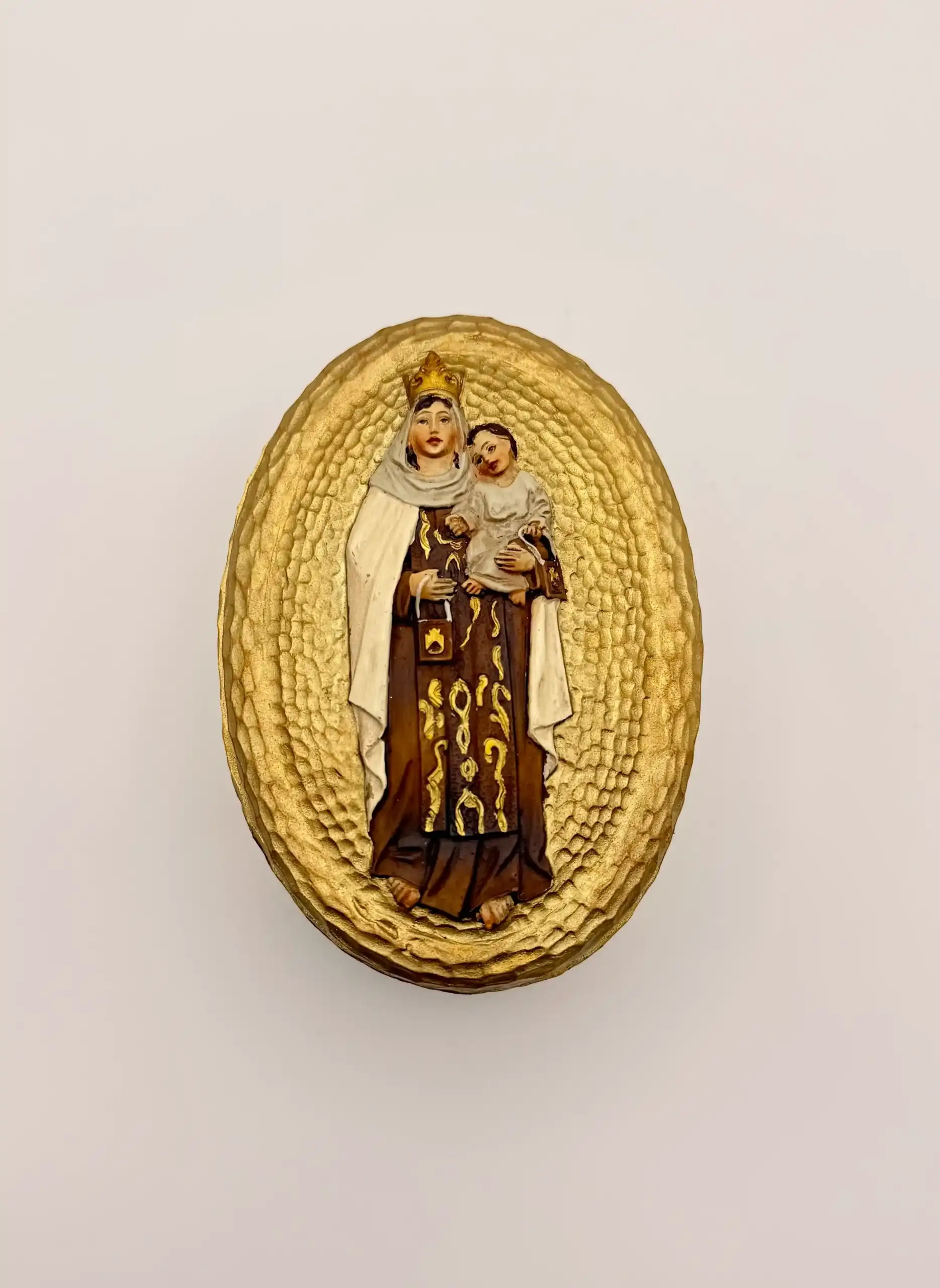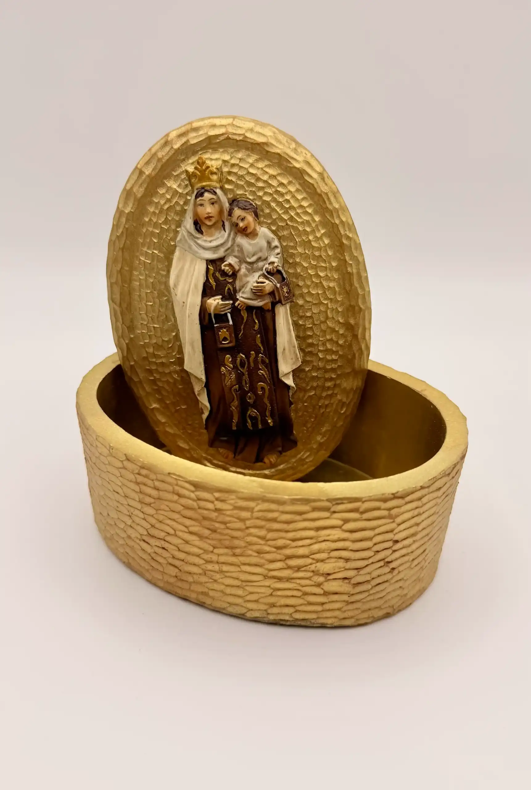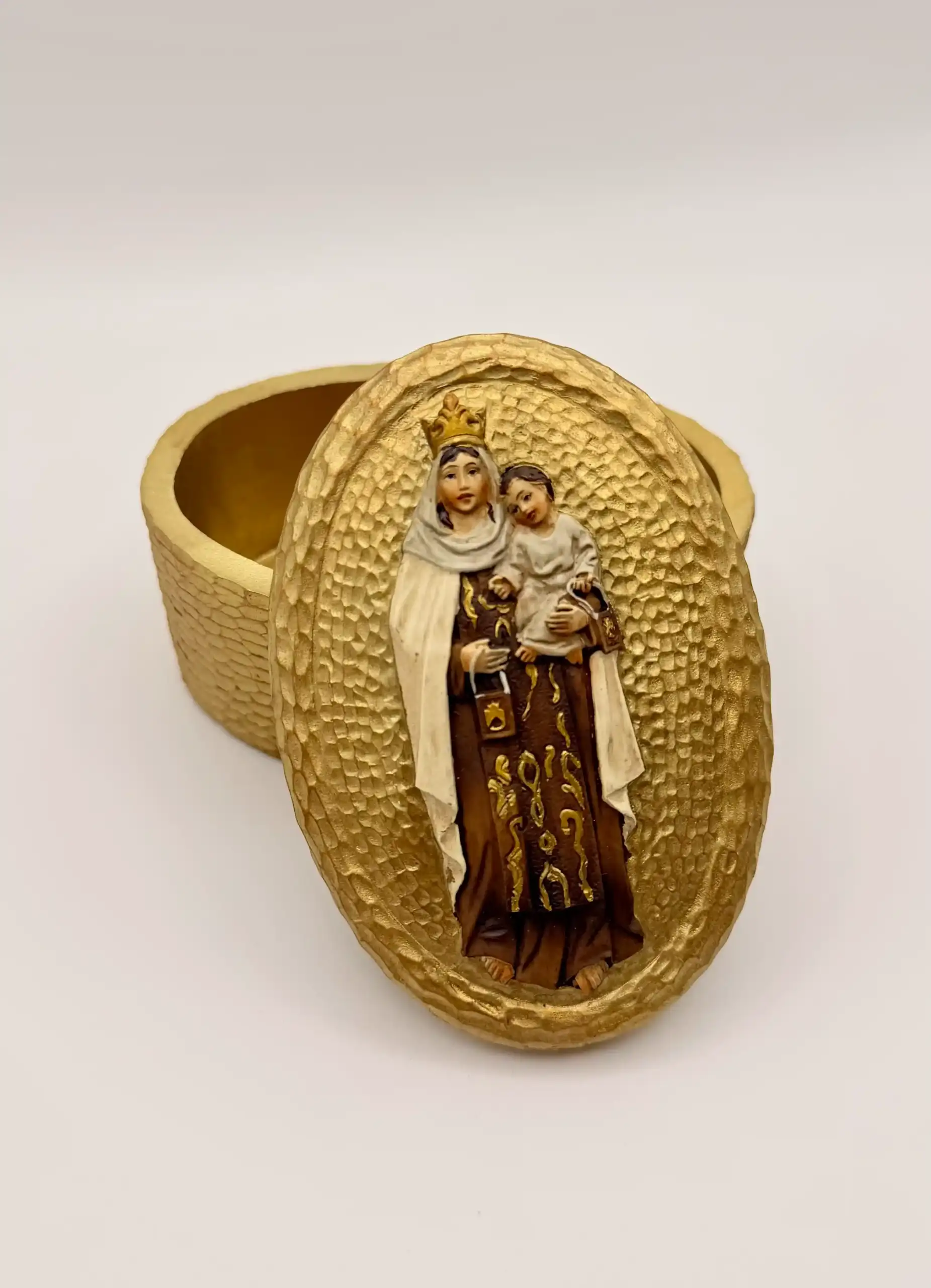 Caja joyero con La Virgen del Carmen, ella simboliza la protección maternal de María, la guía en la vida cristiana, la intercesión por las almas del purgatorio y el compromiso de vida religiosa. Su imagen, a menudo con el escapulario, simboliza la promesa de protección para quienes la honran. También se la invoca como «Estrella del Mar», una guía segura en las dificultades de la vida y para los navegantes.