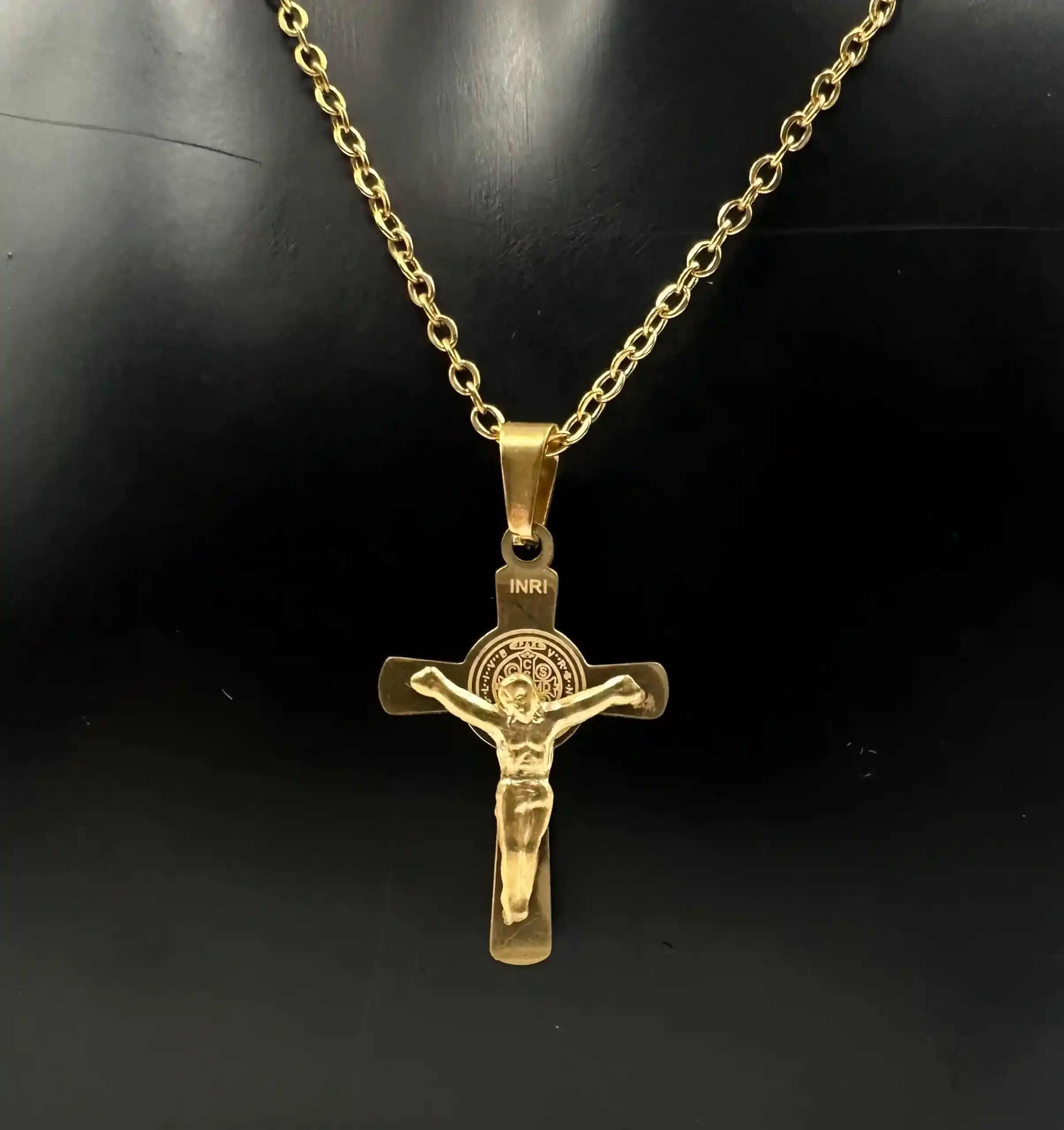 Colgante Cruz De Cristo Con San Benito Acero Dorado Pequeña