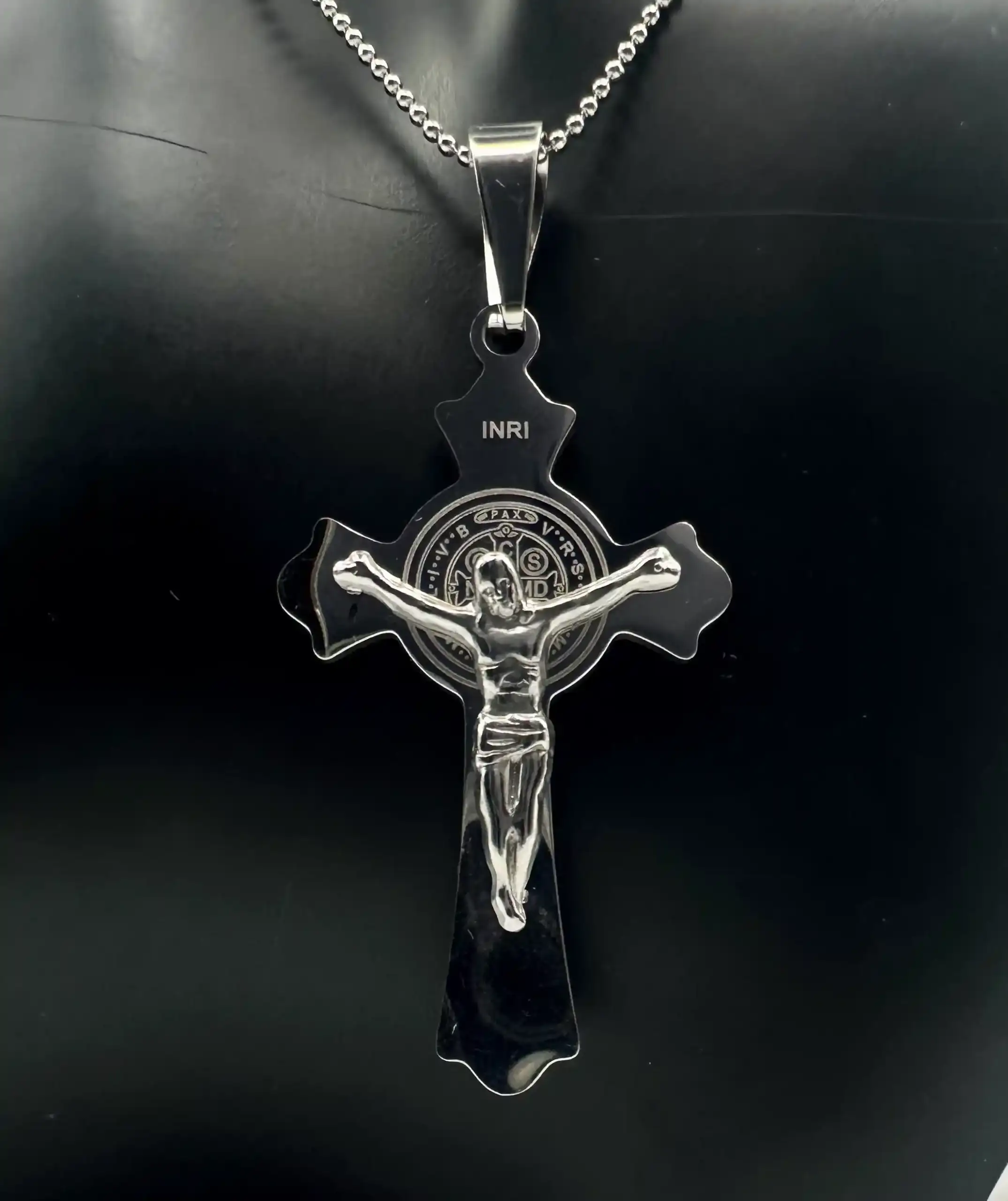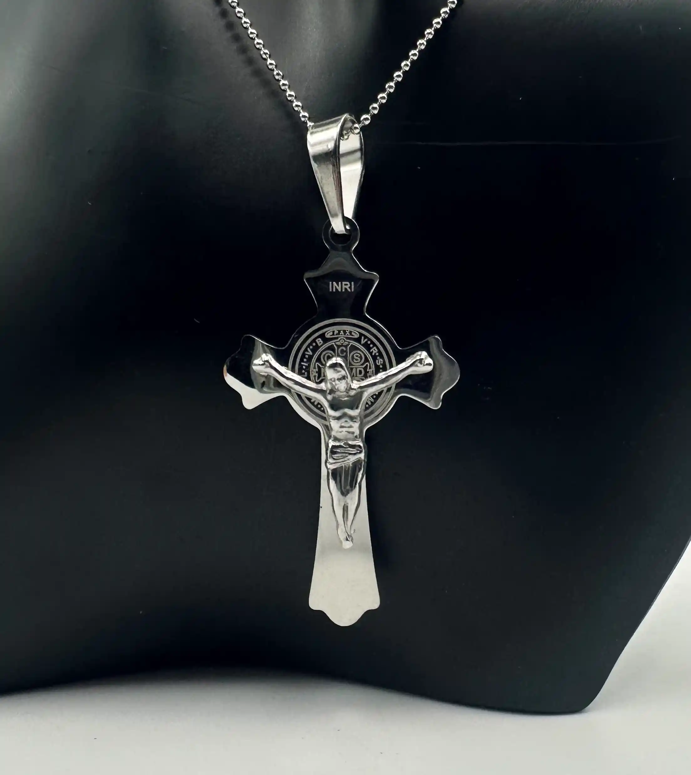 Colgante Cruz De Cristo Con San Benito Acero Plateado