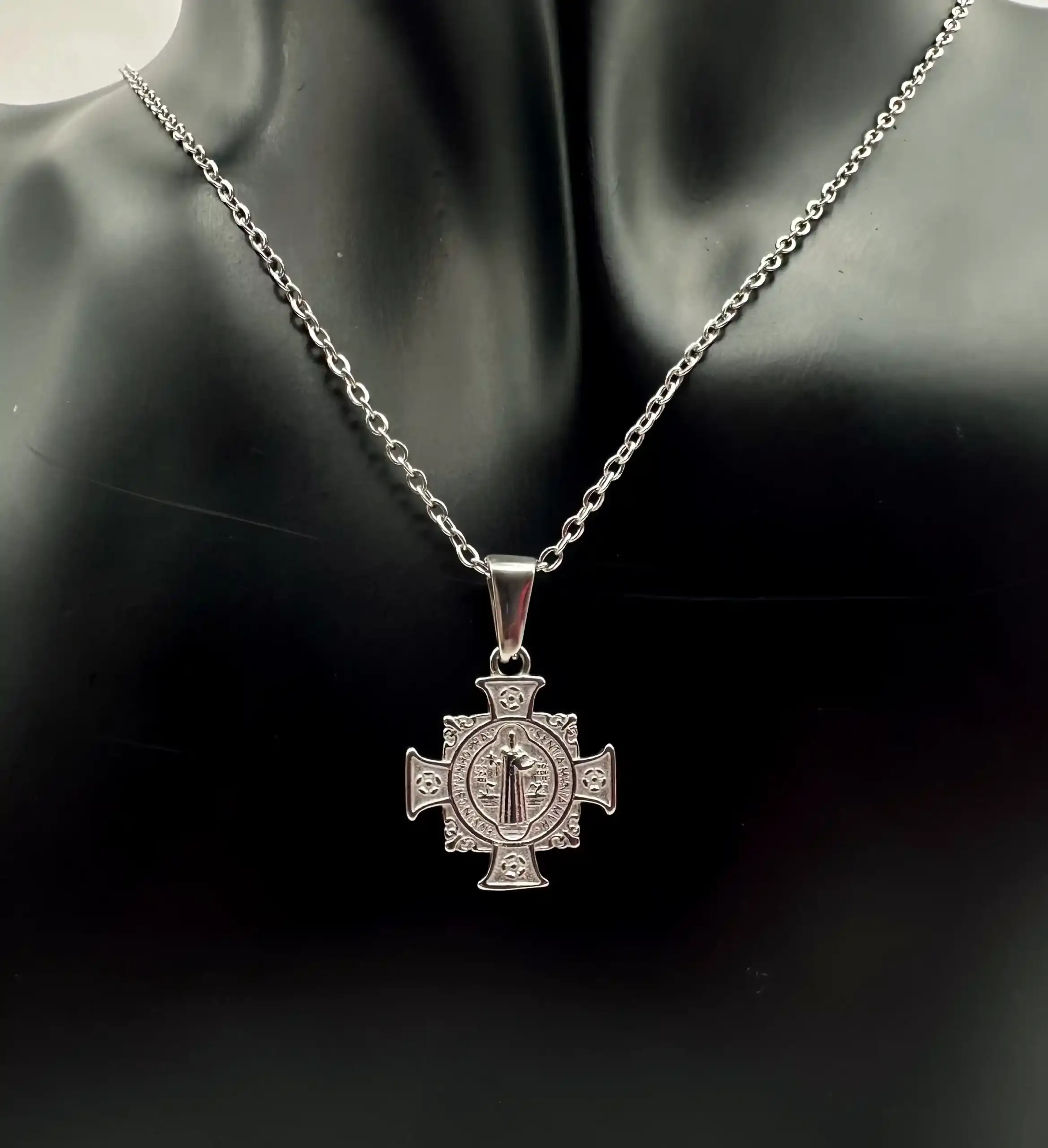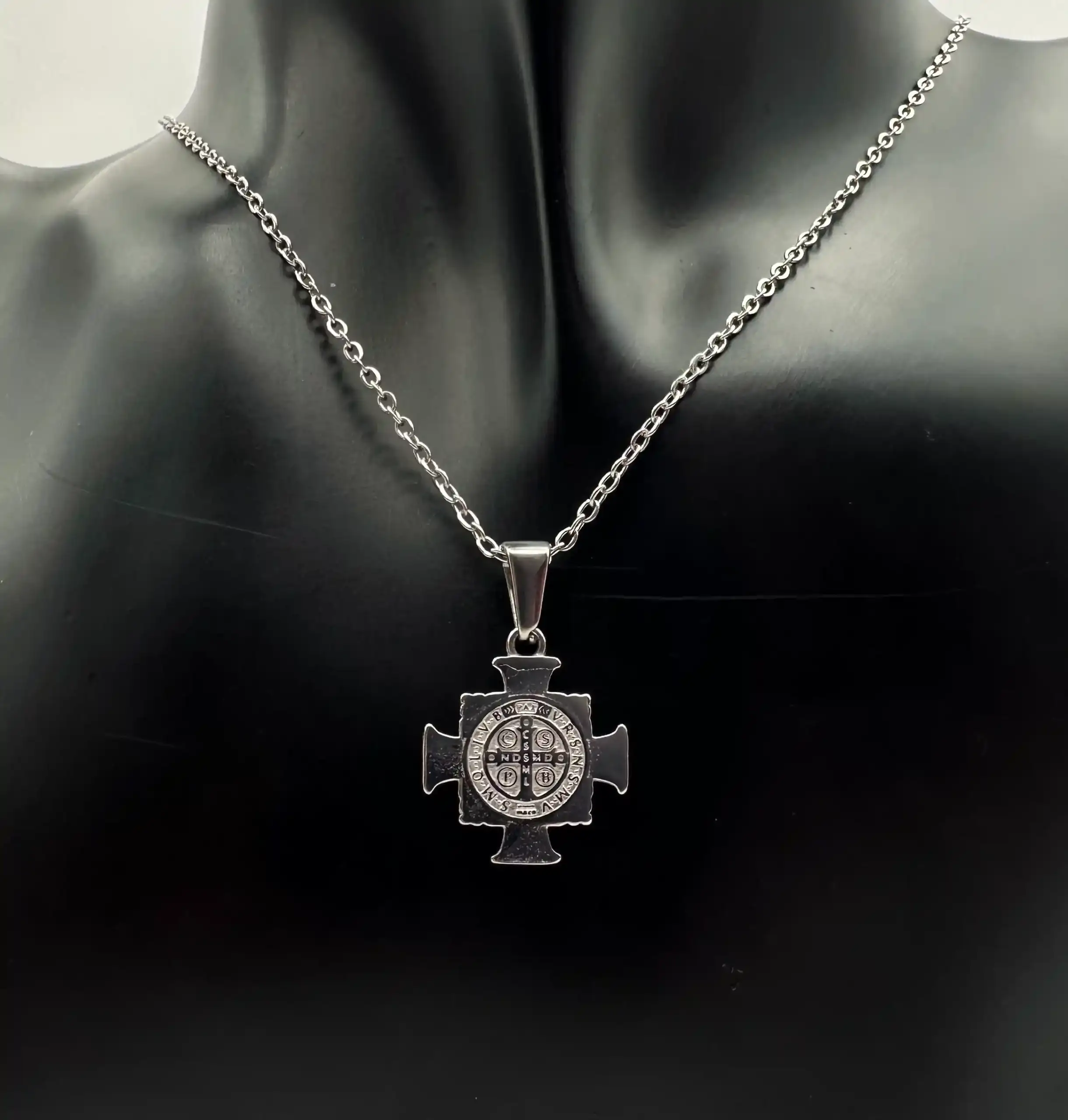 Colgante cruz San Benito en acero plateado. San Benito es un amuleto muy potente que ayuda a repeler malas energías, envidias o influencias negativas.