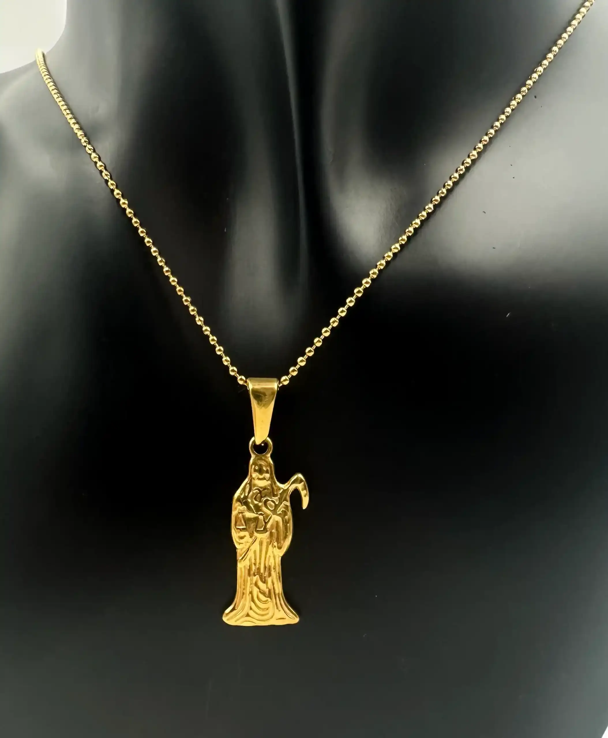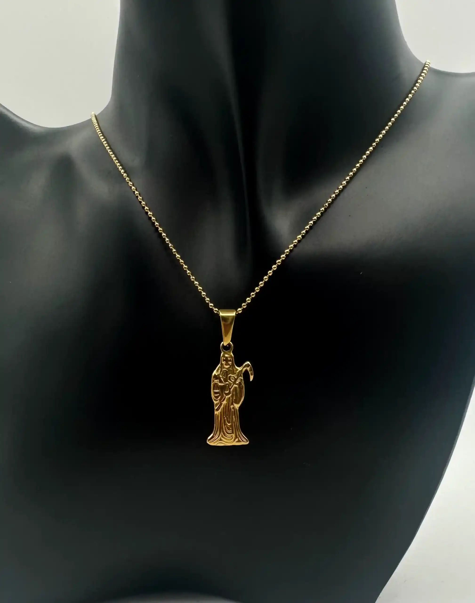 Colgante en acero dorado de la santa muerte con cadena incluida.