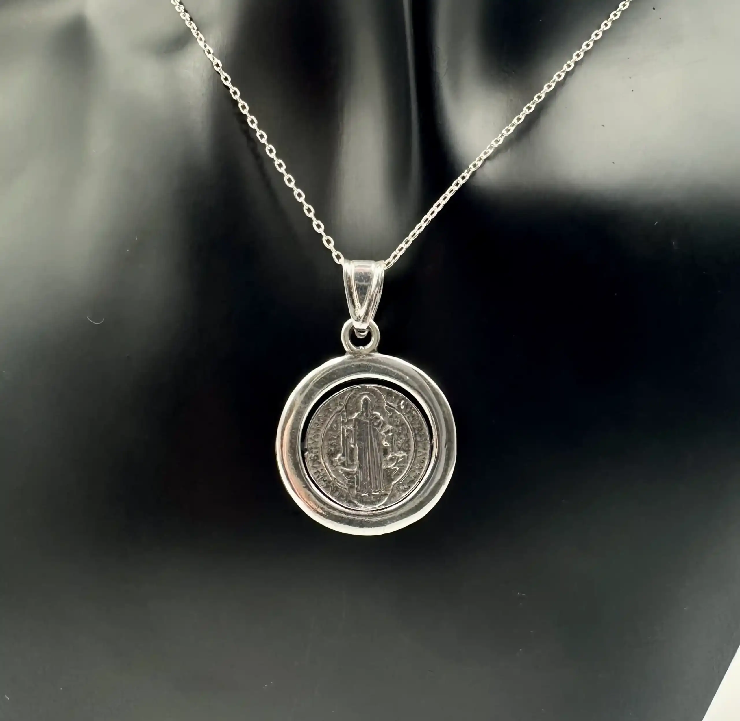 Colgante giratorio con San Benito, que se asocia con la protección contra el mal, el pecado y las tentaciones, y San Judas Tadeo, que es el santo de las causas imposibles y la esperanza.