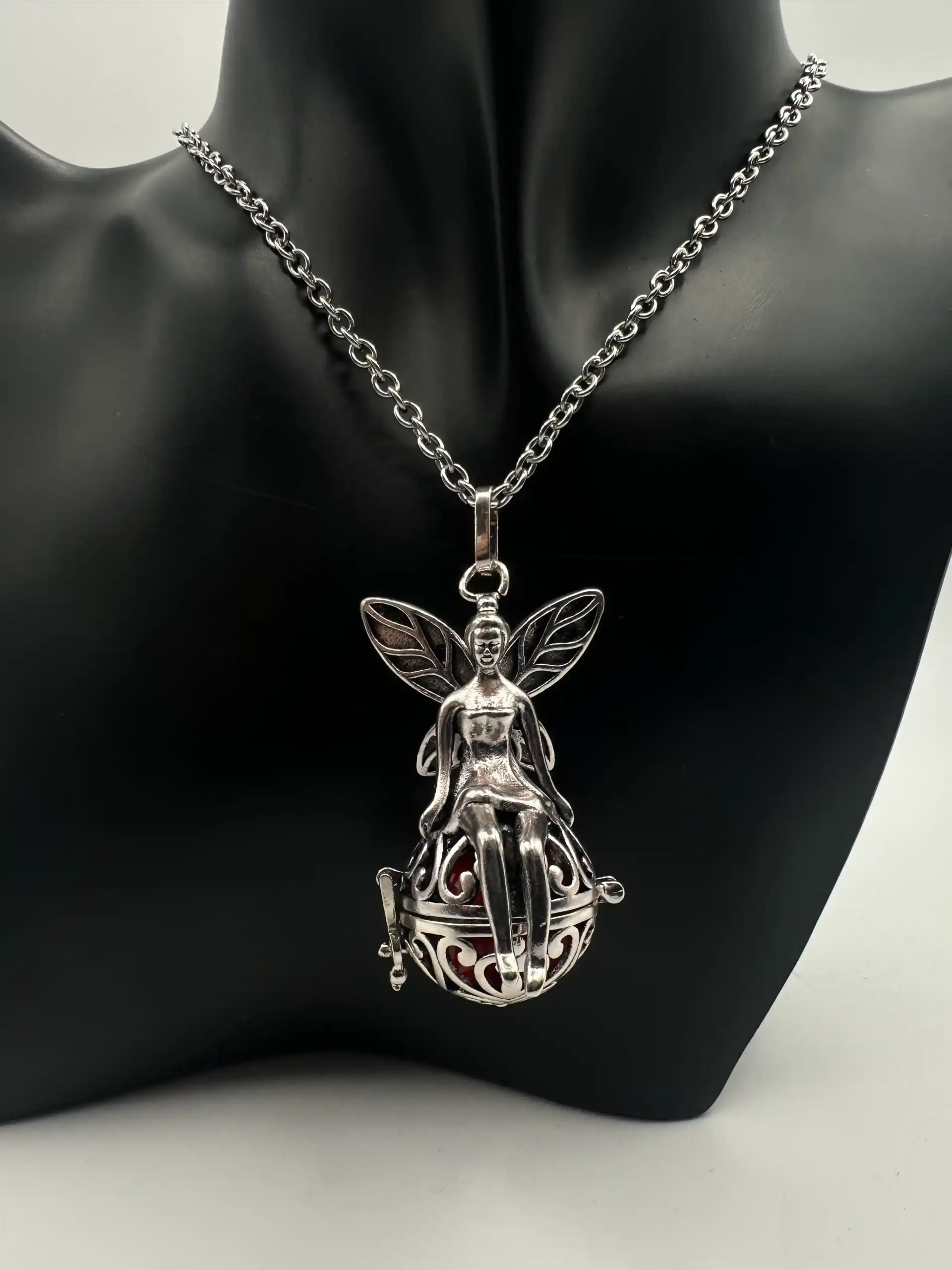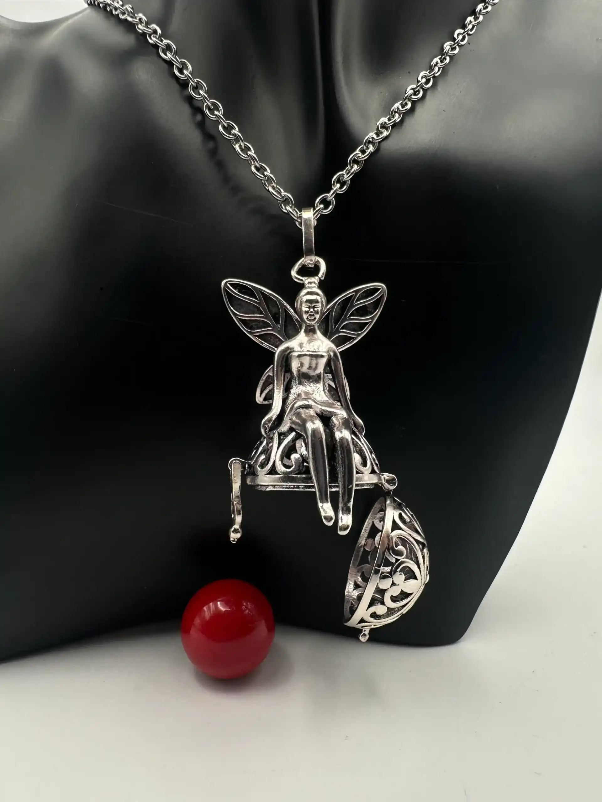 Colgante Llamador De Angeles Rojo Con Hada En Plata De Ley Y Acero