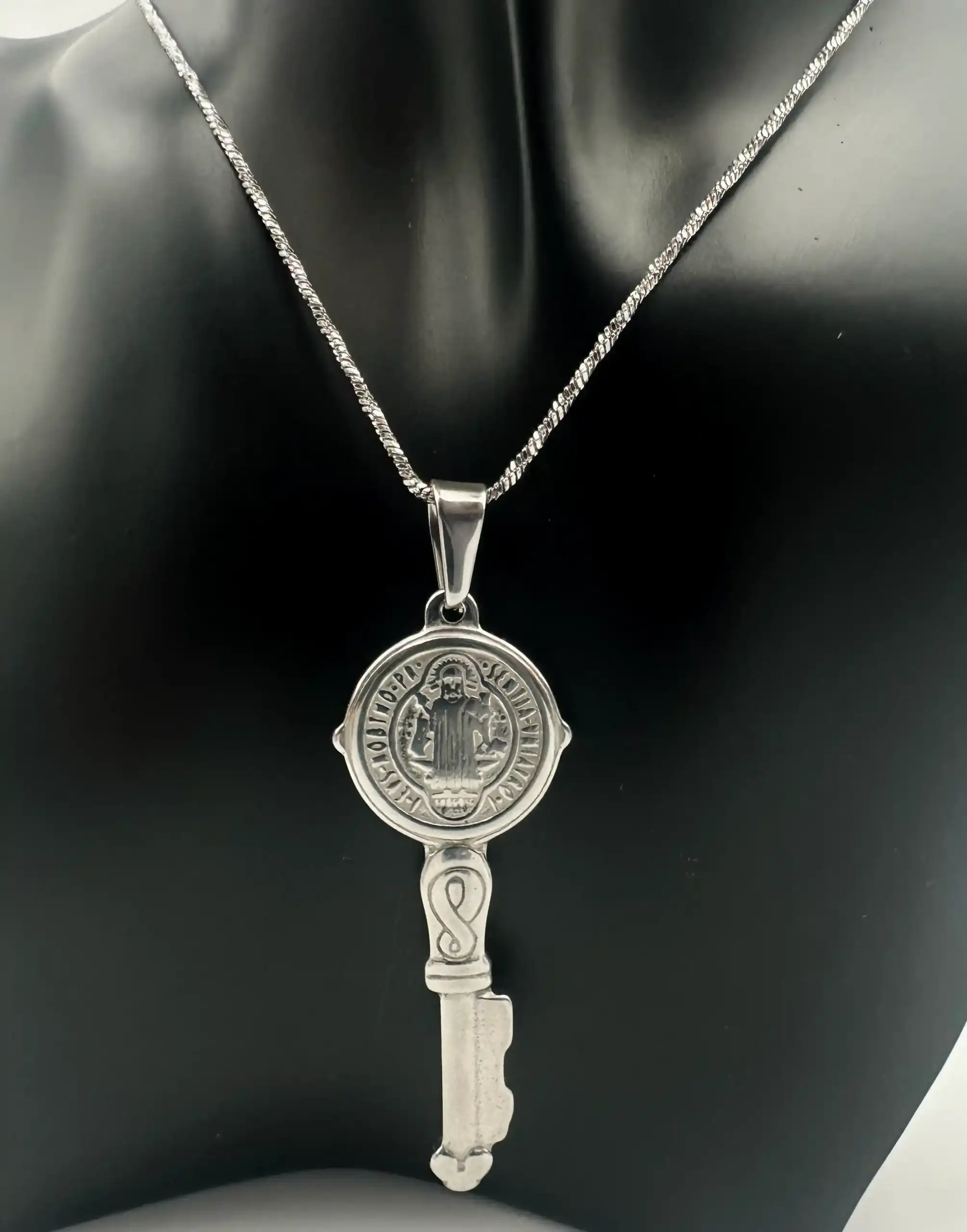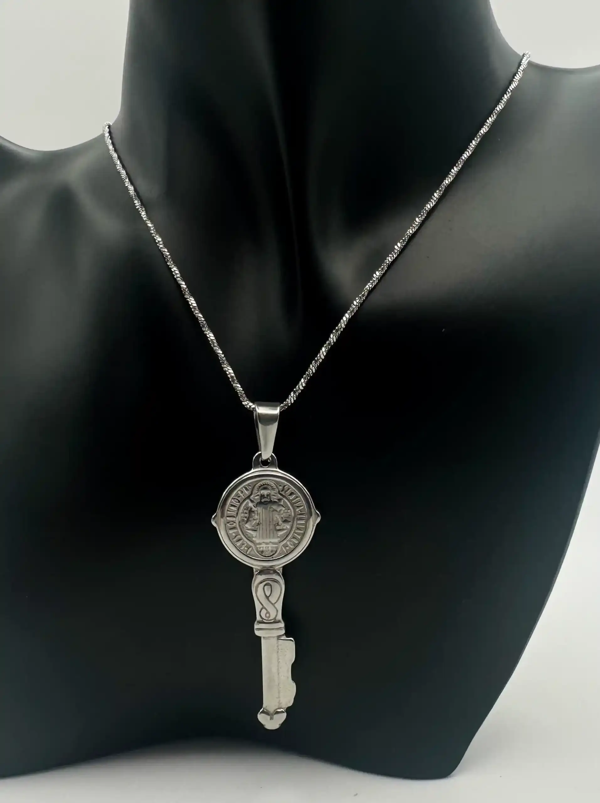 Colgante Llave de San Benito de 5 cm aproximadamente en acero plateado