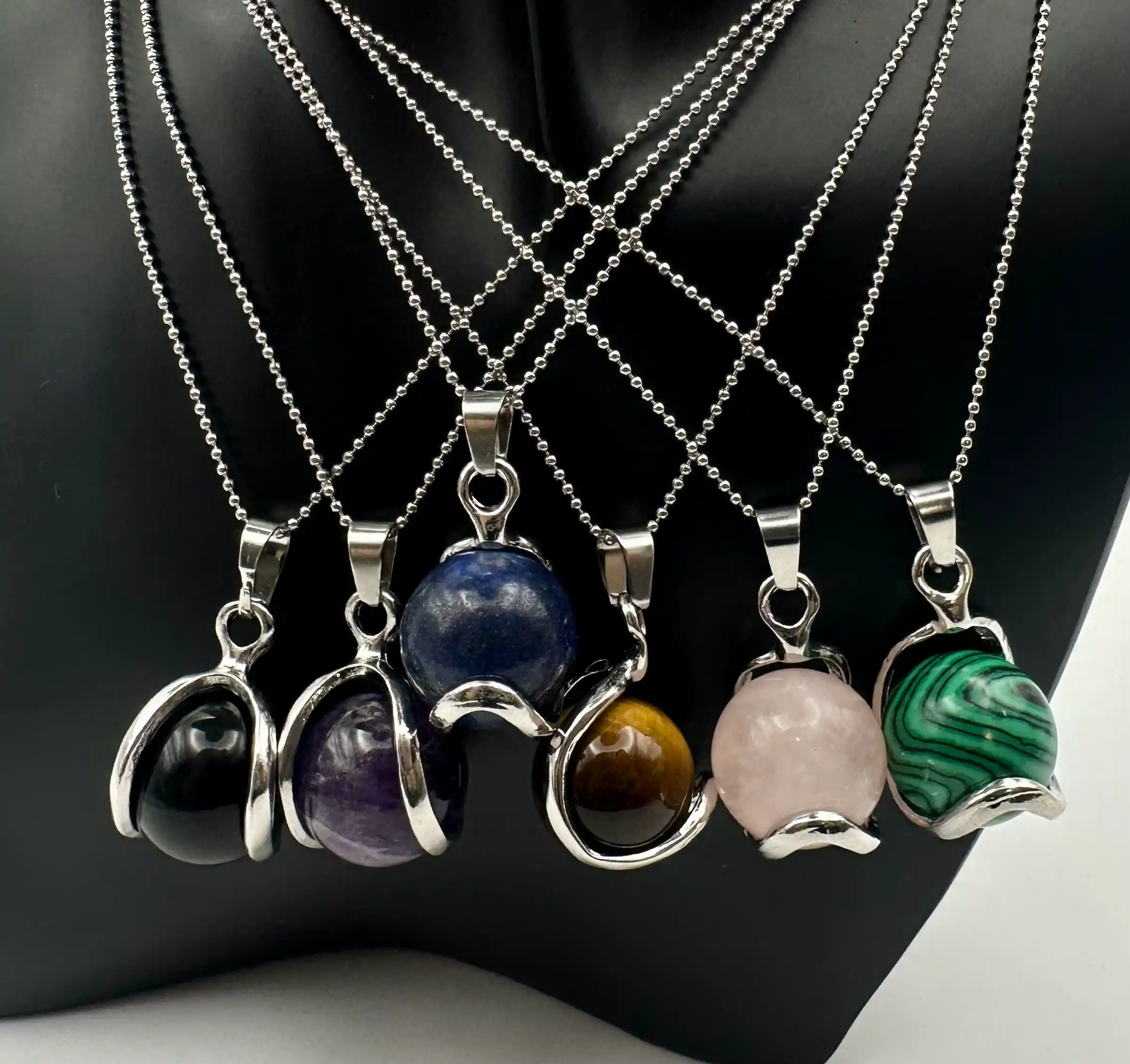 Colgante de acero plateado con esfera de mineral. Puedes girar la esfera dentro del colgante y esto ayuda a calmar la ansiedad.