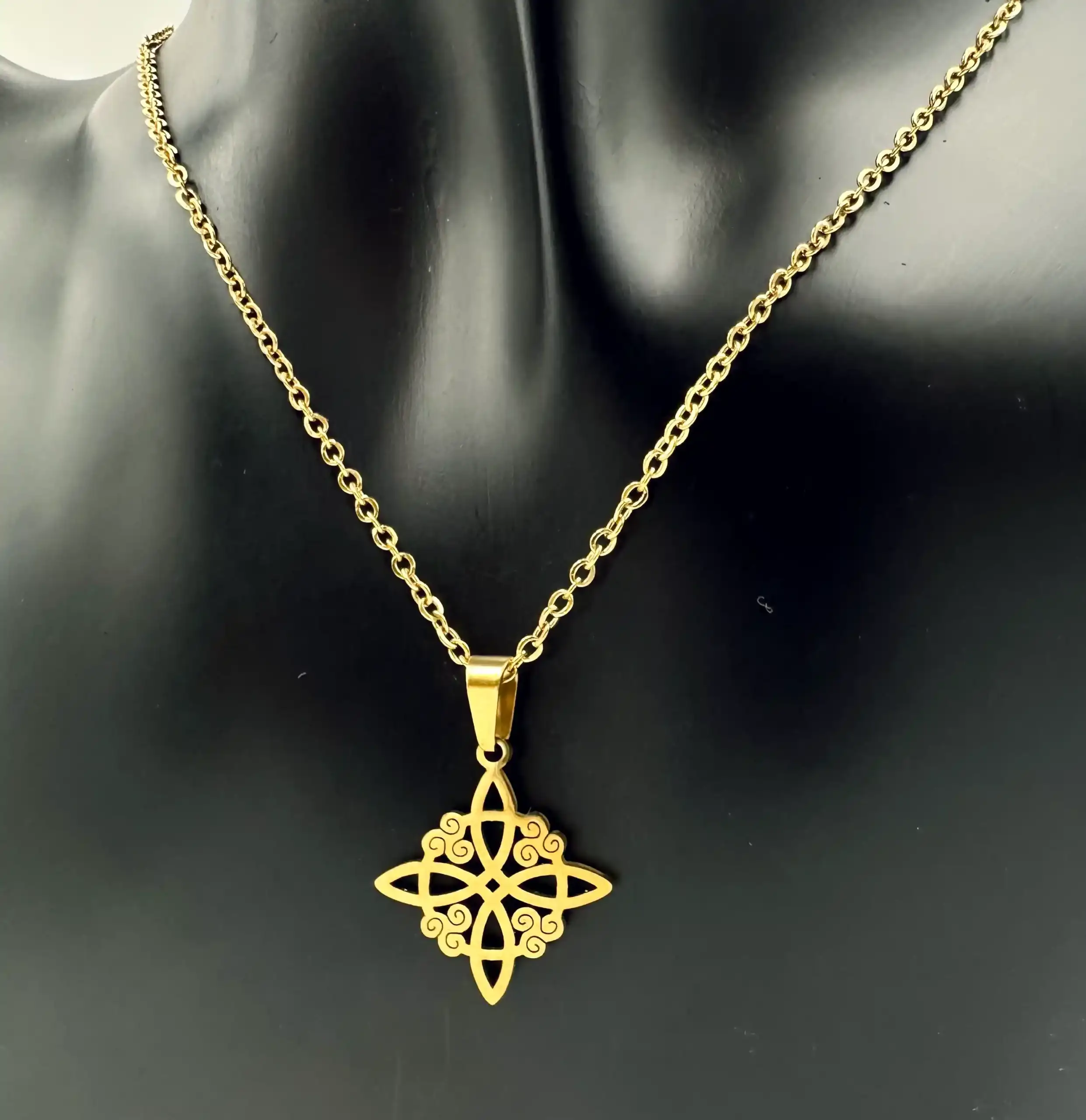 Colgante de nudo de bruja en acero inoxidable dorado, mide 2 cm aproximadamente.
