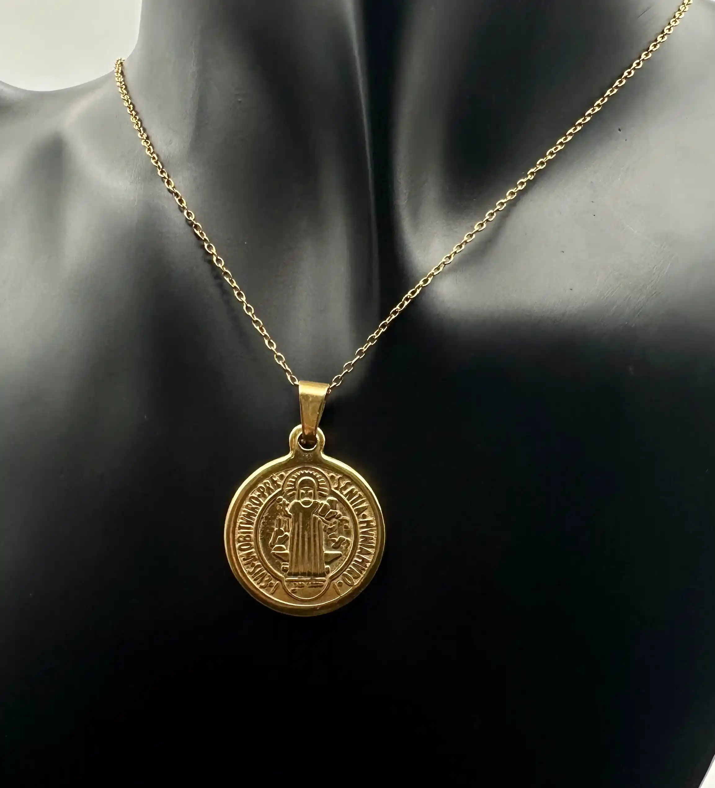Colgante San Benito Grabado Grande Acero Dorado
