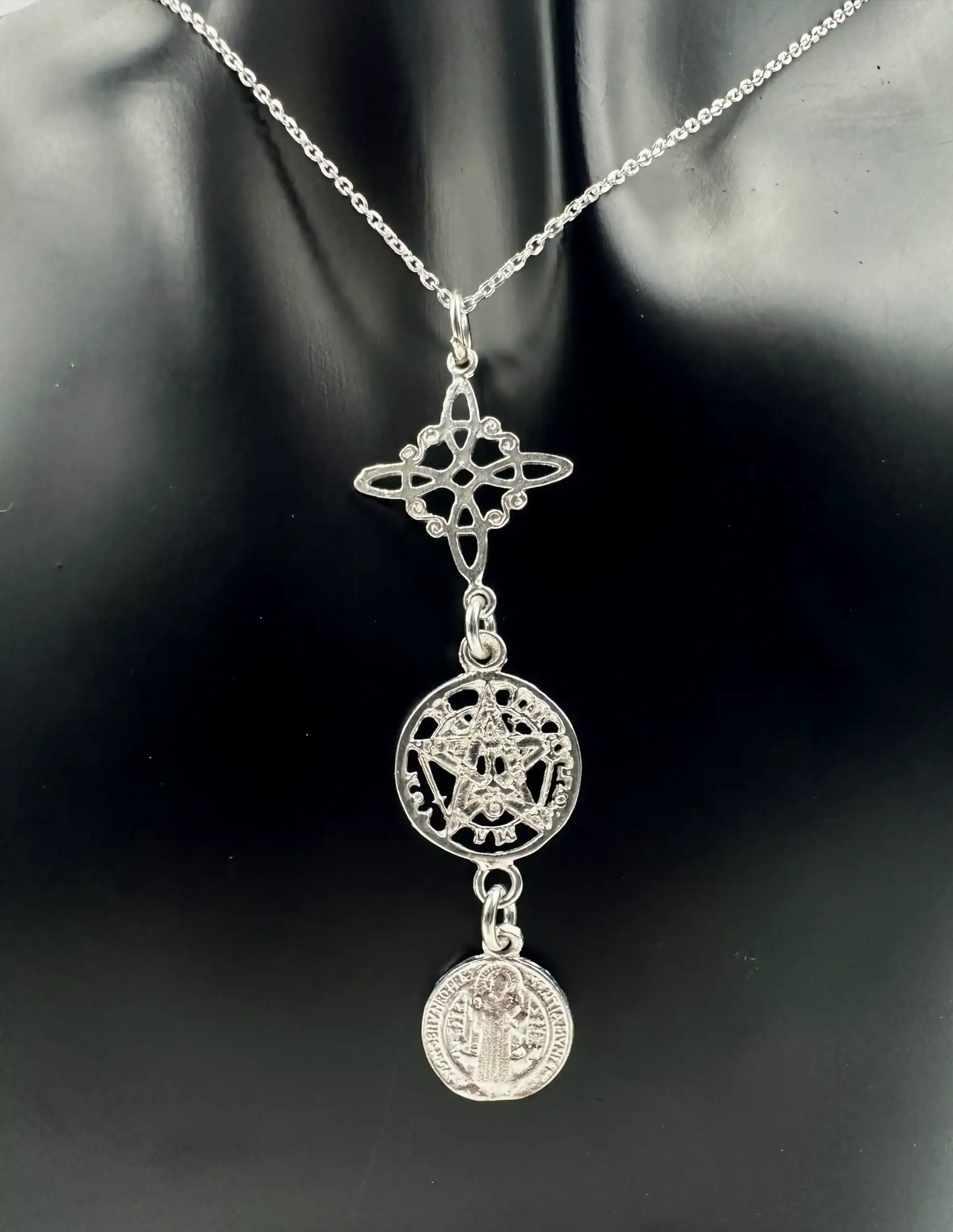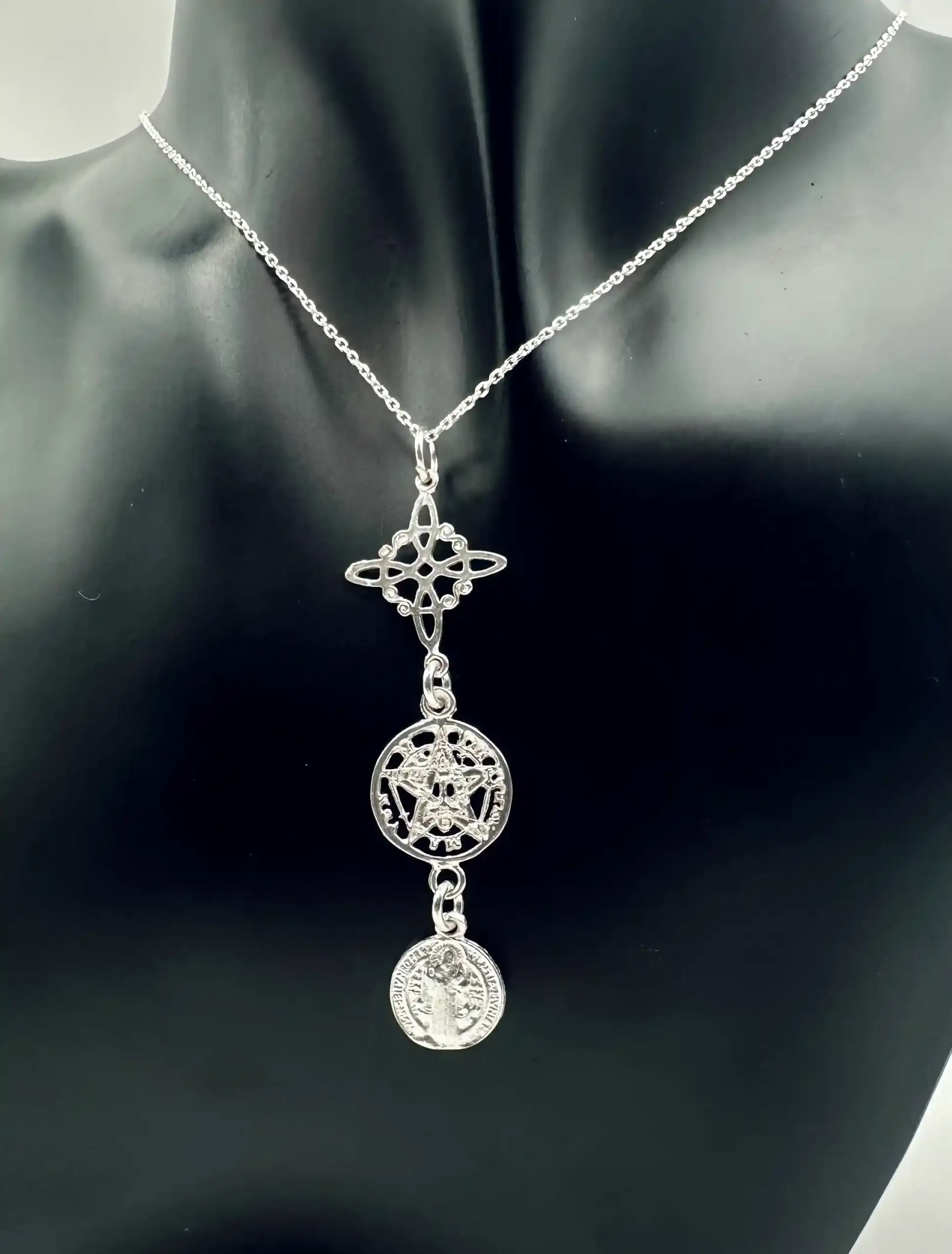 Colgante Triple Proteccion Nudo De Bruja, Tetragramaton Y San Benito Plata De Ley