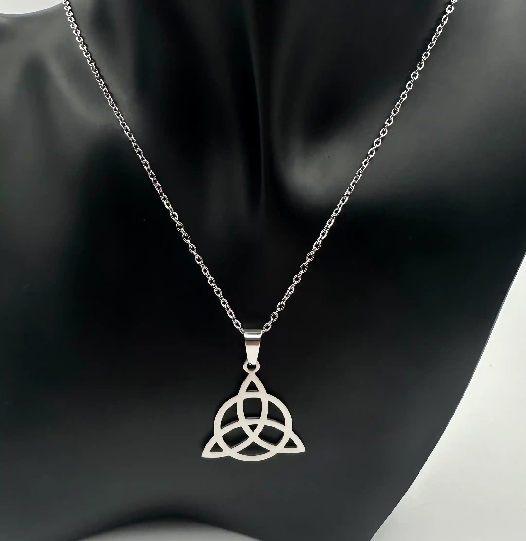 Colgante de acero plateado con Triqueta. La Triqueta es un símbolo celta que simboliza la protección, la eternidad y el equilibrio, representando las tres dimensiones fundamentales: cielo, tierra y mar, o pasado, presente y futuro.