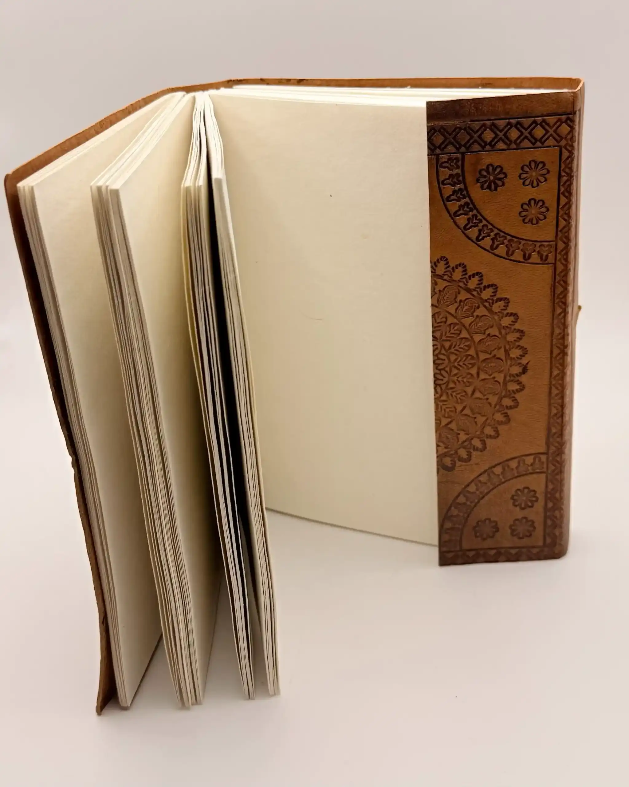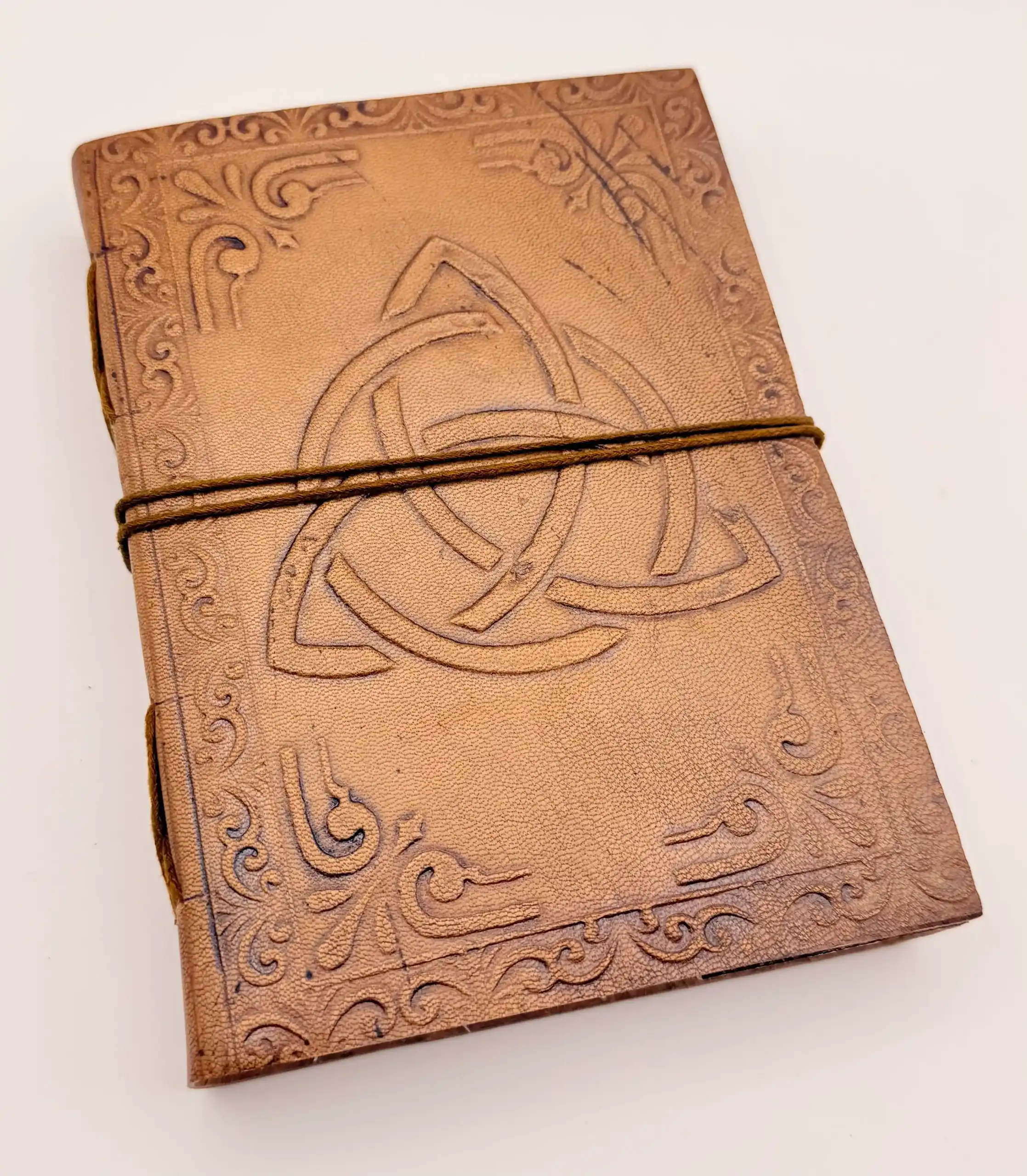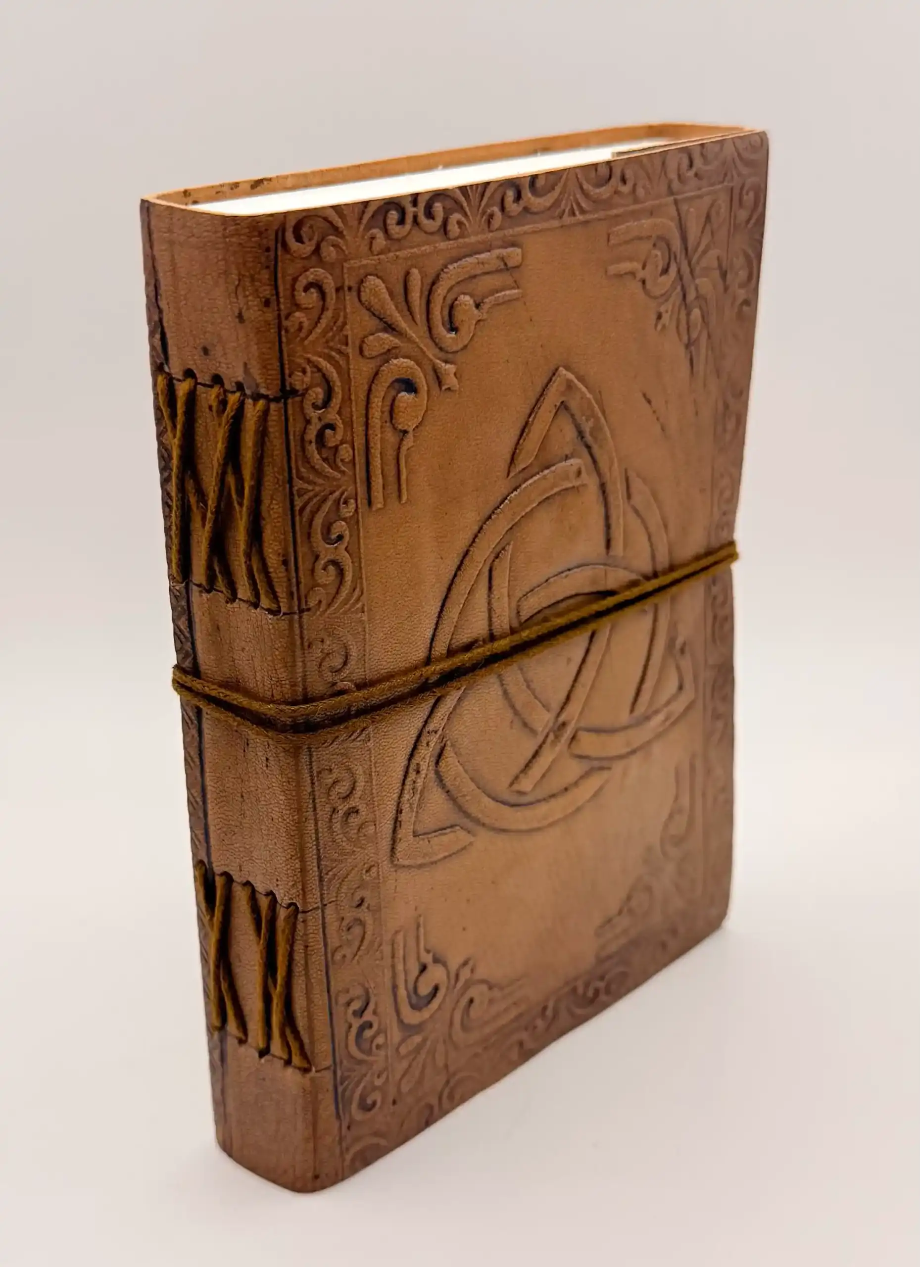 Cuaderno de cuero con triqueta grabada en relieve y las hojas en blanco. Ideal para pensamientos creativos, notas y el uso diario. Puedes utilizarlo como tu grimorio personal o como libro de sueños. Acabado de alta calidad y un diseño elegante.