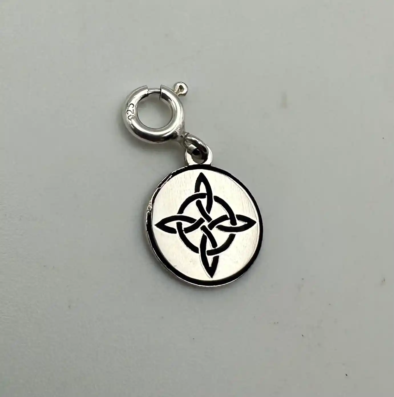 Un dije es una pieza de joyería decorativa que se cuelga de una cadena o pulsera y, además de su función estética, puede tener un profundo significado simbólico, como es en este caso el del Nudo de Bruja que simboliza protección.