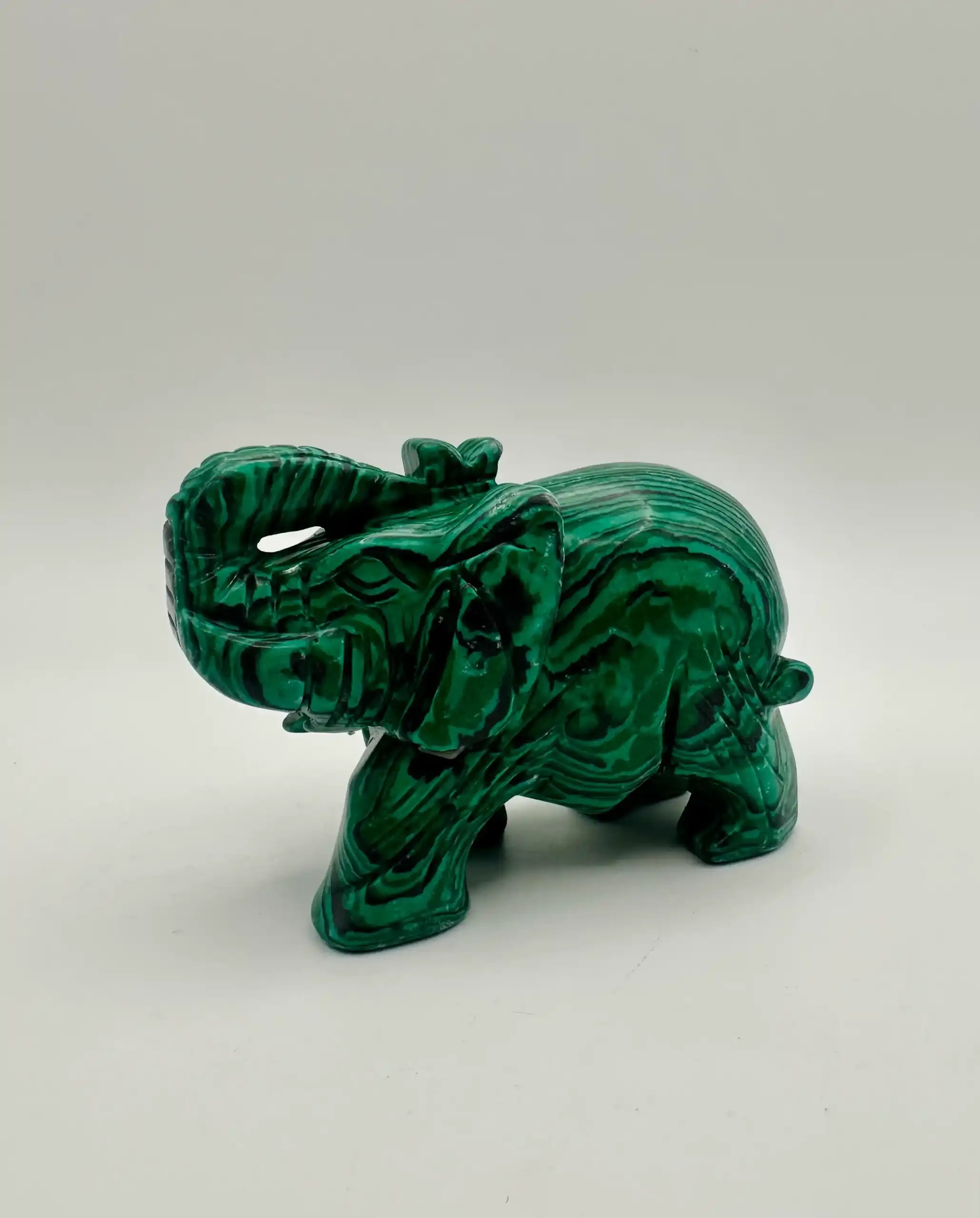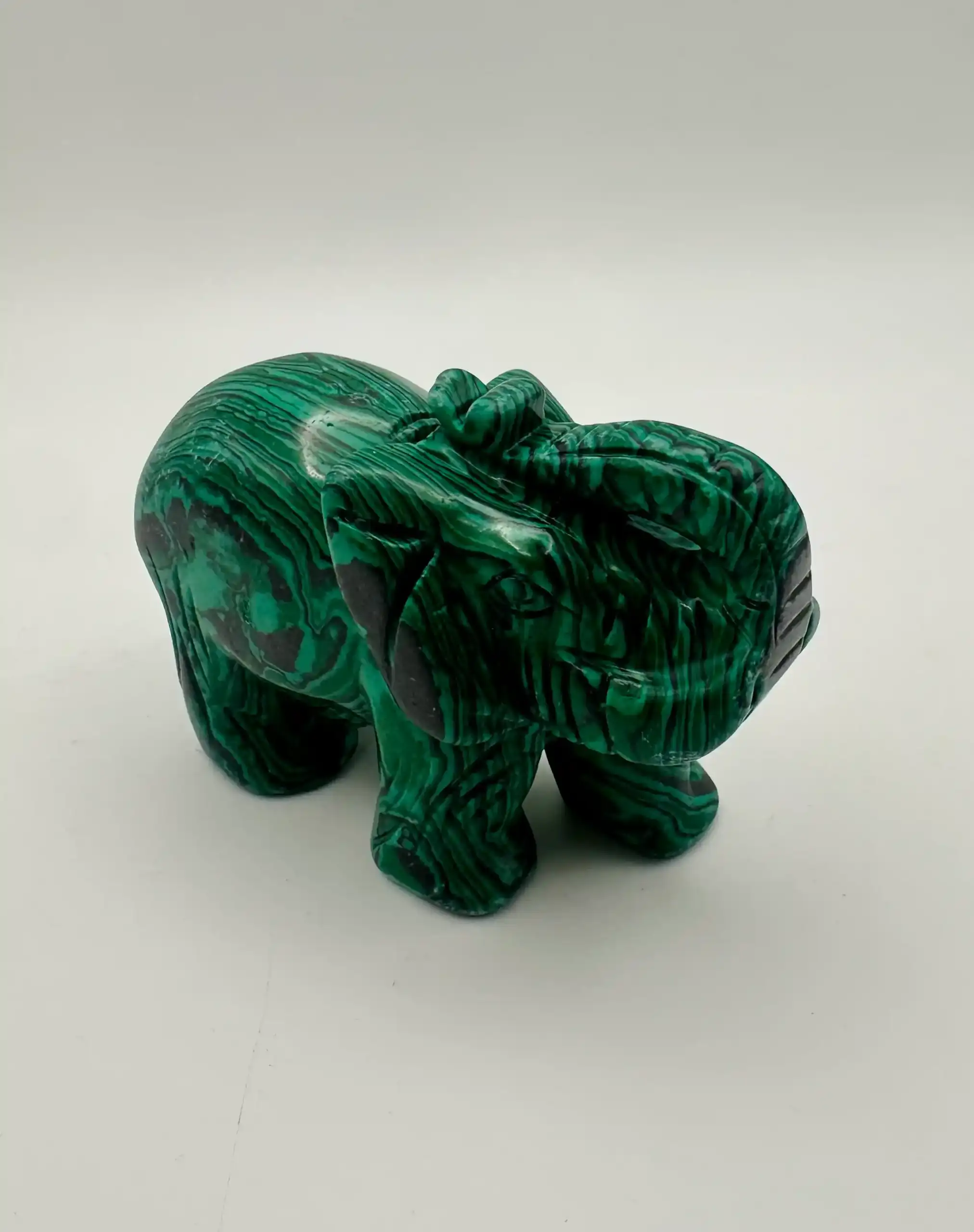 Un elefante de malaquita combina los simbolismos del elefante (sabiduría, fuerza, buena suerte y protección) con los de la malaquita (transformación, protección, sanación emocional y claridad mental). Se utiliza para atraer prosperidad y protección, y para facilitar el crecimiento personal y espiritual al disolver bloqueos emocionales y fomentar un cambio positivo.