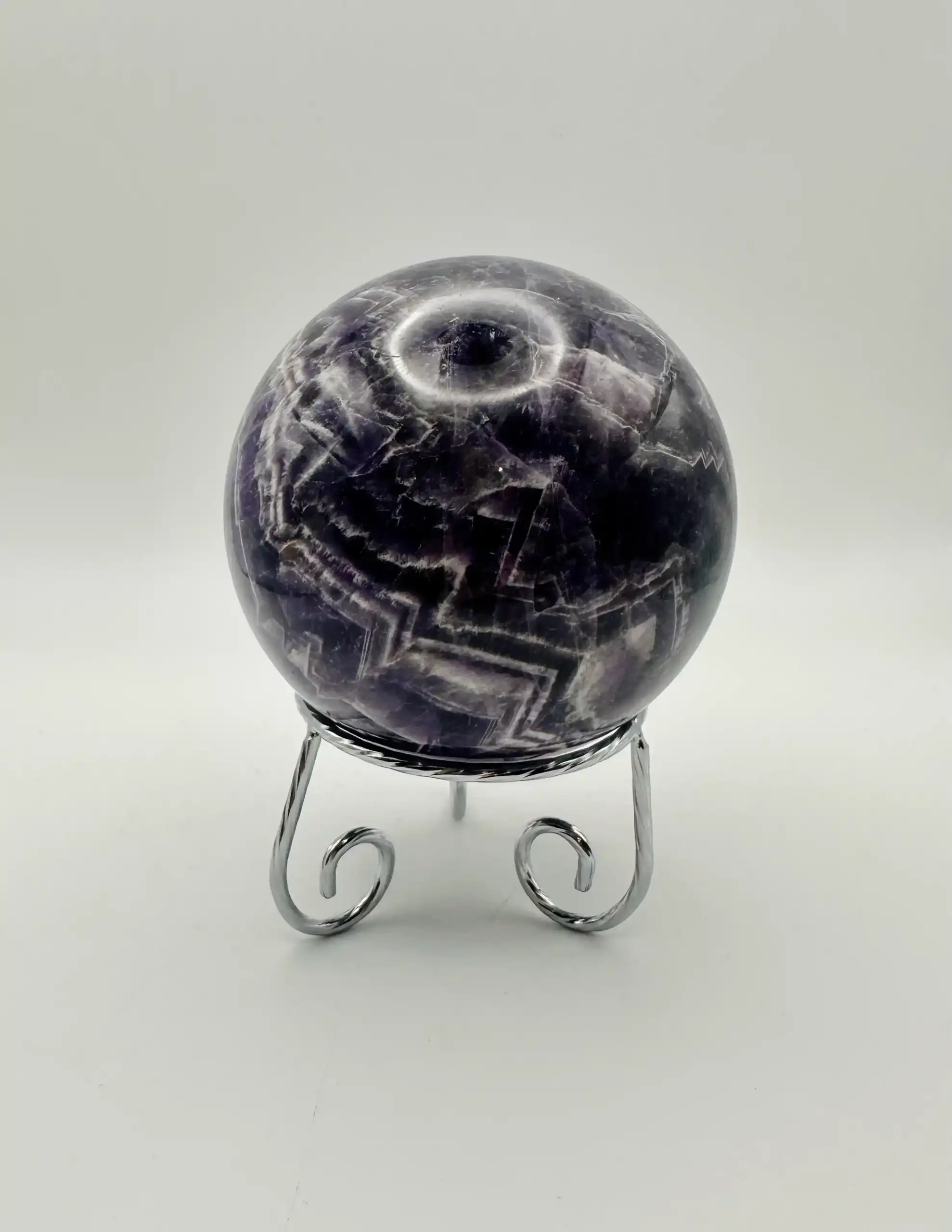 La esfera de amatista se centra en la protección energética, la calma mental y el desarrollo espiritual. Se utiliza para purificar espacios, para la meditación, para equilibrar las emociones y la mente, y se recomienda colocarla en el tercer ojo o debajo de la almohada para mejorar la intuición y el sueño.