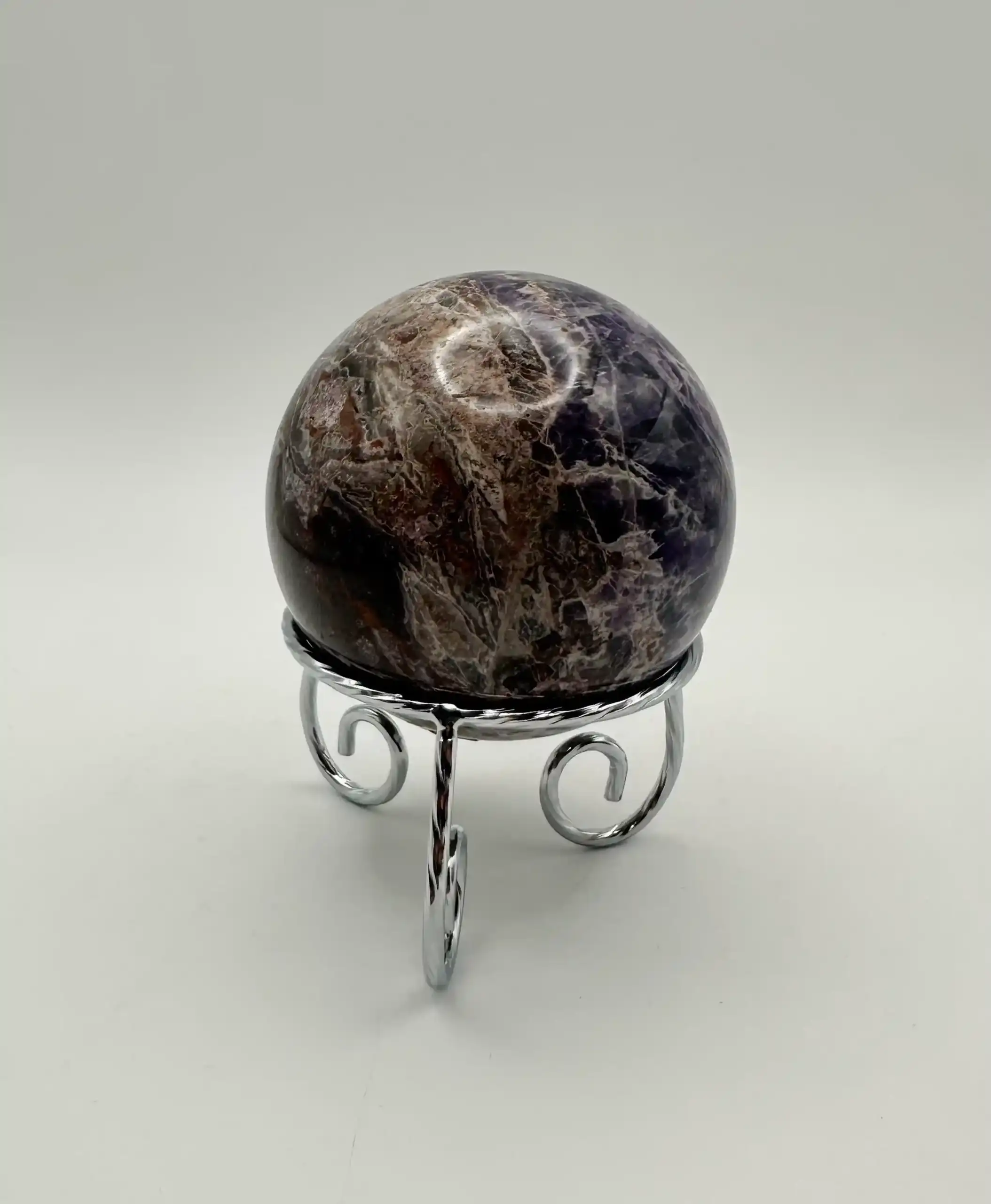 La esfera de amatista se centra en la protección energética, la calma mental y el desarrollo espiritual. Se utiliza para purificar espacios, para la meditación, para equilibrar las emociones y la mente, y se recomienda colocarla en el tercer ojo o debajo de la almohada para mejorar la intuición y el sueño.