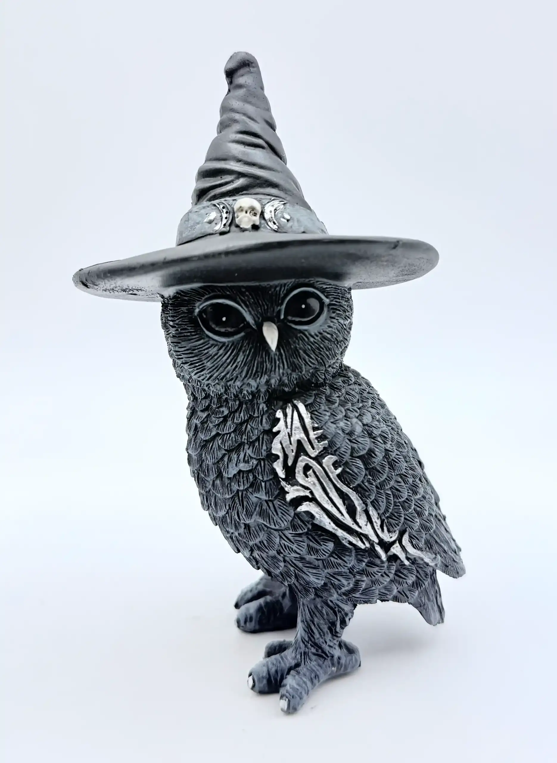 Un búho negro con sombrero de bruja representa la sabiduría y la intuición (búho), combinadas con la protección, la conexión con lo místico y el bloqueo de energías negativas (sombrero de bruja).