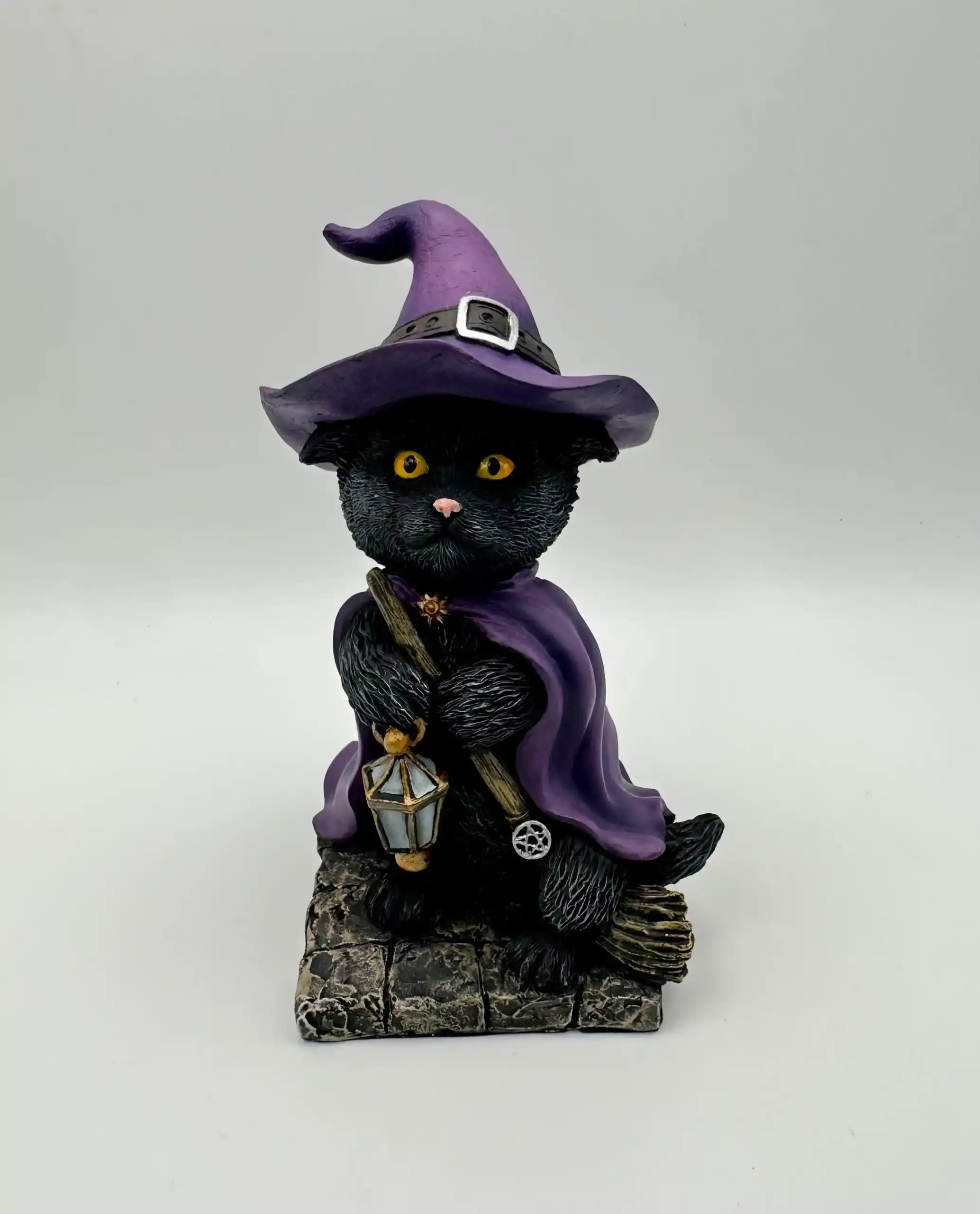 Gato Brujo Con Escoba Y Candelabro 15 Cm