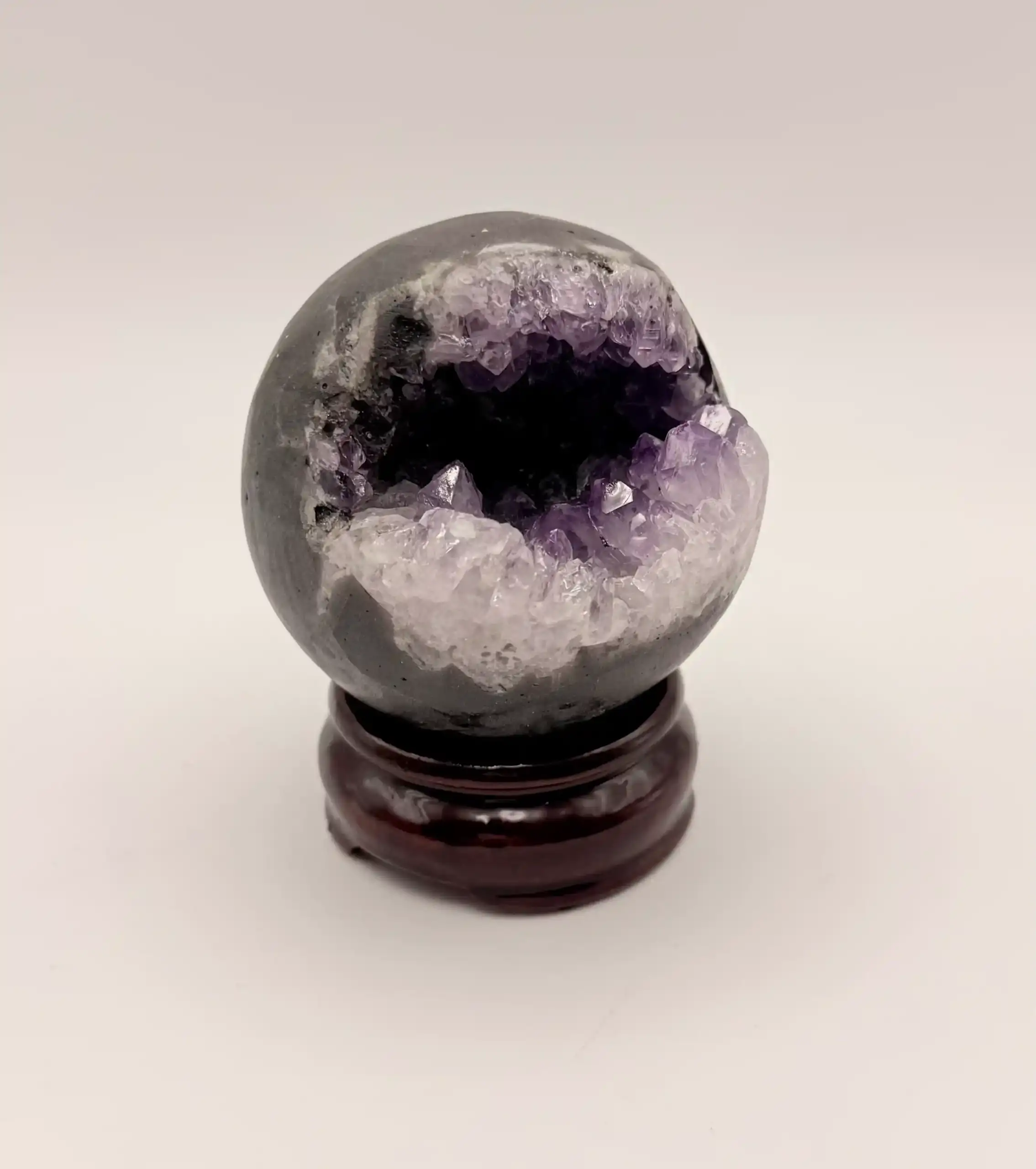 Geoda de amatista pulida. Las geodas de amatista poseen propiedades relajantes, protectoras y espirituales. Se utilizan para purificar el ambiente, promover la calma, aliviar el estrés, el insomnio y la ansiedad. Además, se cree que facilitan la meditación, mejoran la intuición, fomentan la claridad mental y el equilibrio emocional.