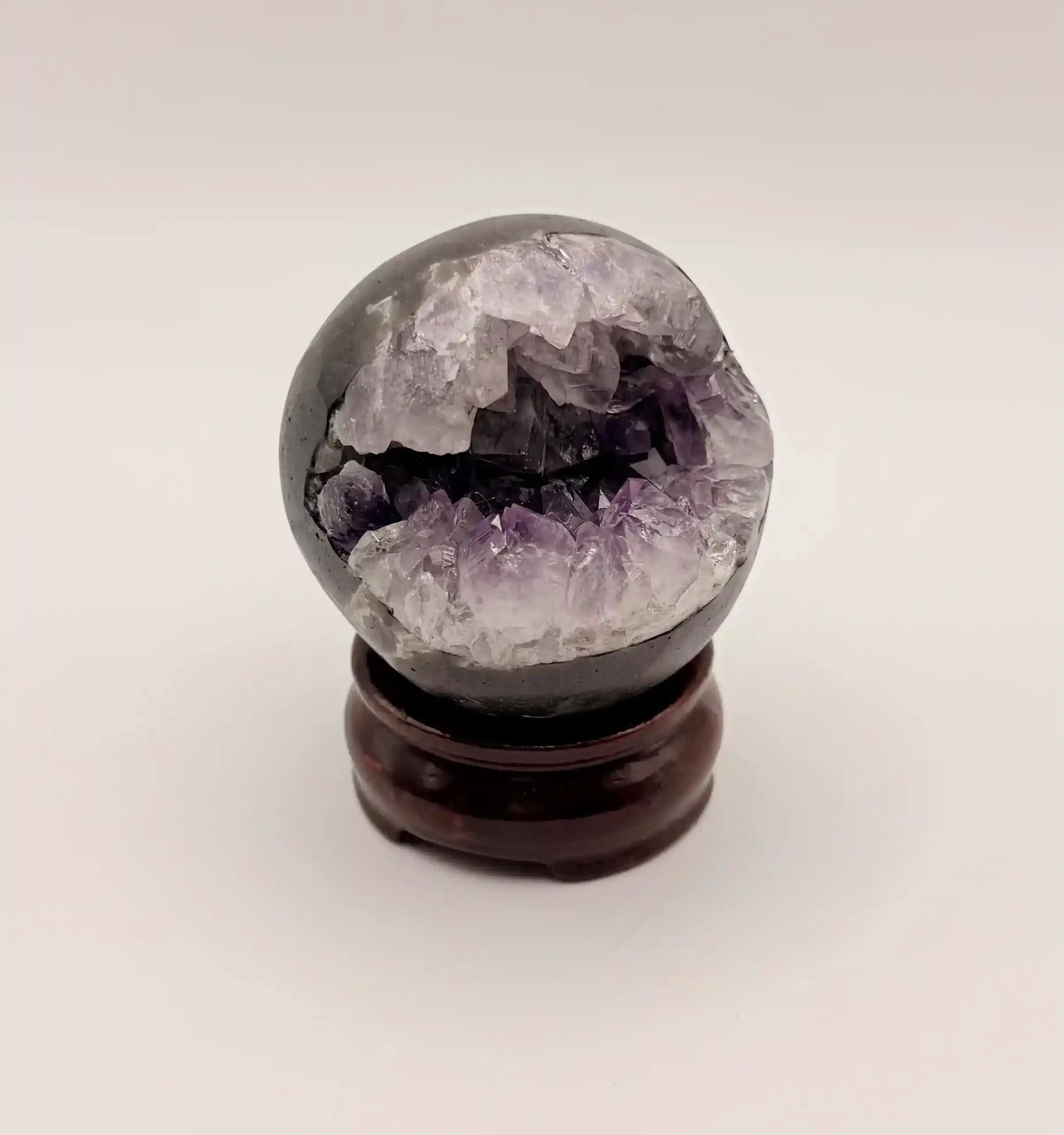 Geoda de amatista pulida. Las geodas de amatista poseen propiedades relajantes, protectoras y espirituales. Se utilizan para purificar el ambiente, promover la calma, aliviar el estrés, el insomnio y la ansiedad. Además, se cree que facilitan la meditación, mejoran la intuición, fomentan la claridad mental y el equilibrio emocional.