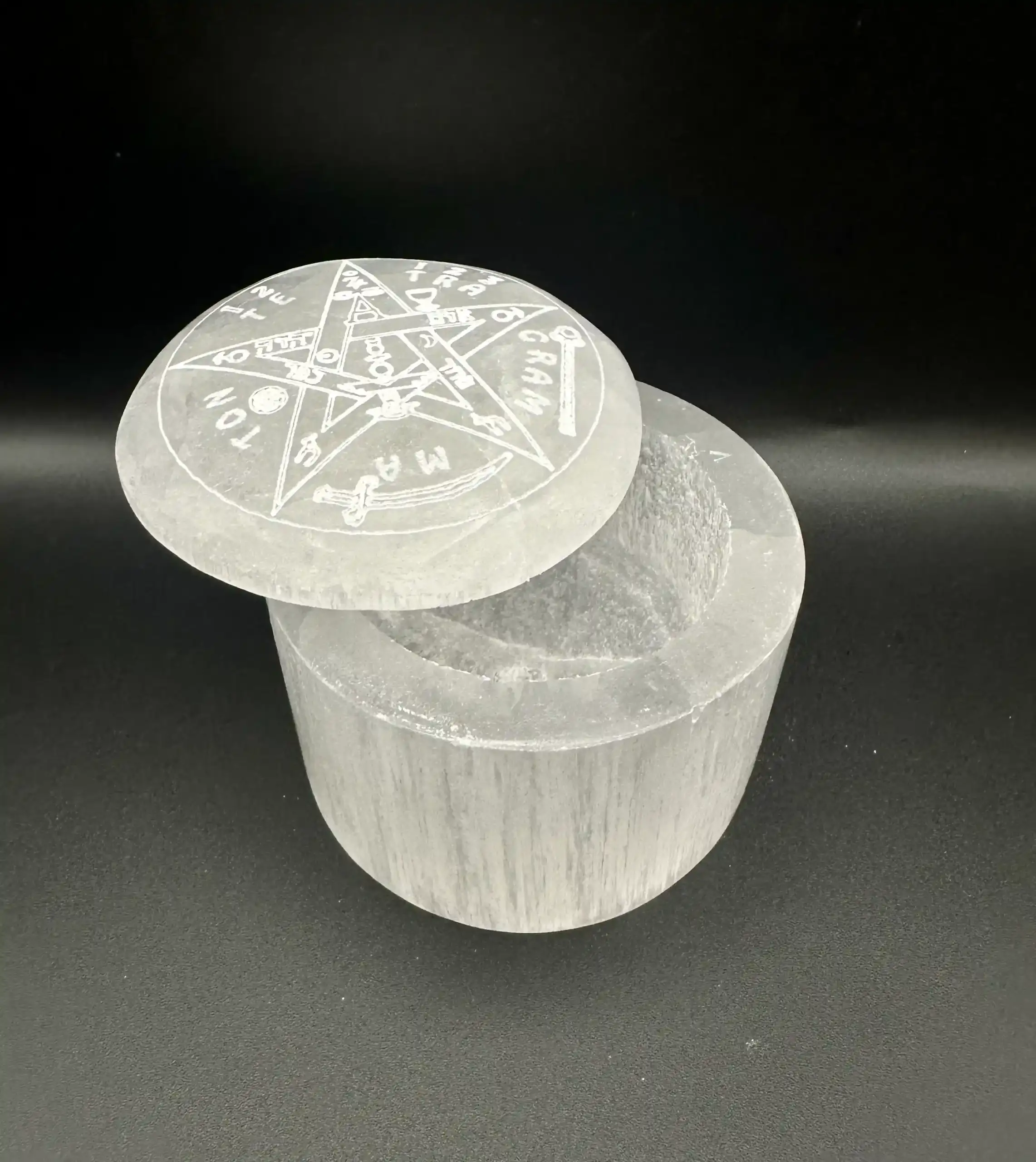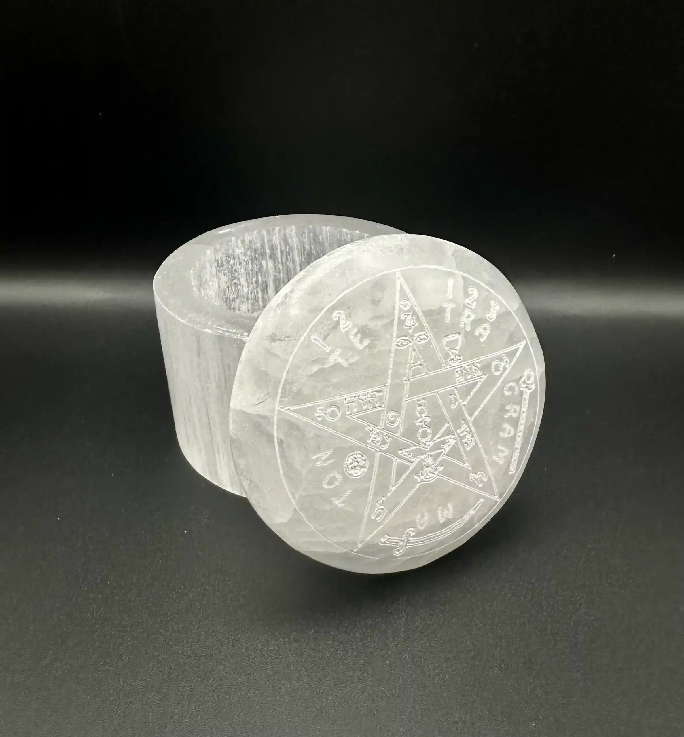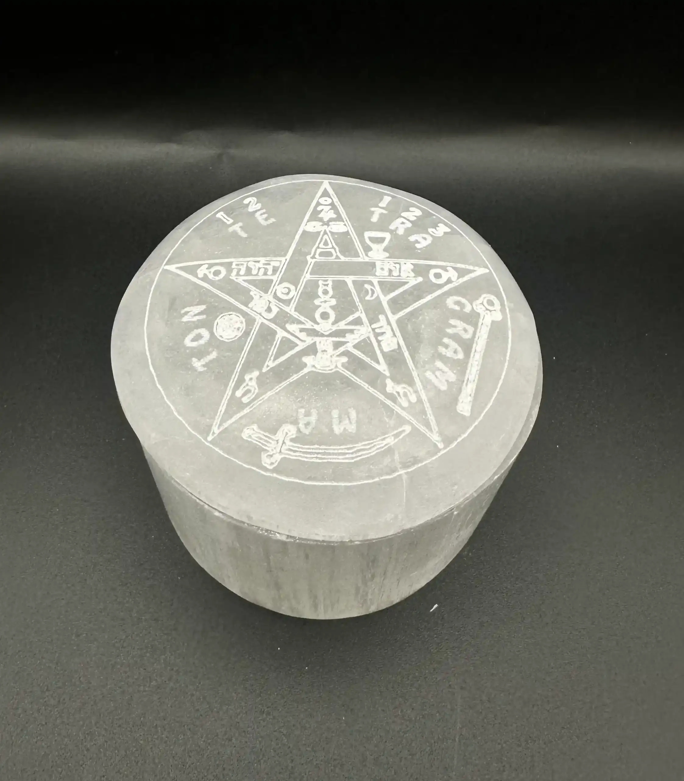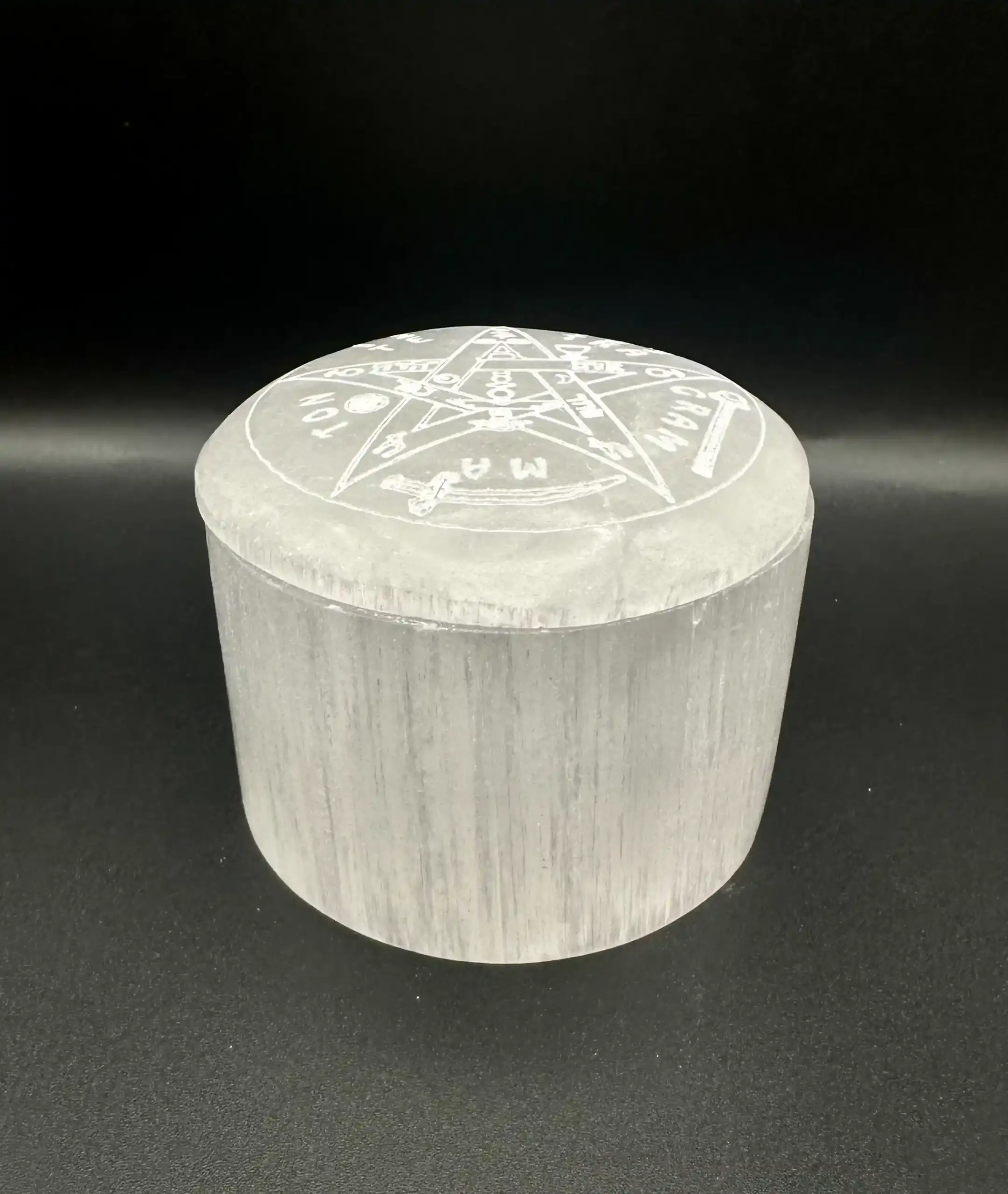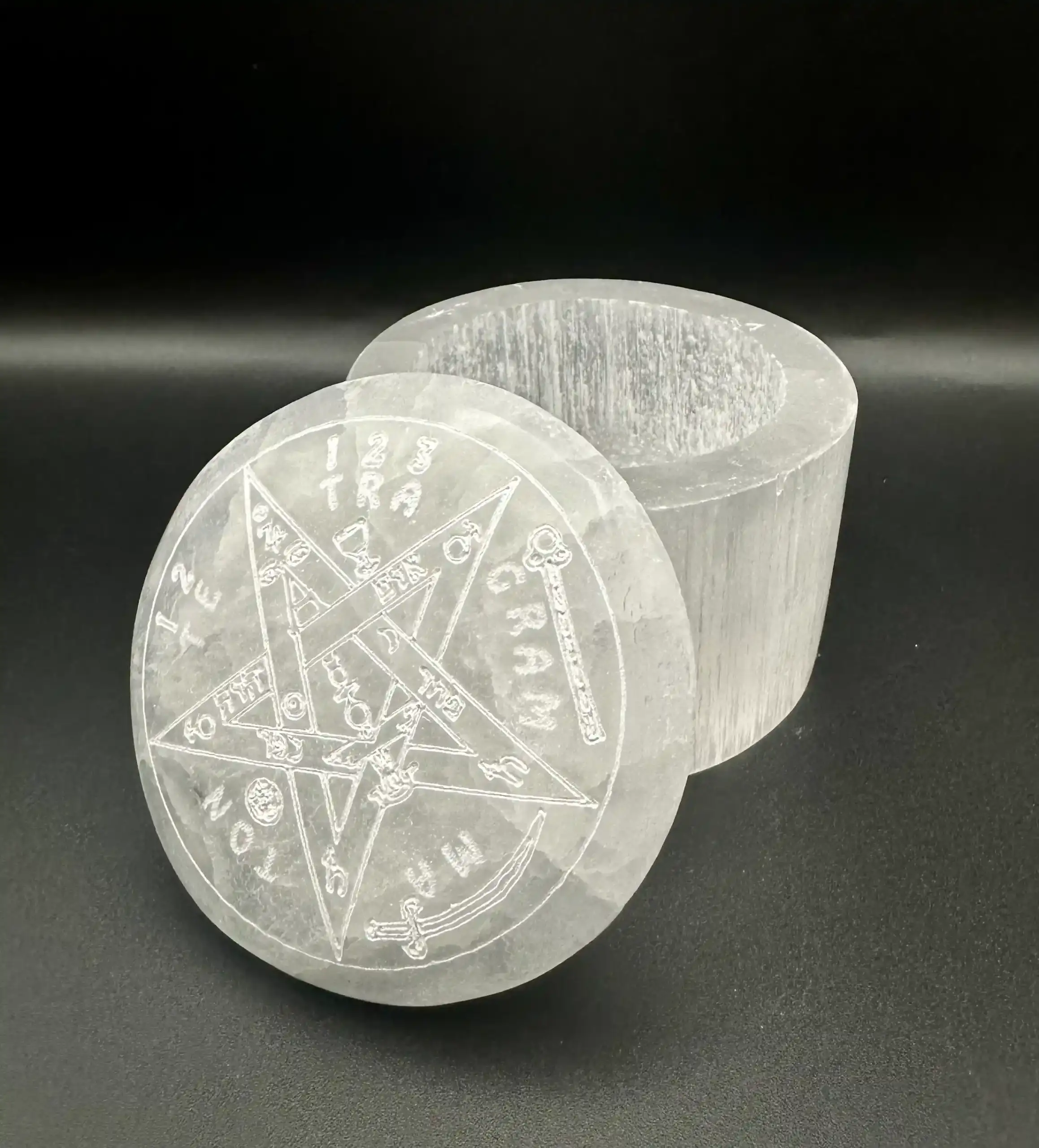 Joyero de selenita con el símbolo del Tetragramatón en la tapa.