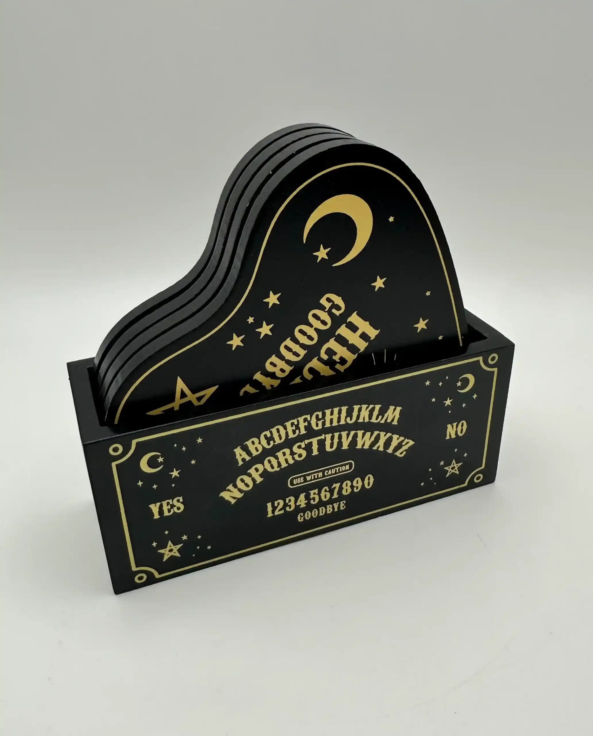 Dale un toque de conversación a tu mesa con este juego de 4 posavasos negros y dorados con un diseño de tablero Ouija. Los posavasos incluyen un soporte a juego para guardarlos de forma ordenada y fácil. Se limpian con un paño húmedo.