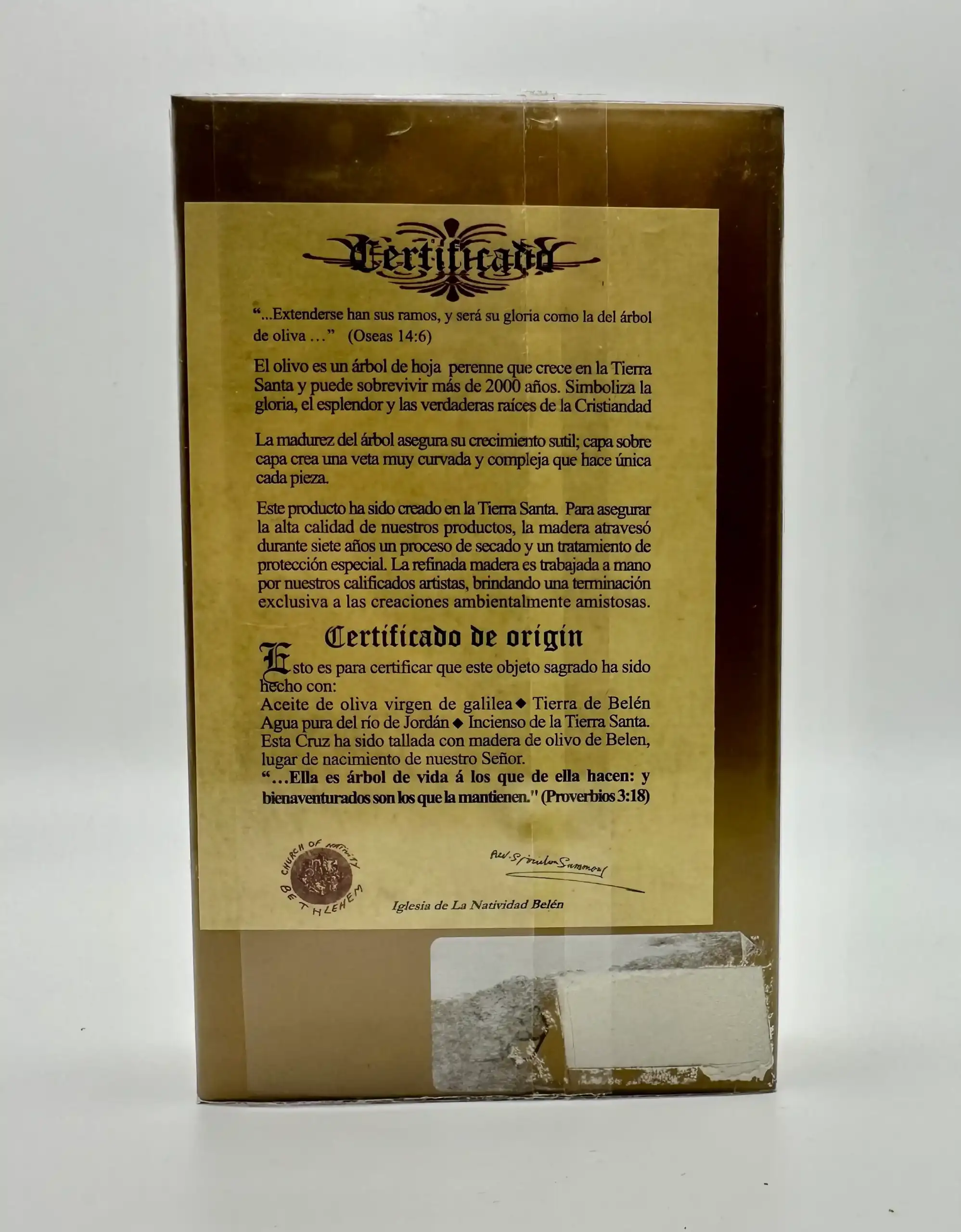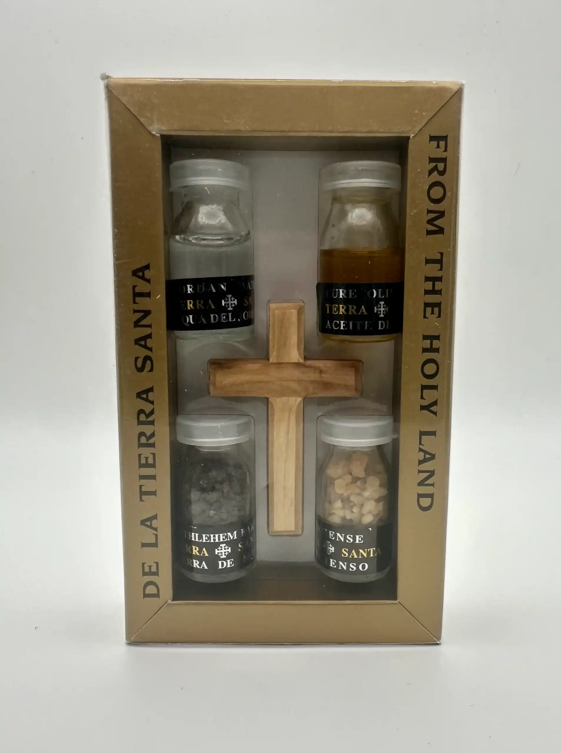 Este kit contiene una cruz de madera, un tarro de cristal con agua bendita, tierra santa, incienso y aceite para cortar mal de ojo.