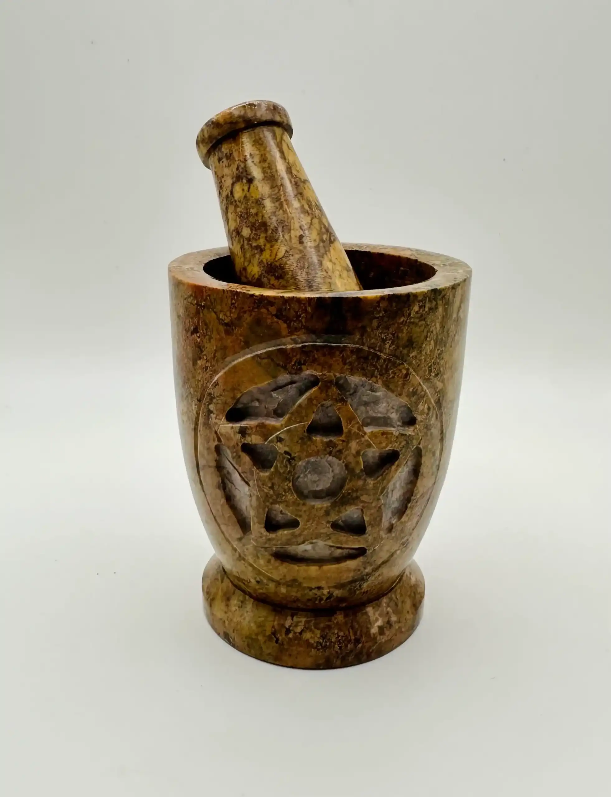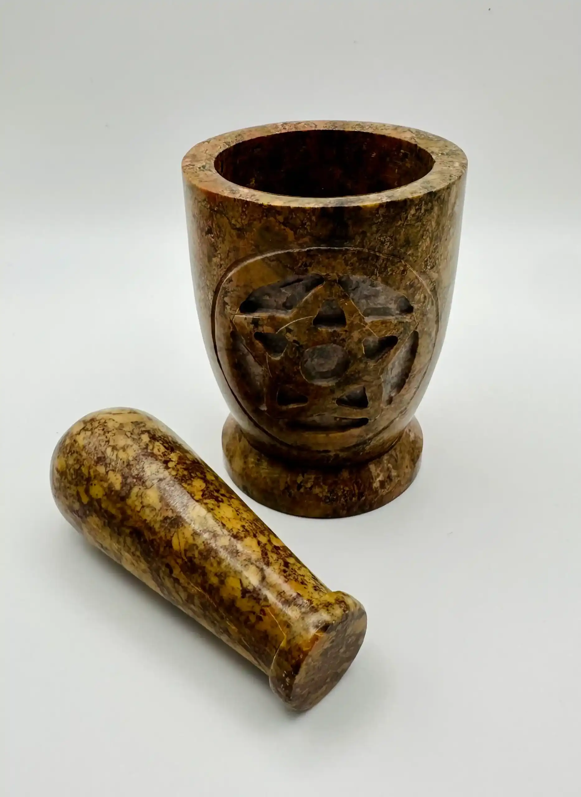 El mortero se usa para triturar y mezclar hierbas, inciensos y otras sustancias utilizadas en rituales. Se considera una herramienta fundamental para preparar ingredientes que se quemarán en un caldero, para crear polvos para rituales o para hacer pociones. A menudo se asocia con la magia, la brujería y la espiritualidad.