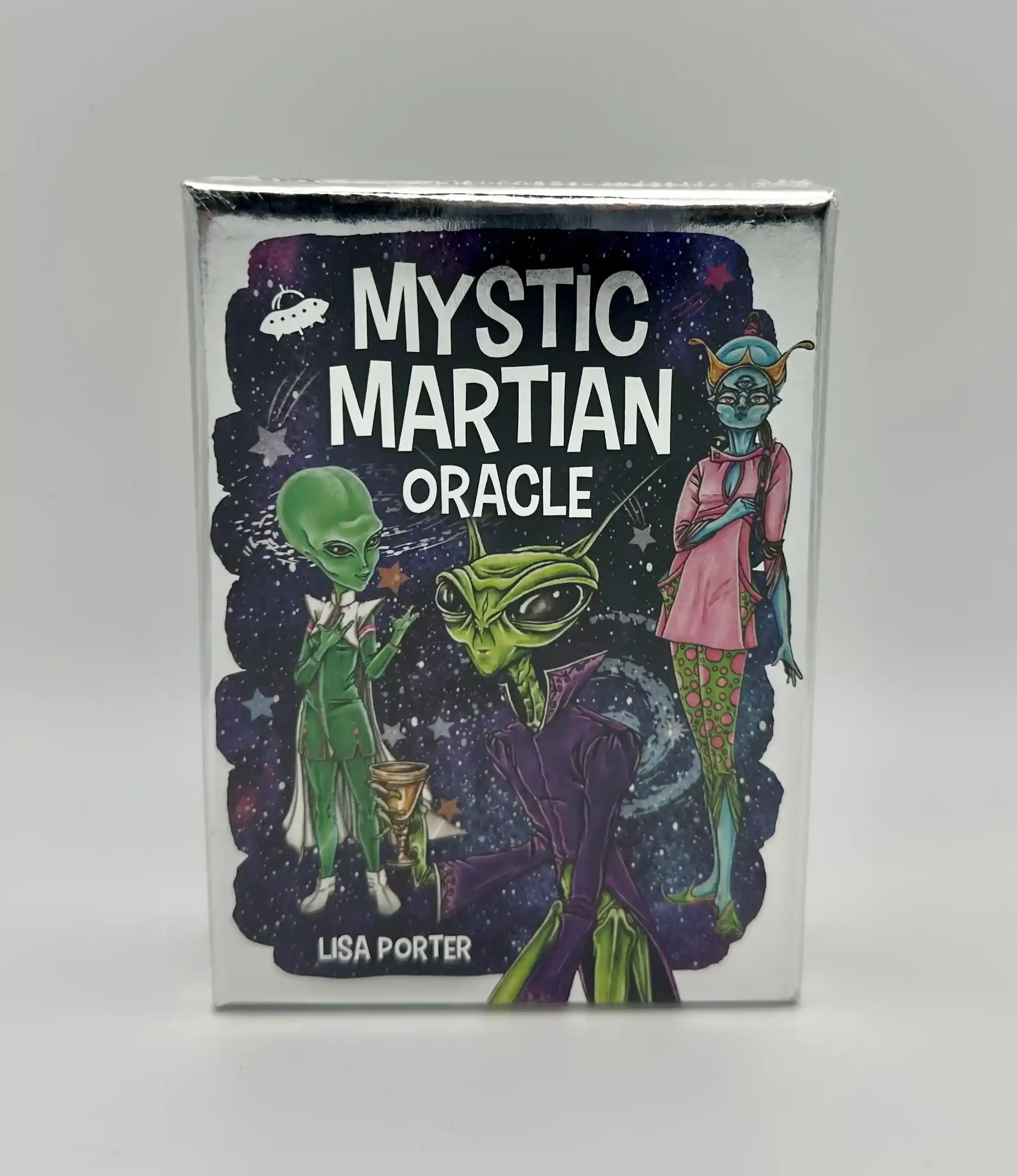 El Oráculo Mystic Martian es una baraja de cartas de 40 cartas de oráculo con ilustraciones de extraterrestres y arquetipos cósmicos, diseñada para la auto-reflexión y la búsqueda de orientación. Cada carta representa un arquetipo simbólico que ayuda a explorar la intuición, la conexión con el cosmos y el autoconocimiento a través de simbolismo alienígena y «semillas estelares».