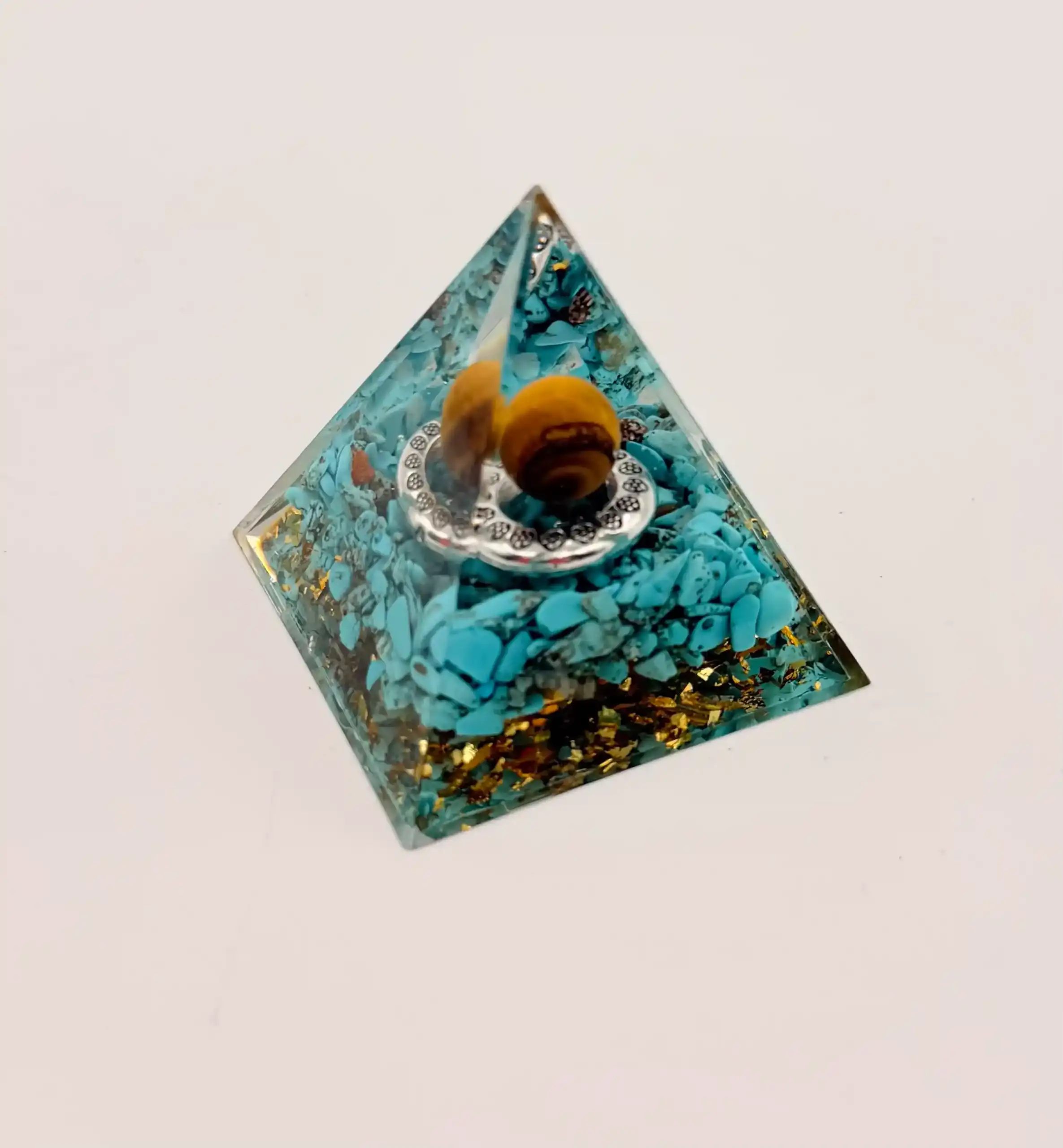 La orgonita es una composición hecha a mano de cristal, resina y metal para proteger contra las radiaciones que pueden ser dañinas como las electromagnéticas y otros tipos de contaminación energética y radiación. Esta orgonita contiene turquesa que se asocia con el tercer ojo: la intuición. Y es que se cree que la piedra turquesa potencia la meditación e intuición, aportando una energía suave y fresca. También es considerada una piedra sanadora y protectora.