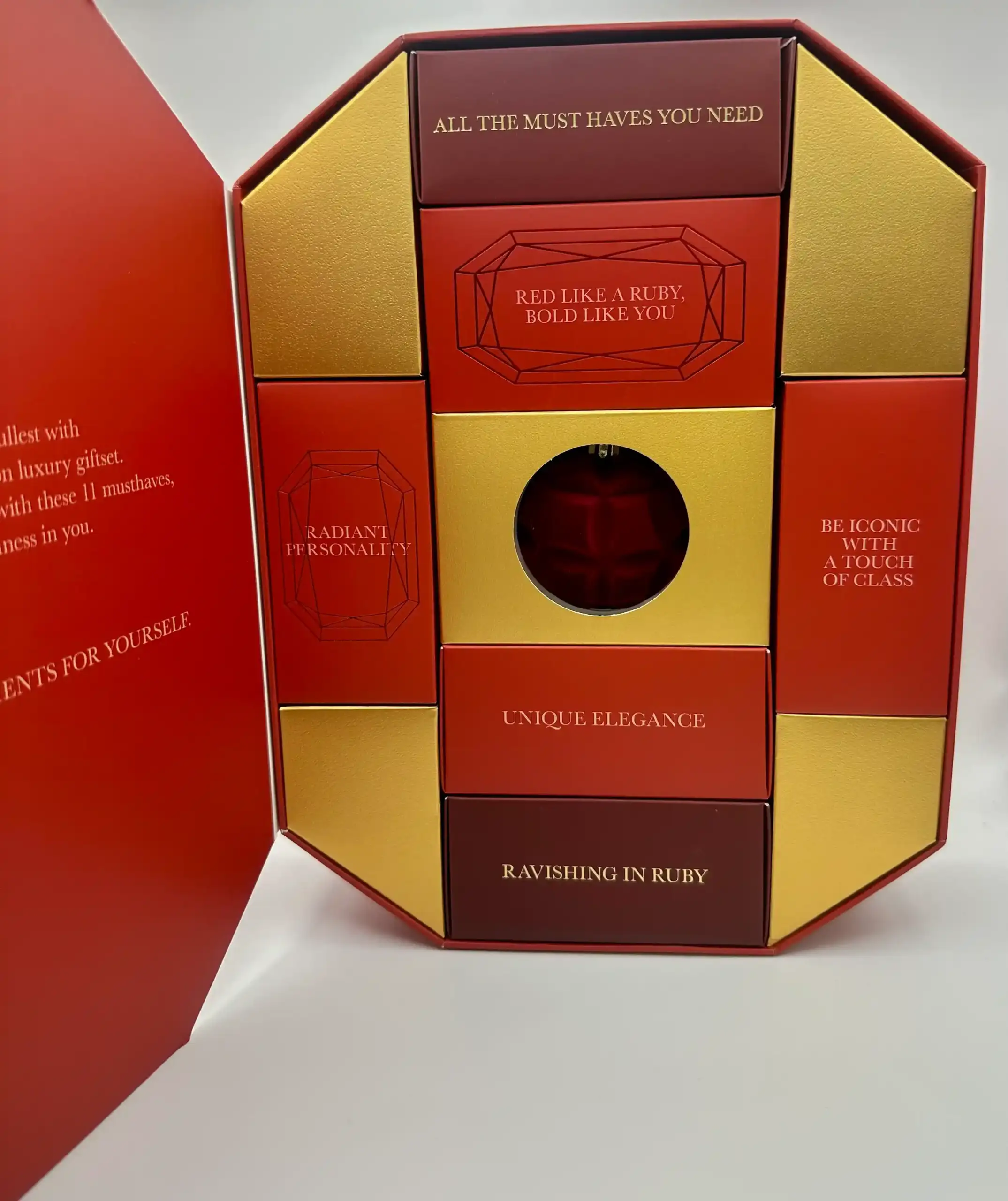 Contiene: Crema de manos, aceite corporal, exfoliante corporal, gel de ducha, manteca corporal, jabón con forma de flor, bola de navidad aterciopleada, bruma para cuerpo y cabello, mascarilla para el cabello, vela perfumada y un guante exfoliante.