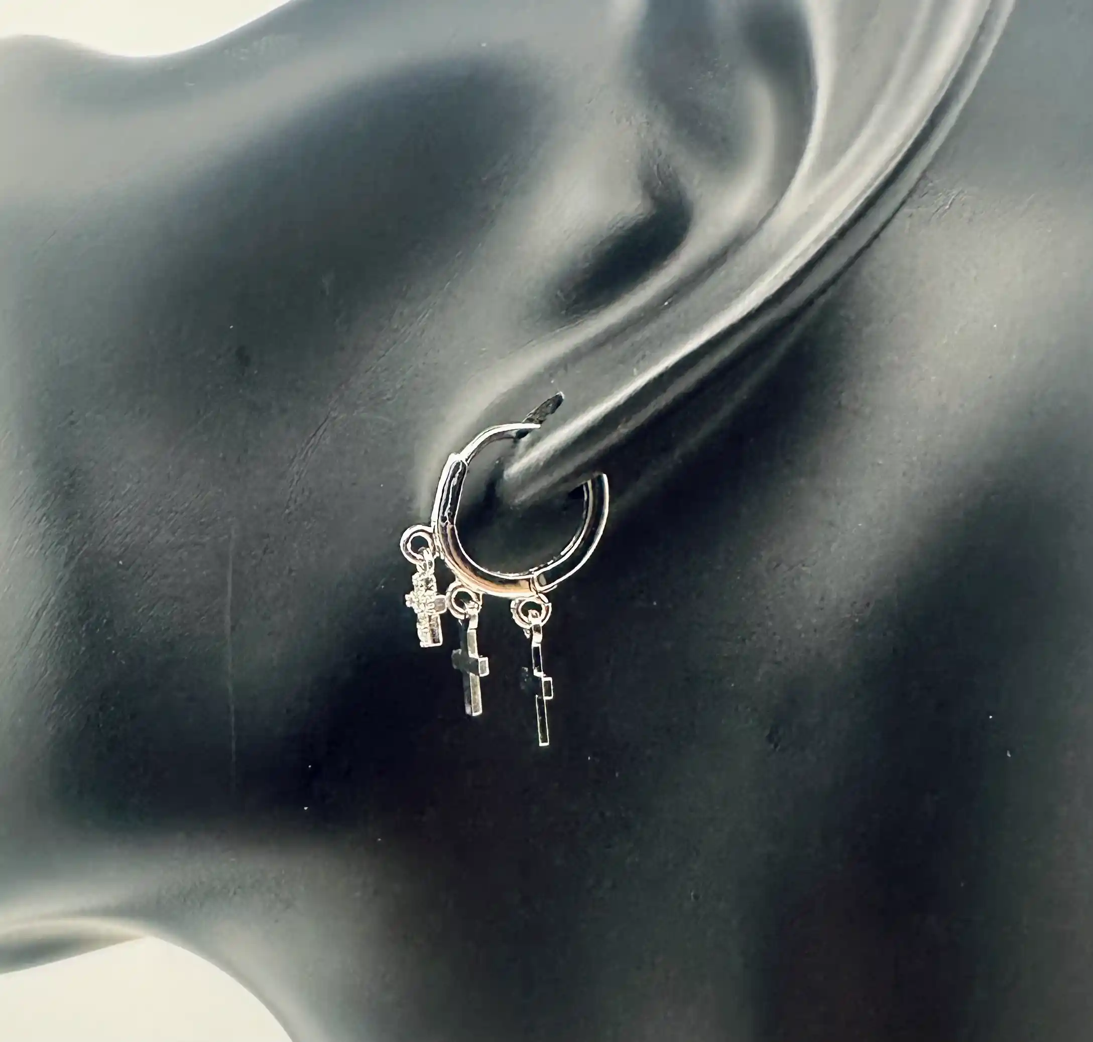 Pendiente de acero inoxidable con 3 cruces, la primera con piedrecitas brillantes. Las 3 cruces a menudo se refieren a la Santísima Trinidad (Padre, Hijo y Espíritu Santo).
