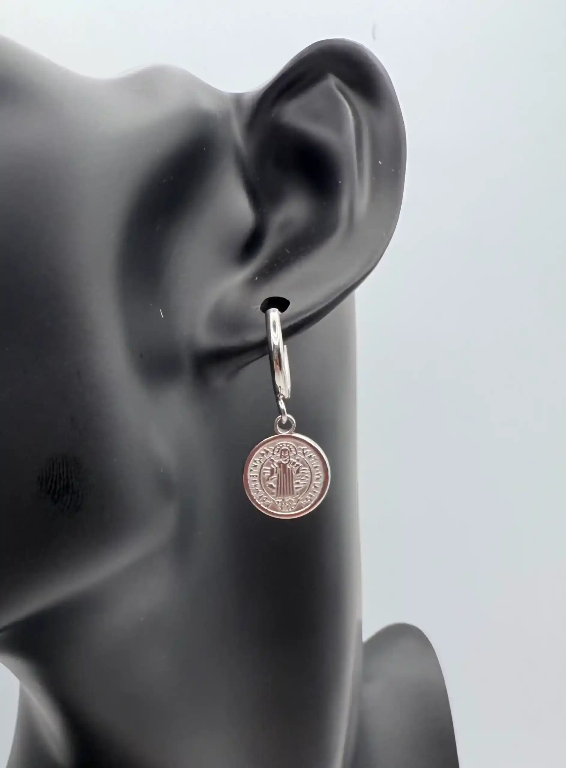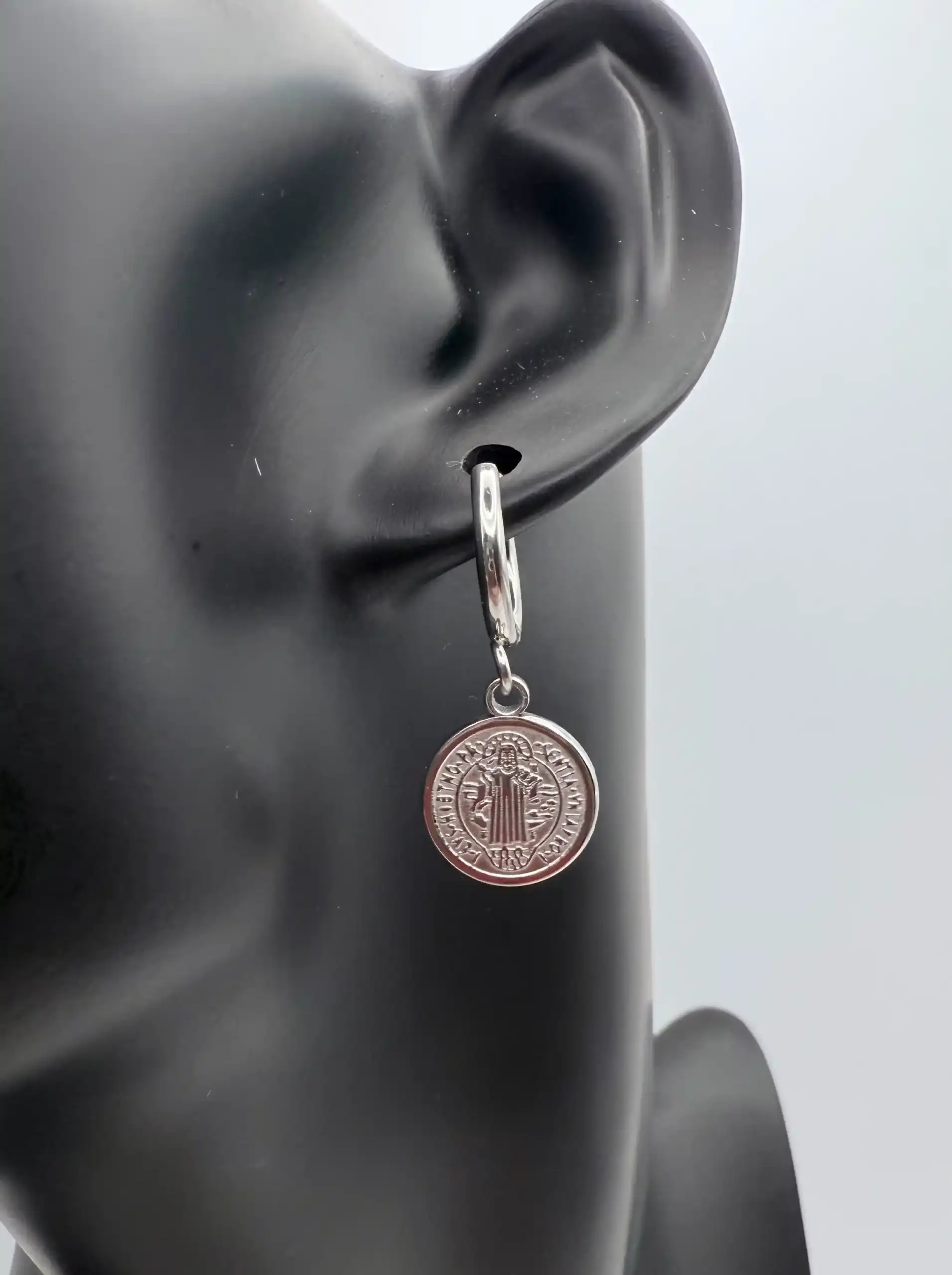 Pendientes de aro en acero plateado con medalla de San Benito, es una de las medallas más antiguas de la cristiandad de Jesús y se atribuye a quien la porta poder contra el mal. Este símbolo es una potente protección ancestral que actúa como escudo frente a energías negativas.
