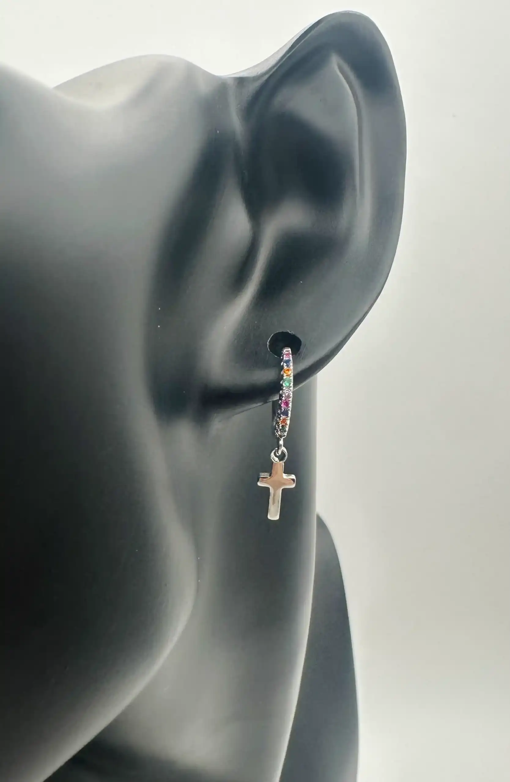 Pendientes de aro con cruz en acero plateado y piedrecitas de colores