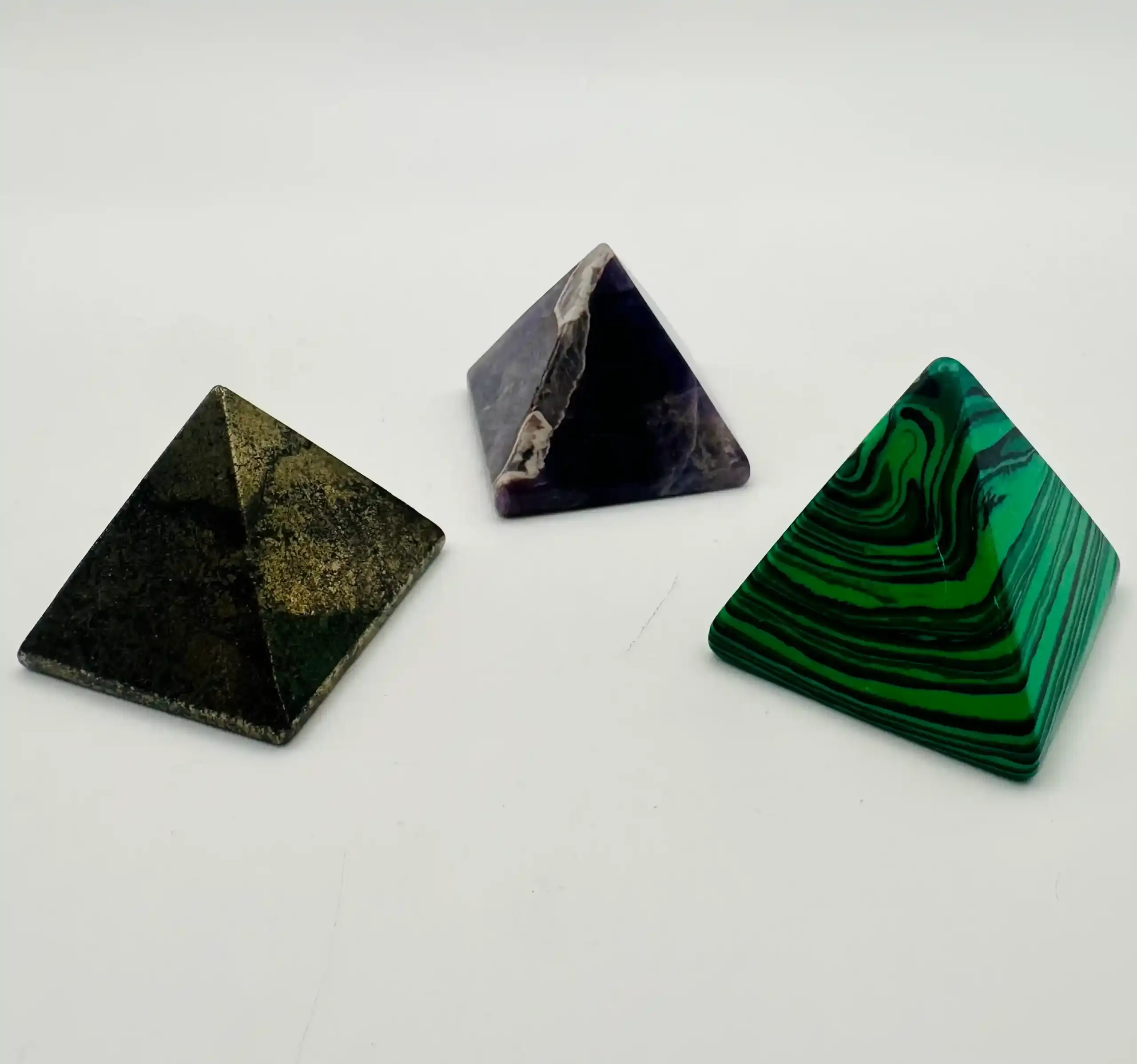 La pirámide de pirita se utiliza para atraer prosperidad y riqueza, proteger contra energías negativas y aumentar la confianza y la creatividad. La pirámide de amatista se usa en esoterismo para la protección energética, la purificación espiritual y la meditación. La pirámide de malaquita tiene usos para la protección energética, al actuar como un escudo contra energías negativas, y para la transformación personal y emocional, ayudando a superar miedos y traumas pasados.