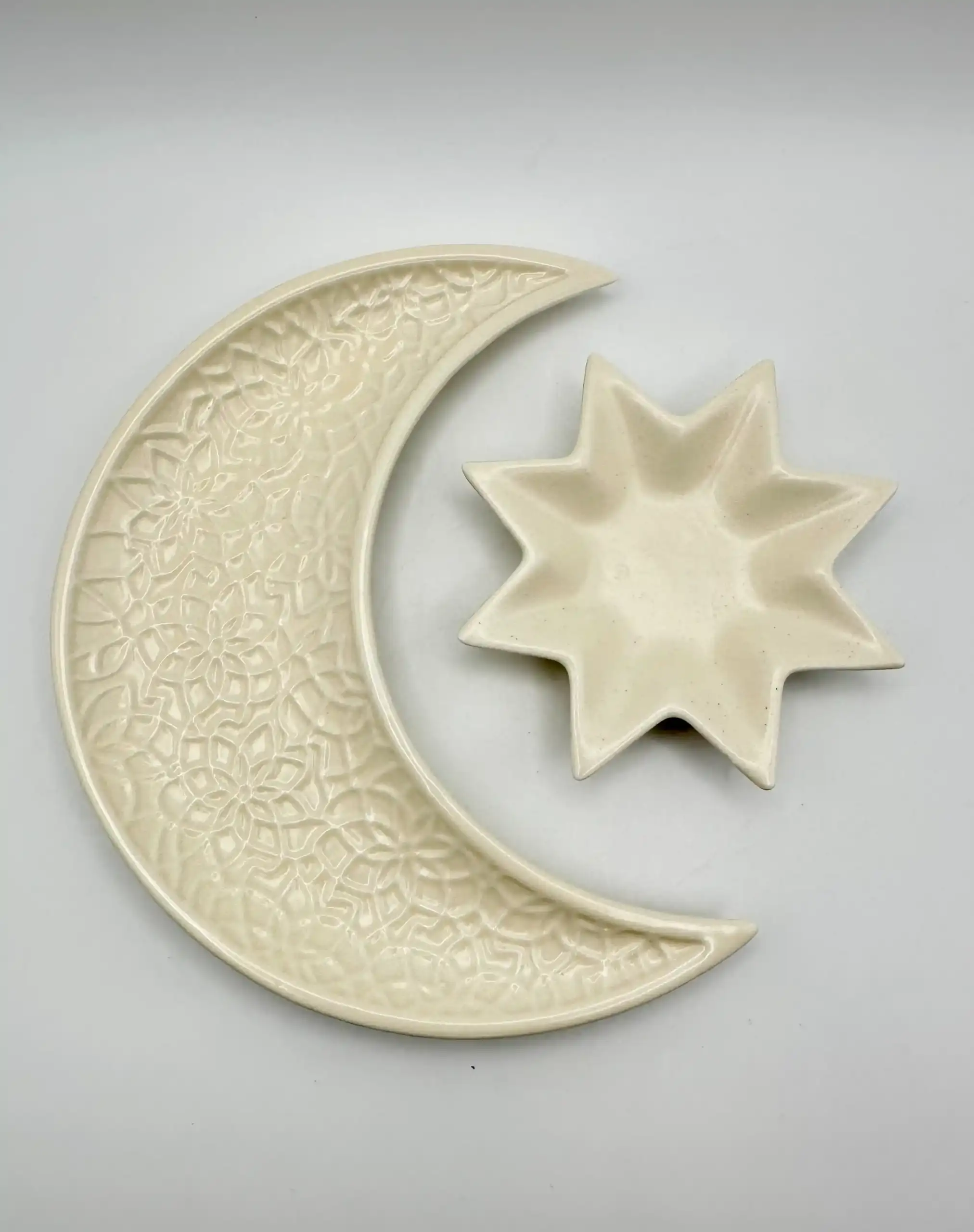 Este elegante juego de platos de cerámica incluye un diseño de media luna y uno de estrella, ideal para guardar joyas, pequeños detalles o decoración de mesa. Con un sutil esmalte crema y detalles en relieve.