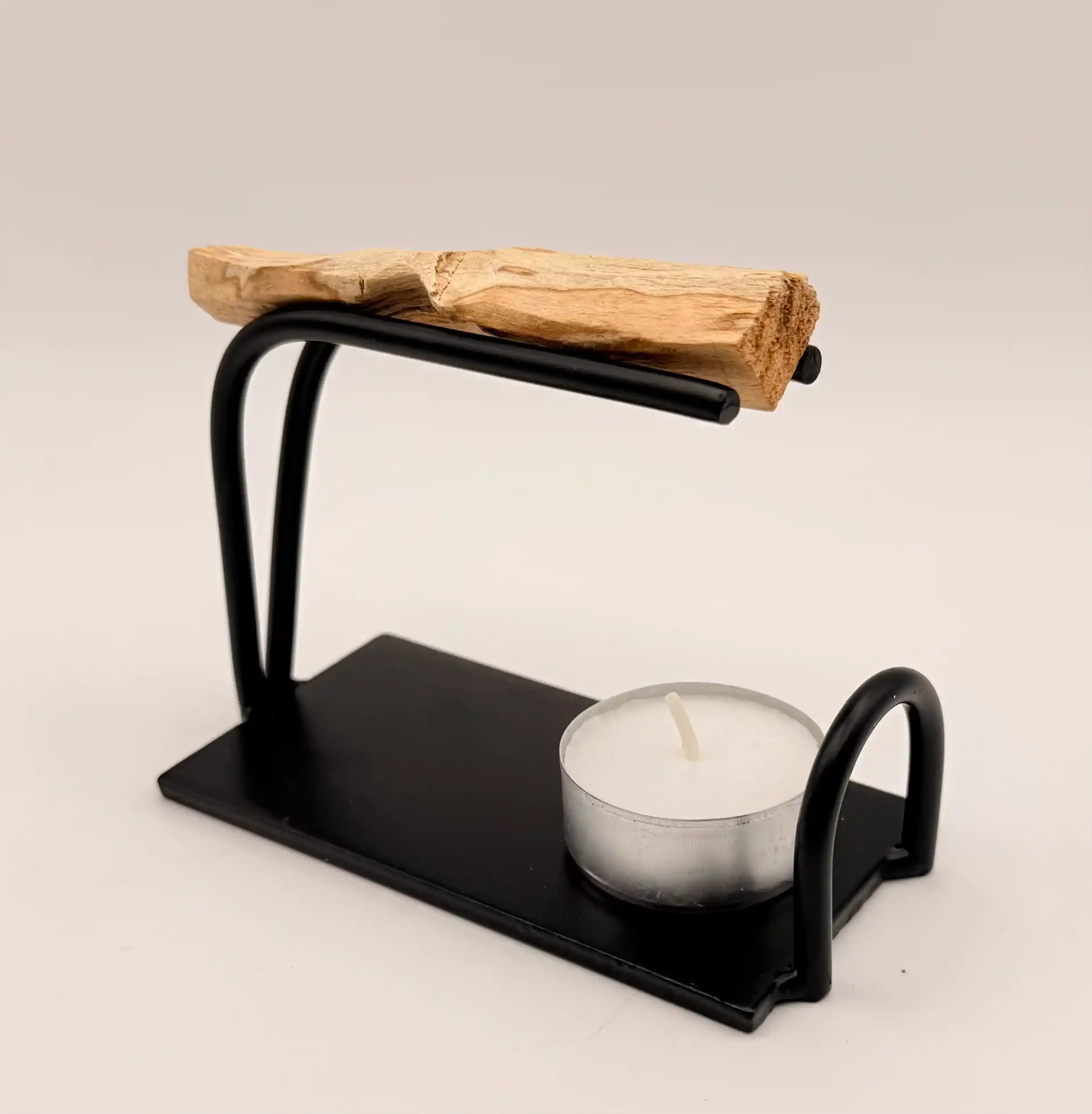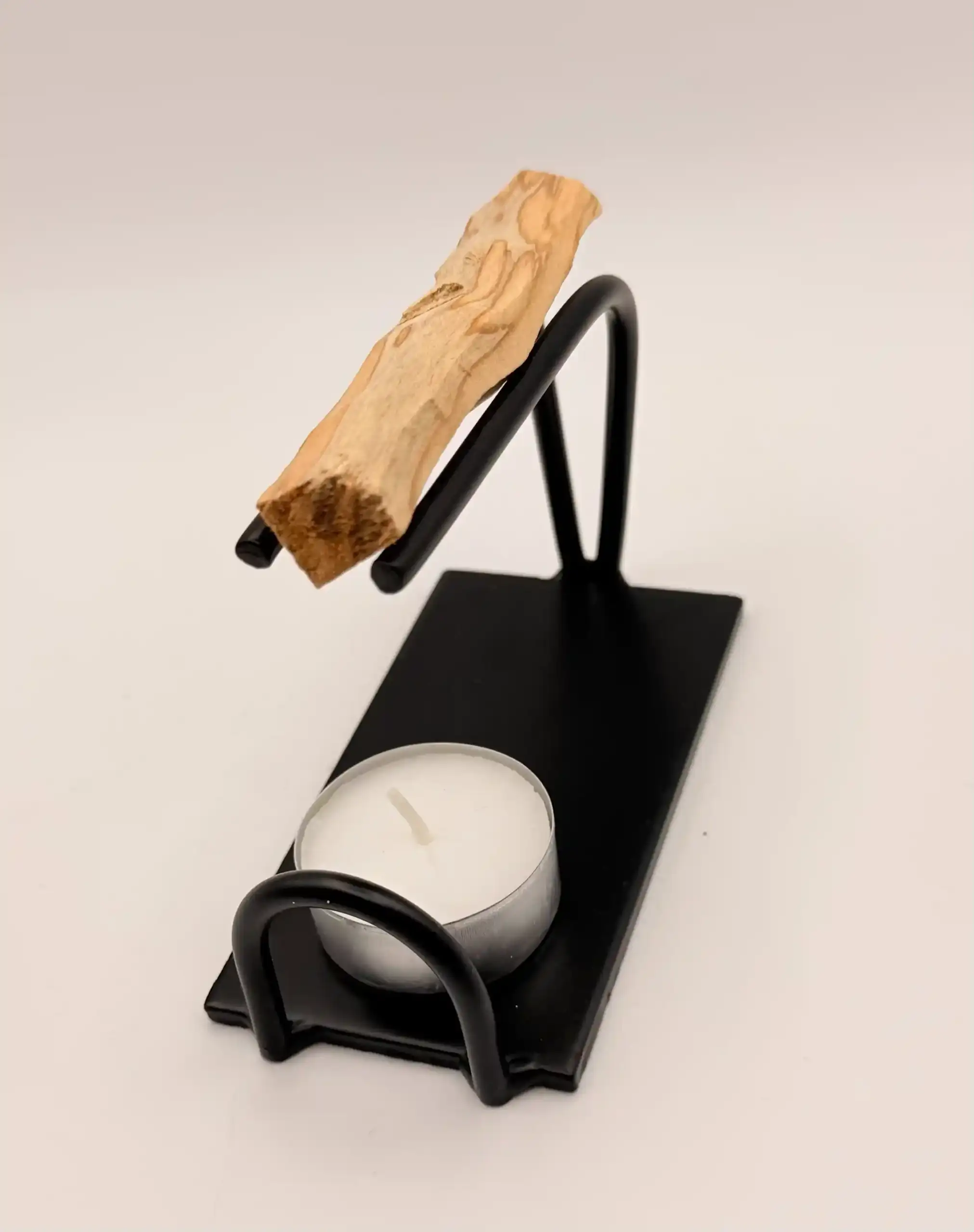Porta palo santo de hierro negro, incluye vela y palo santo.