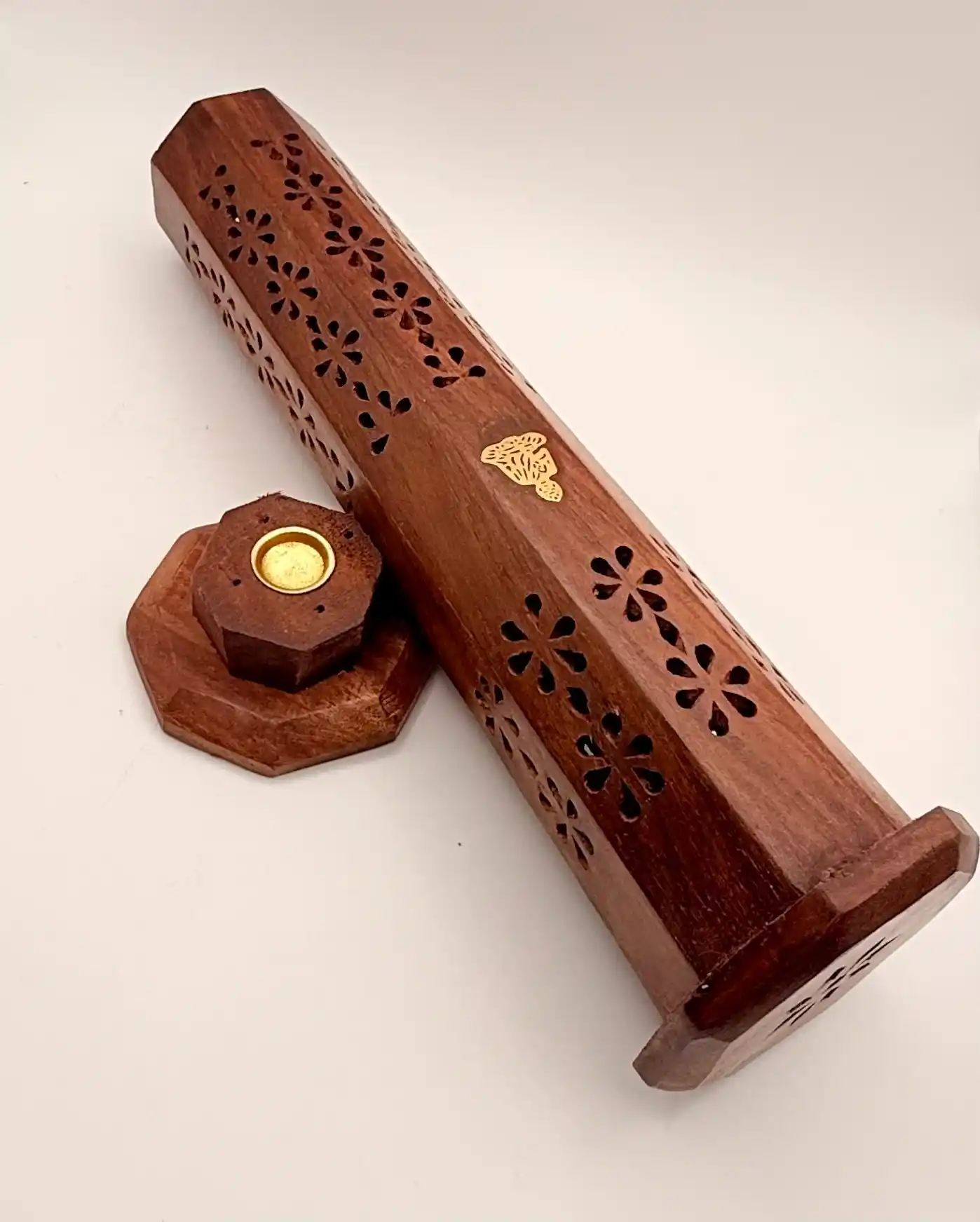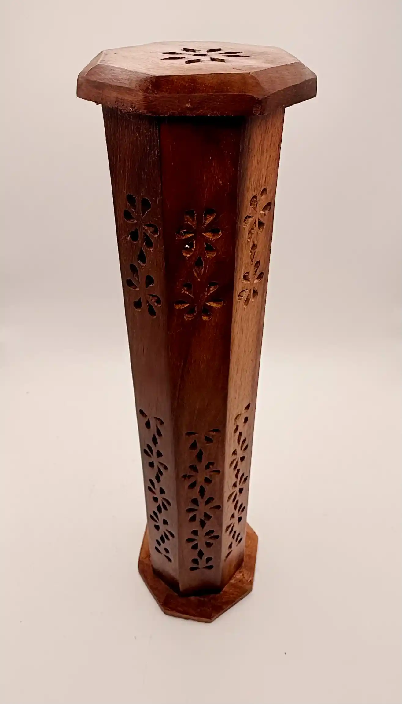 Portaconos de madera hexagonal con el dibujo de Buda en dorado. Mide 30 cm de alto.