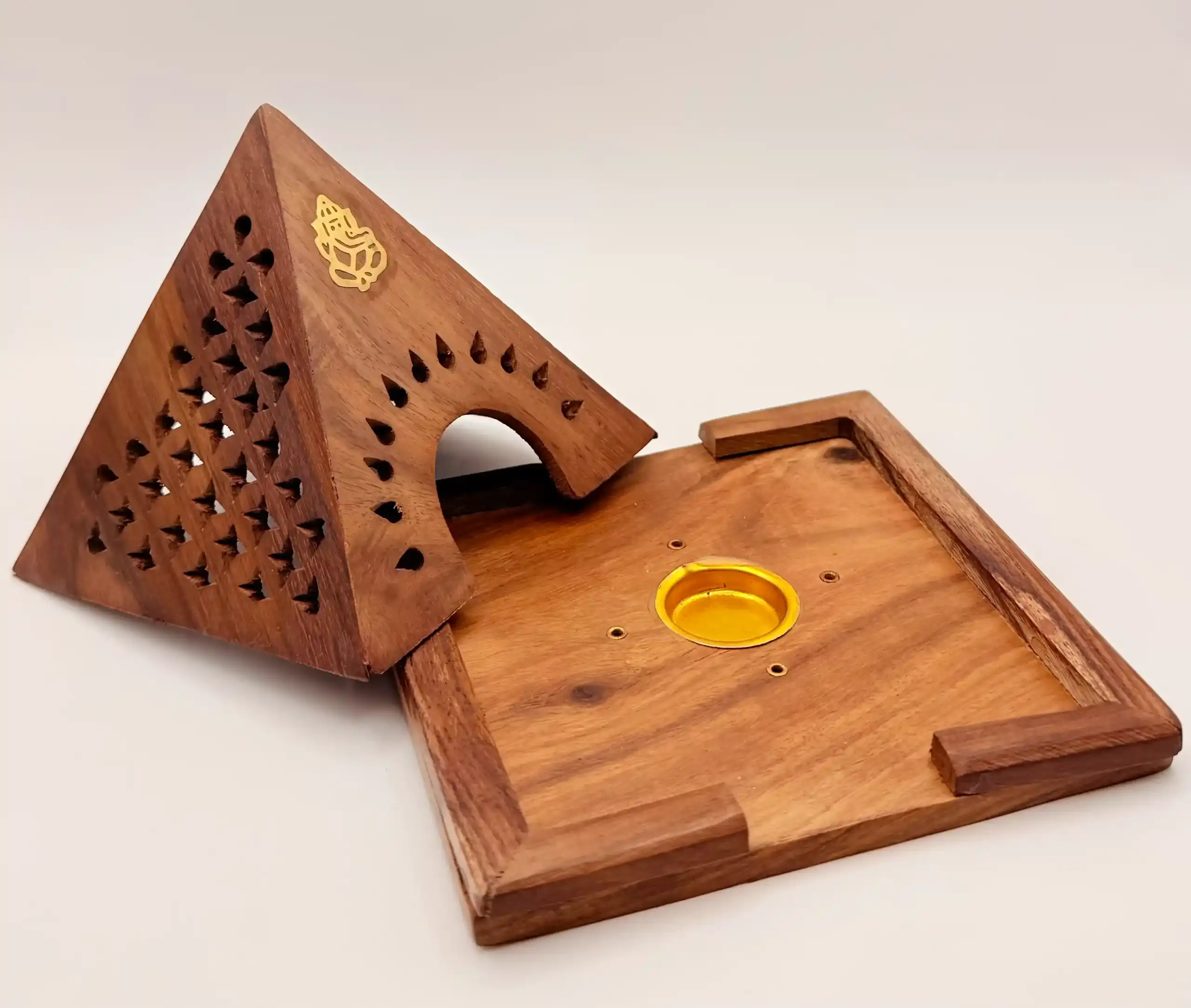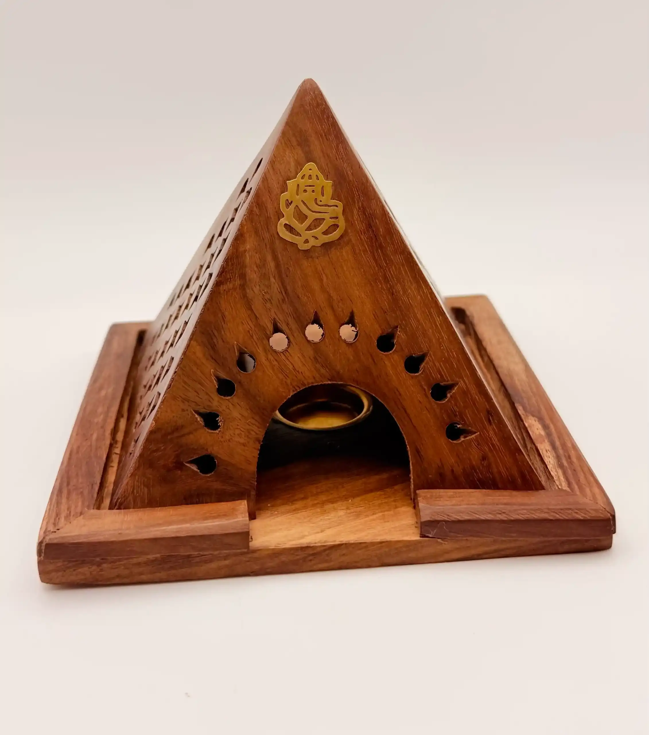 Portaconos de madera en forma de pirámide con el dibujo de Ganesha en dorado. Mide 10 cm de alto.