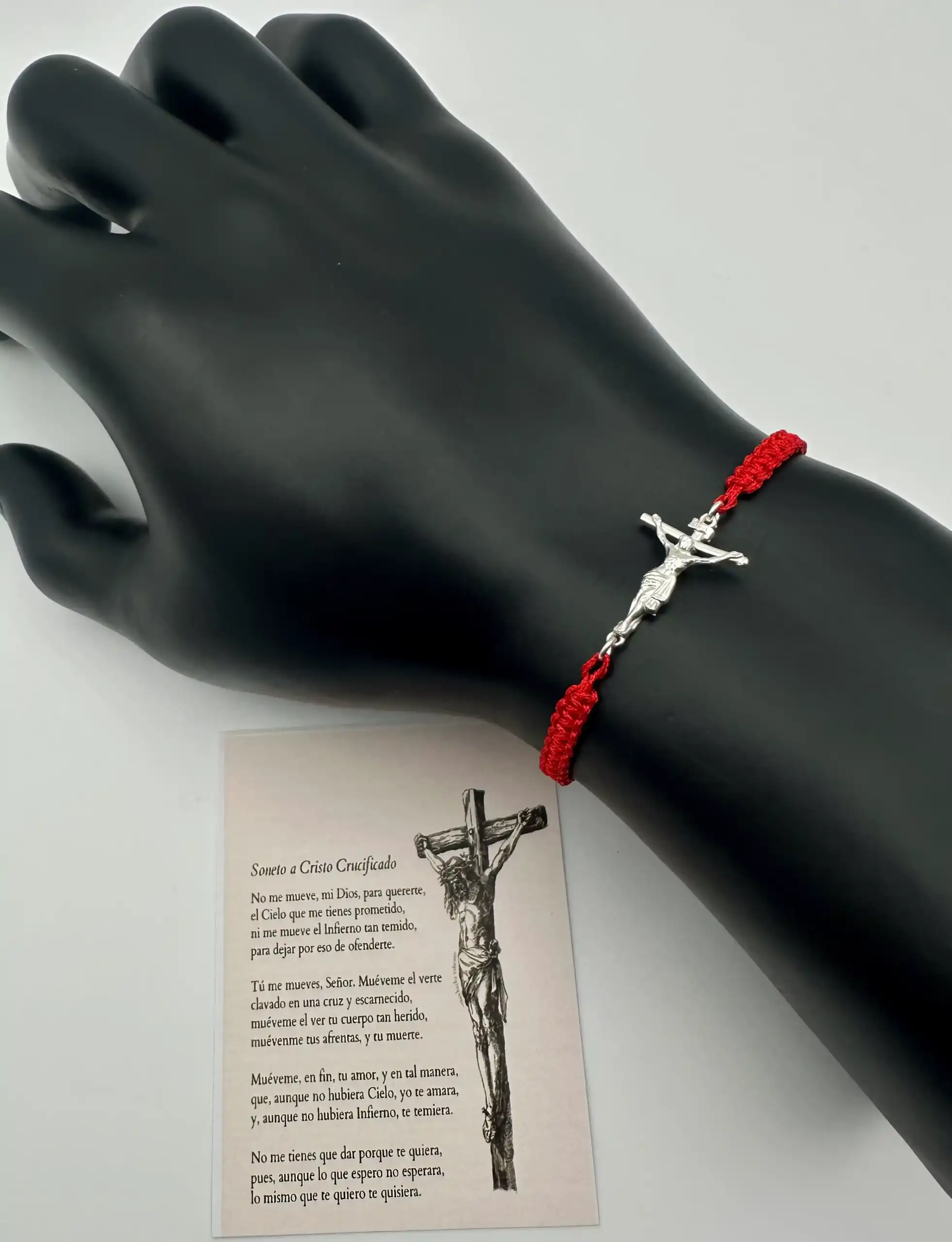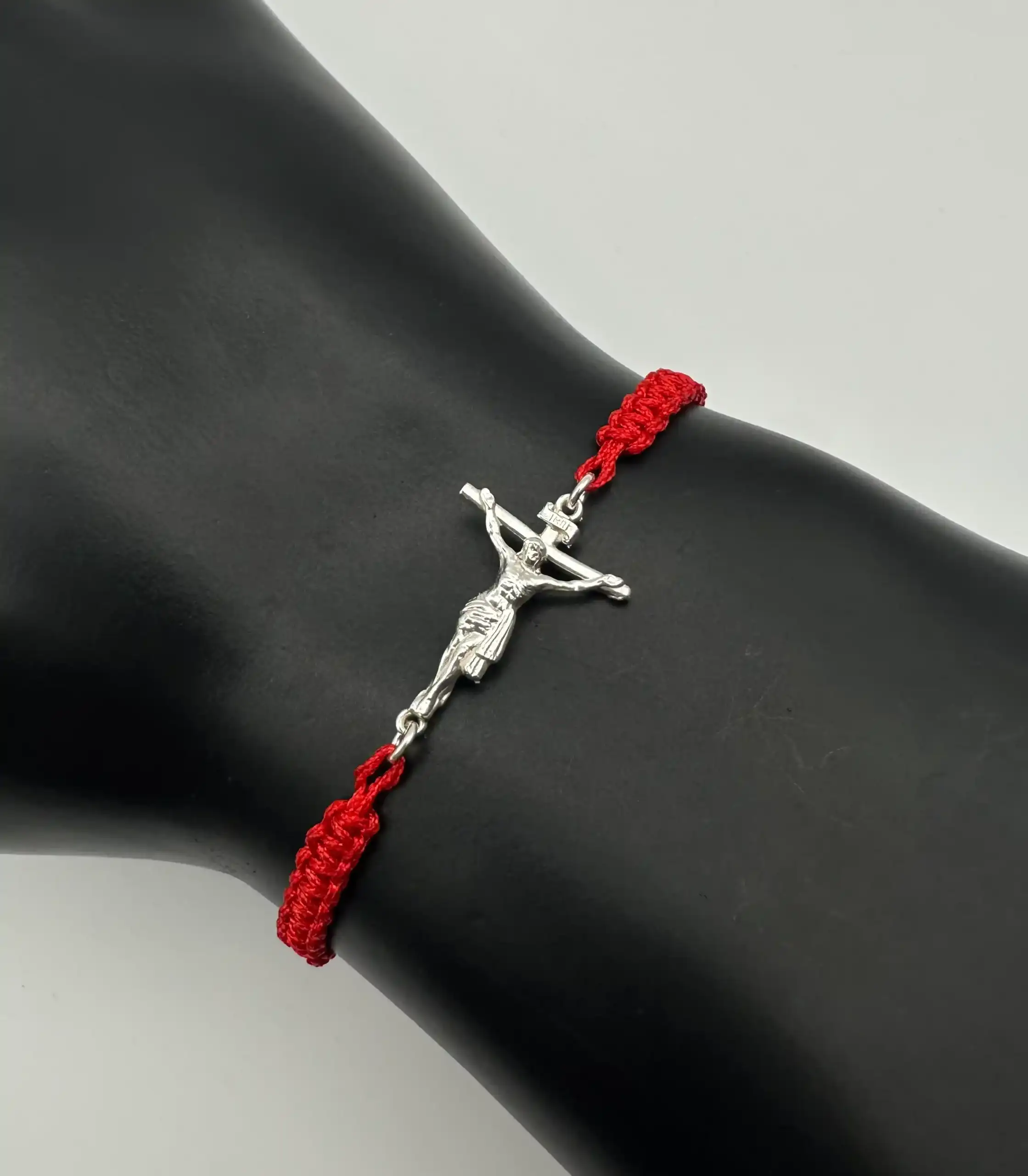 Pulsera Cristo En La Cruz Macrame Rojo Plata De Ley