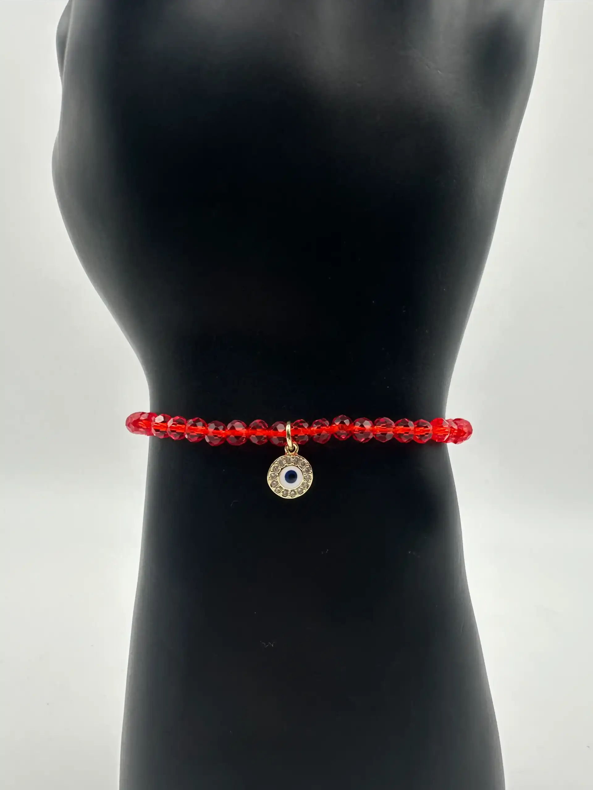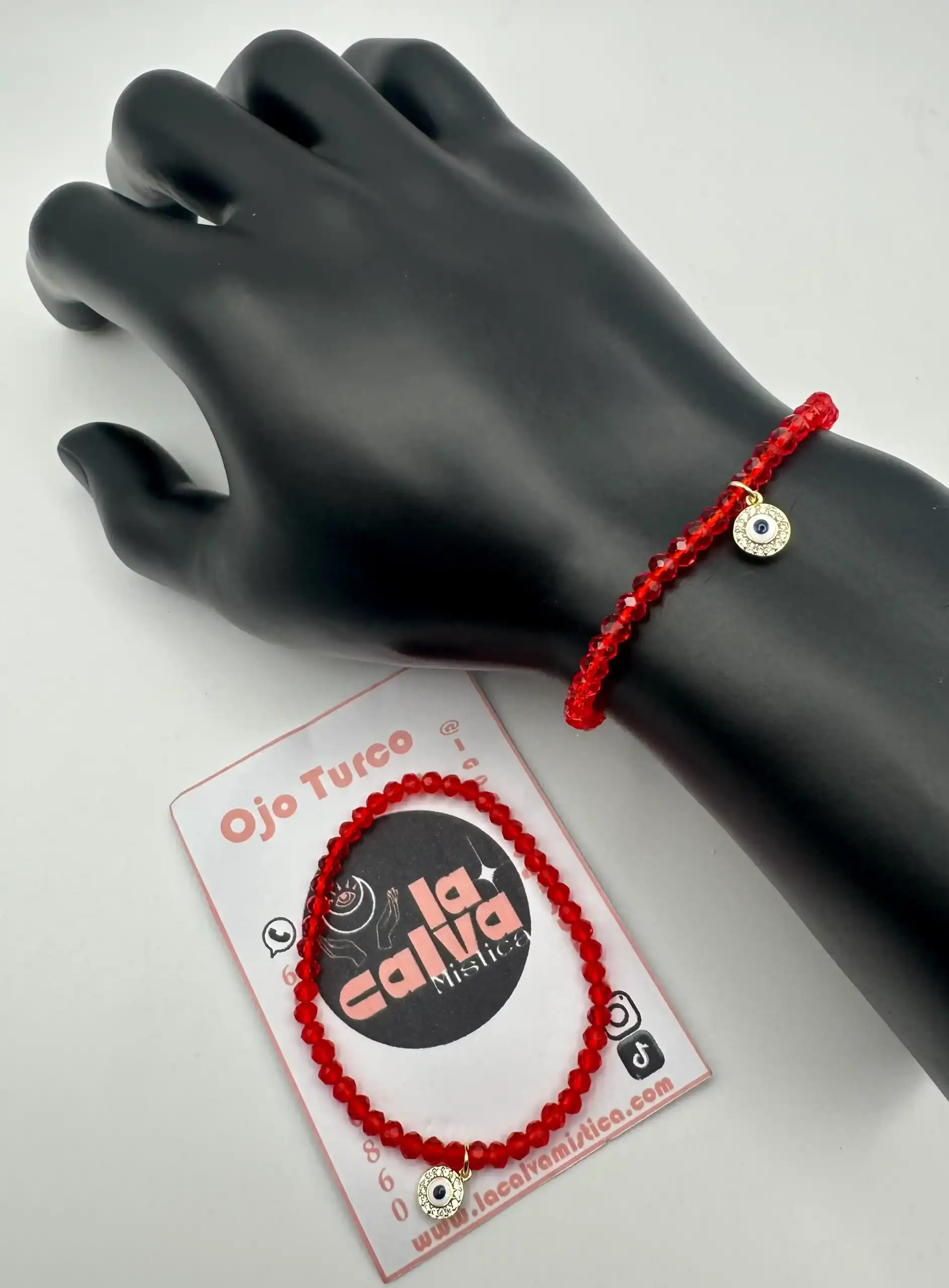 Esta pulsera combina ambos elementos(color rojo y ojo turco), esta combinación potencia el efecto de protección bloqueando envidias y malas energías.