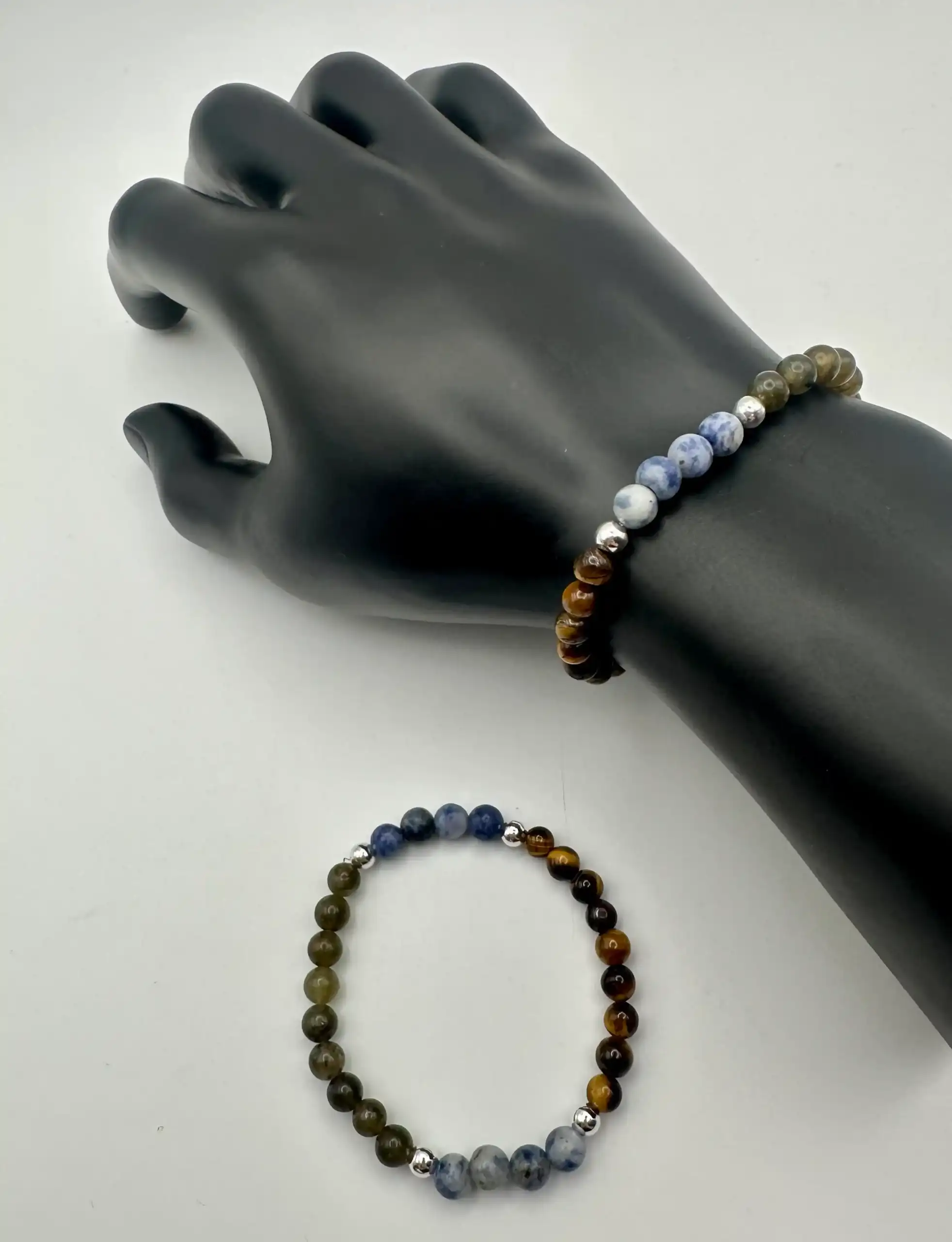 La labradorita se asocia con la intuición y la protección espiritual, ayudando a elevar la conciencia y a mantener un estado mental equilibrado. El ojo de tigre ofrece protección contra energías negativas, promueve la confianza en uno mismo, la prosperidad y la toma de decisiones. La sodalita fomenta el trabajo en equipo, la lógica y la comunicación. Juntas te llevarán al camino del éxito en el ámbito laboral.