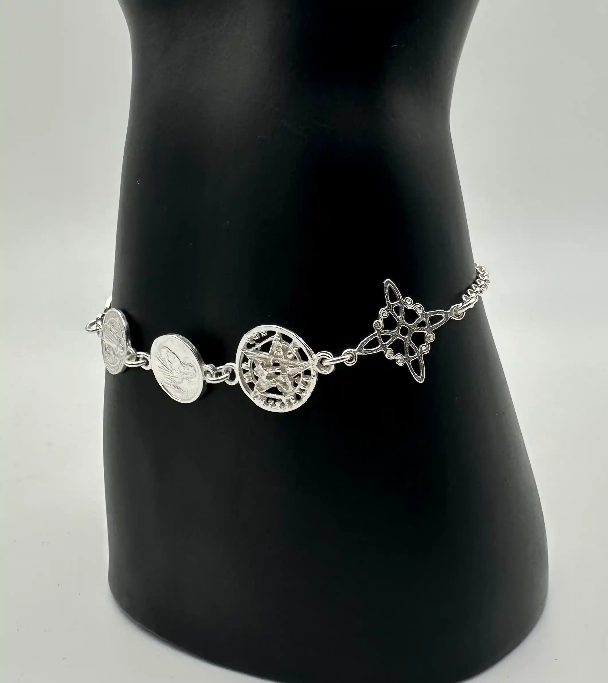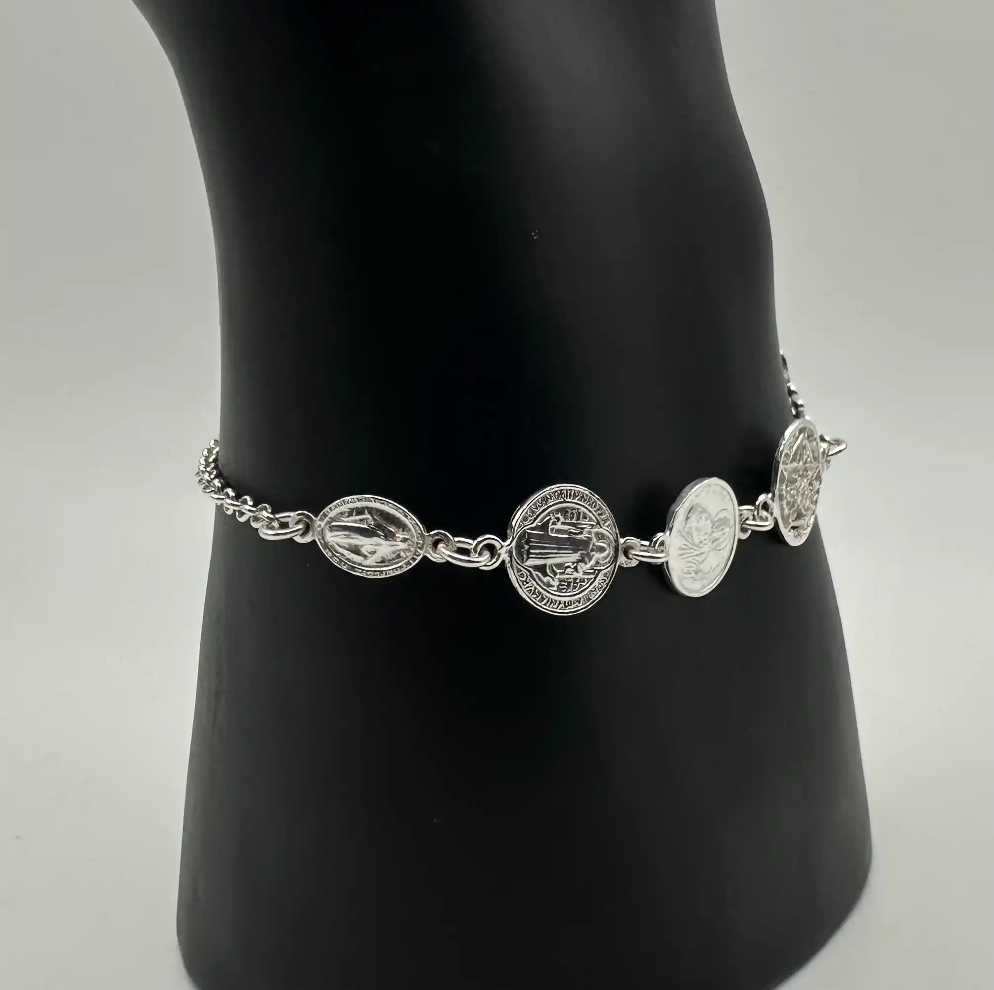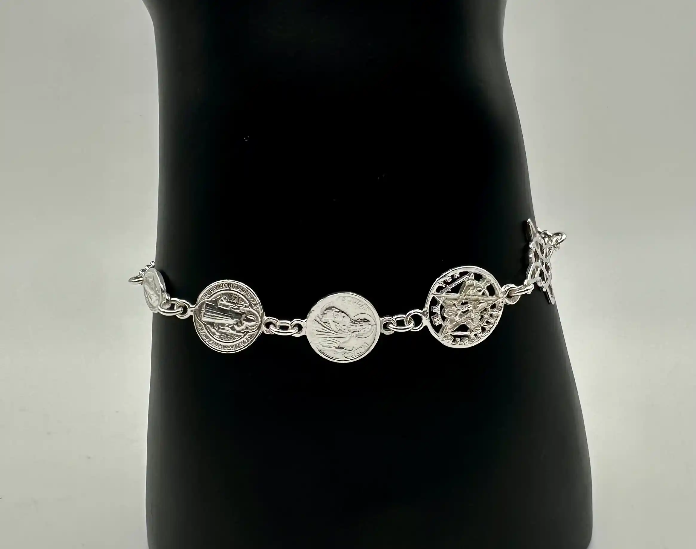 El Nudo de Bruja es un amuleto celta que simboliza la unión, la protección y el ciclo de la vida, diseñado para resguardar de energías negativas. El Tetragramatón es un talismán de protección muy antiguo que representa la unión de los cuatro elementos y protege contra todo tipo de negatividad y brujería. San Judas Tadeo es el santo patrón de las causas perdidas, y se le invoca en situaciones difíciles o desesperadas. San Benito es conocido por su medalla, utilizada como un poderoso amuleto para alejar el mal, la envidia, las enfermedades y para dar protección espiritual. La Milagrosa se refiere comúnmente a la medalla de la Virgen de la Medalla Milagrosa, que simboliza la intercesión de la Virgen María y se utiliza para pedir su ayuda en momentos de necesidad, como protección y gracias.
