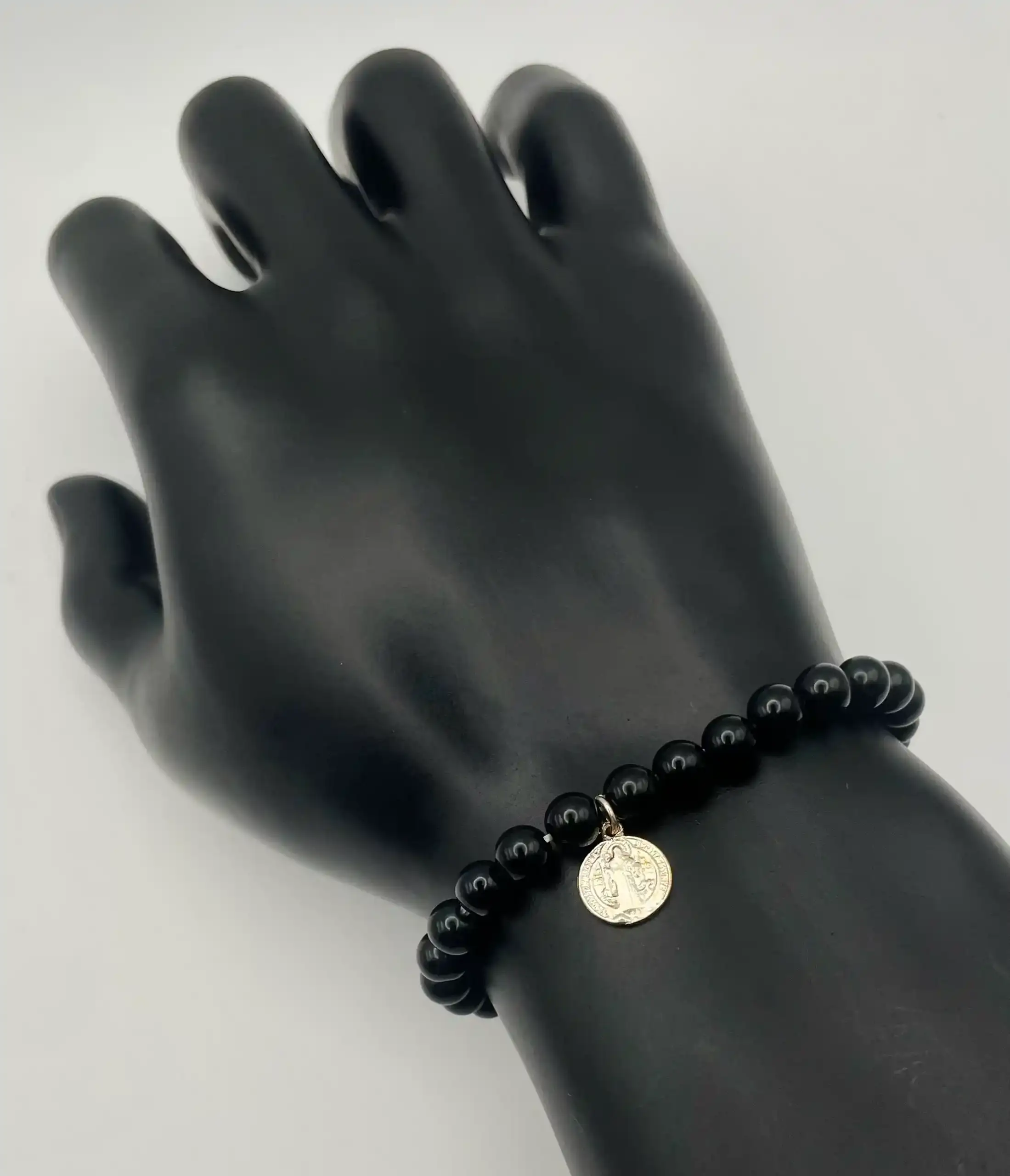 Pulsera de minerales con protección medalla de San Benito en plata de ley.