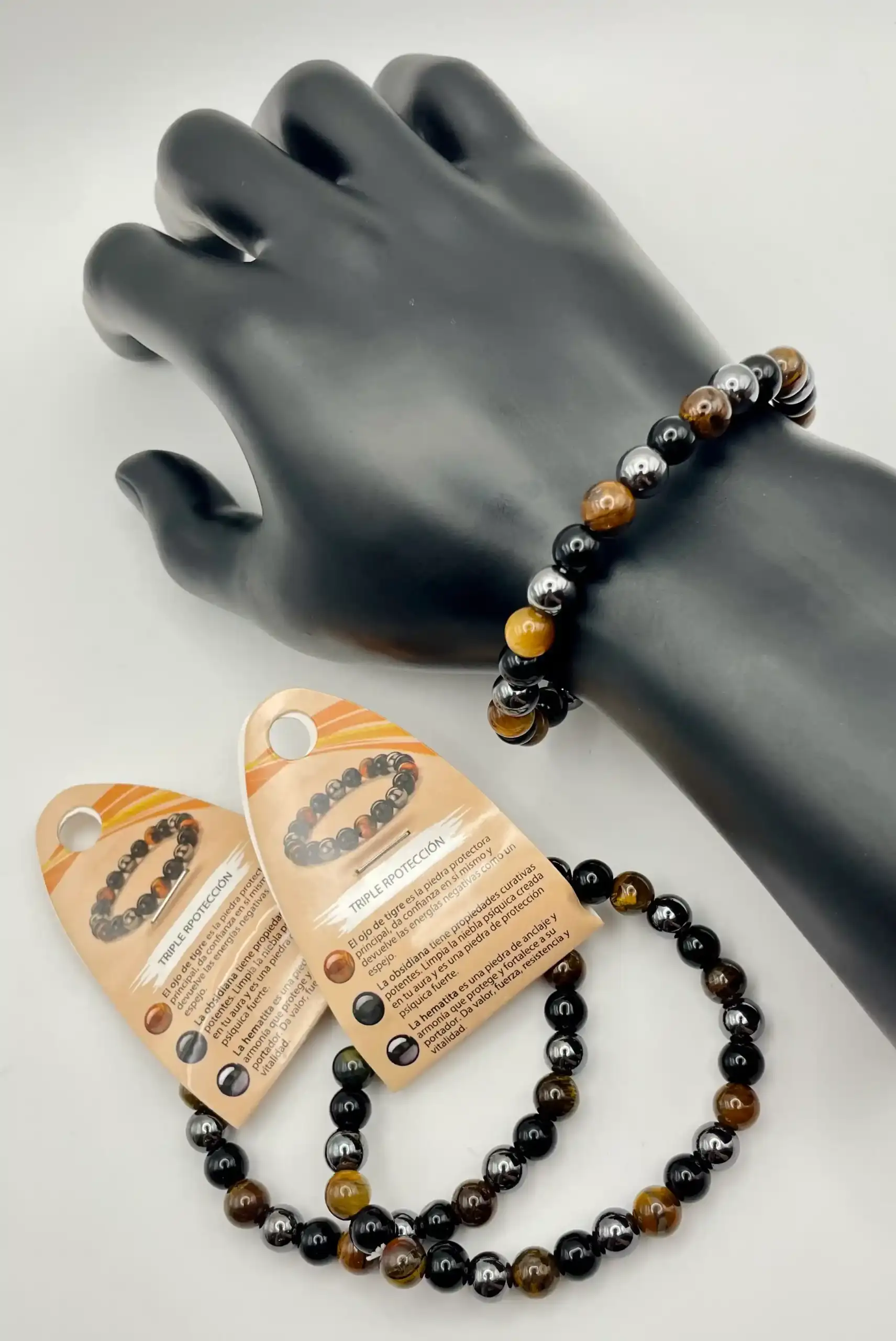 Pulsera Triple Proteccion 8mm Para Hombre Obsidiana